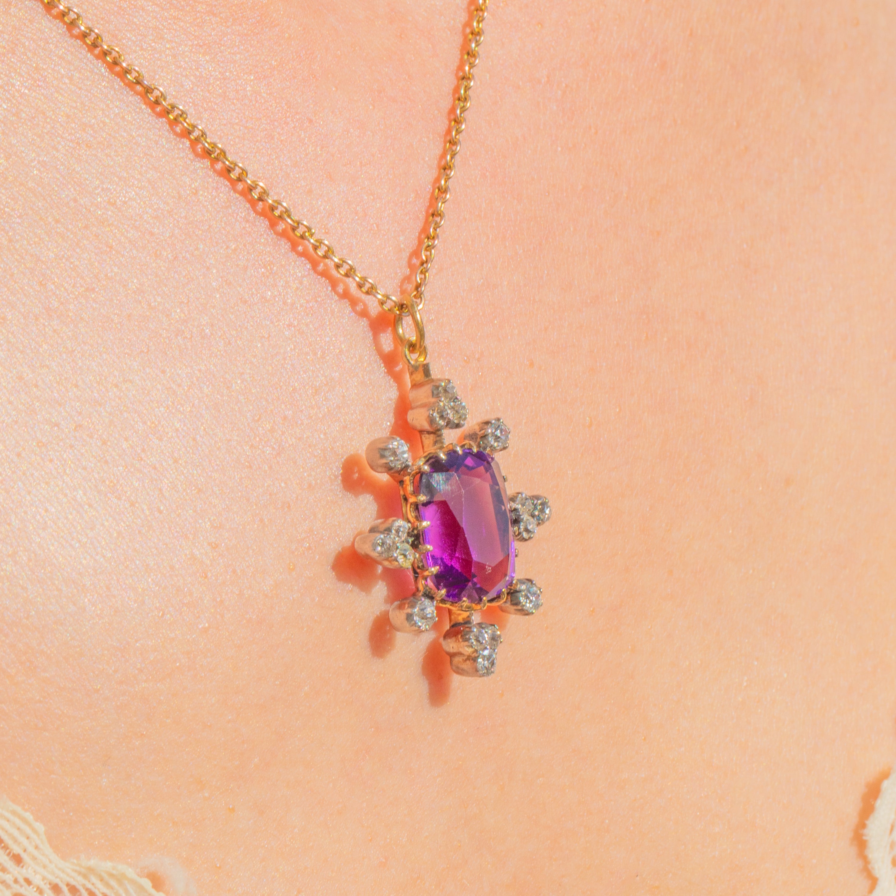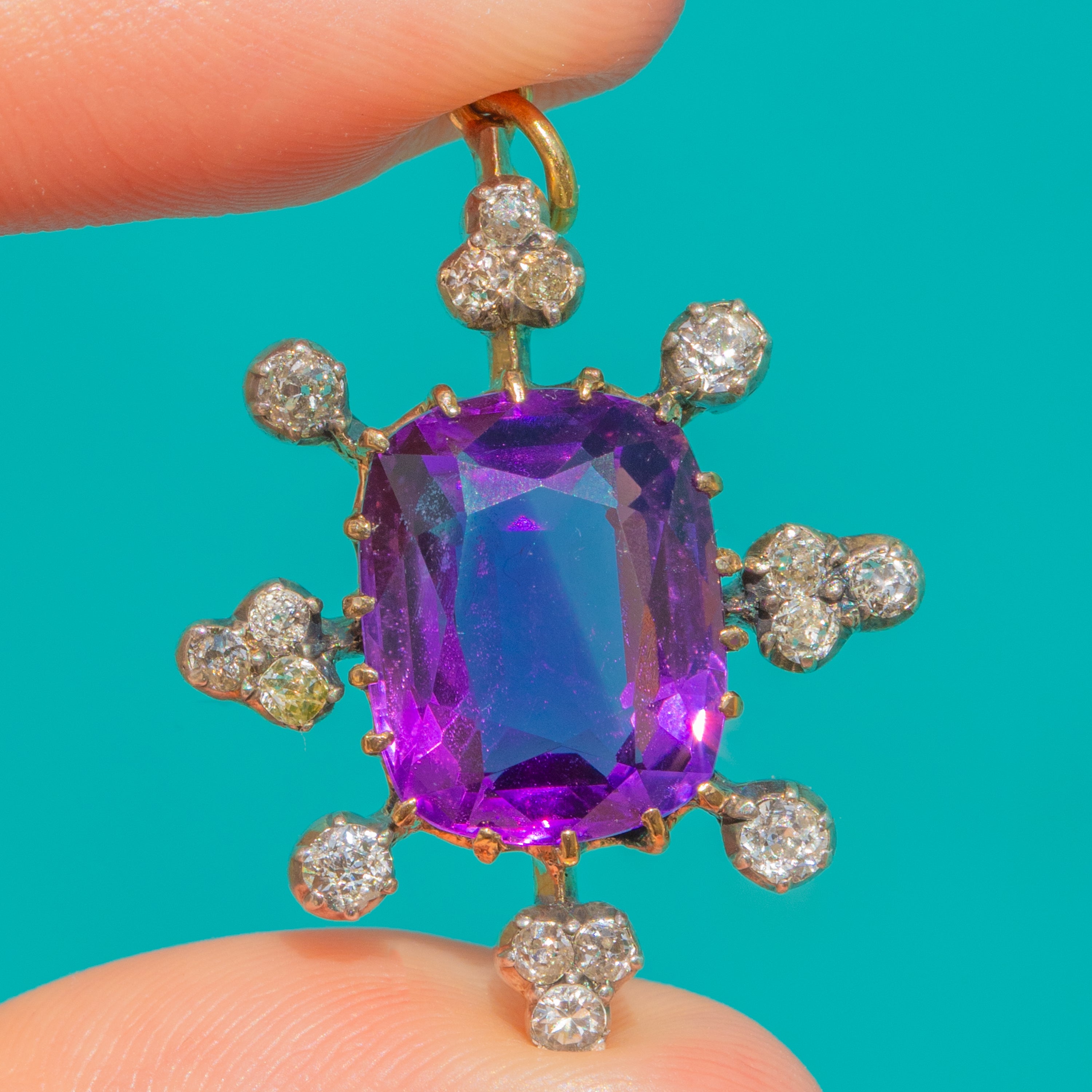 EXCELLENT: The Amethyst and Diamonds are bright and lively with no obvious chips or abrasions, showing only minimal age-related facet wear. The settings are secure, with intact prongs/collets and light surface wear to the Gold; minor tool/solder marks are consistent with Victorian handcraftsmanship. Overall, the pendant has been well cared for and presents beautifully.