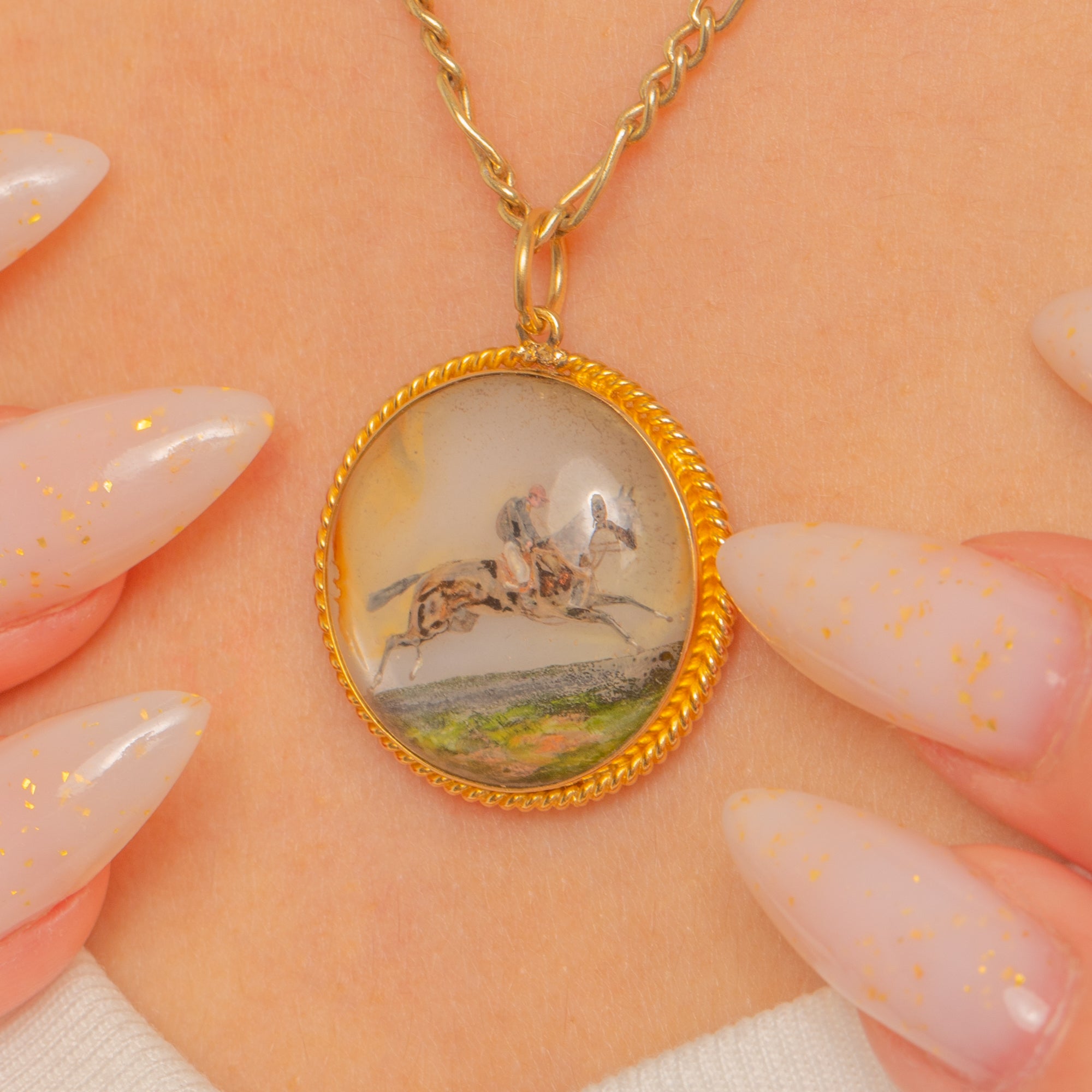 A charming Victorian equestrian Essex Crystal pendant, finely reverse painted to depict a jockey mid-gallop. The miniature comes alive beneath the domed crystal, its depth enhanced by a luminous Mother of Pearl backing that adds a soft iridescence and a sense of motion to the scene.