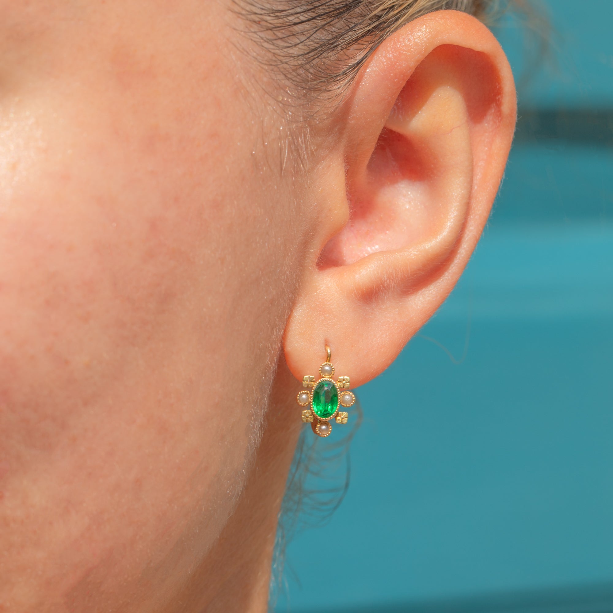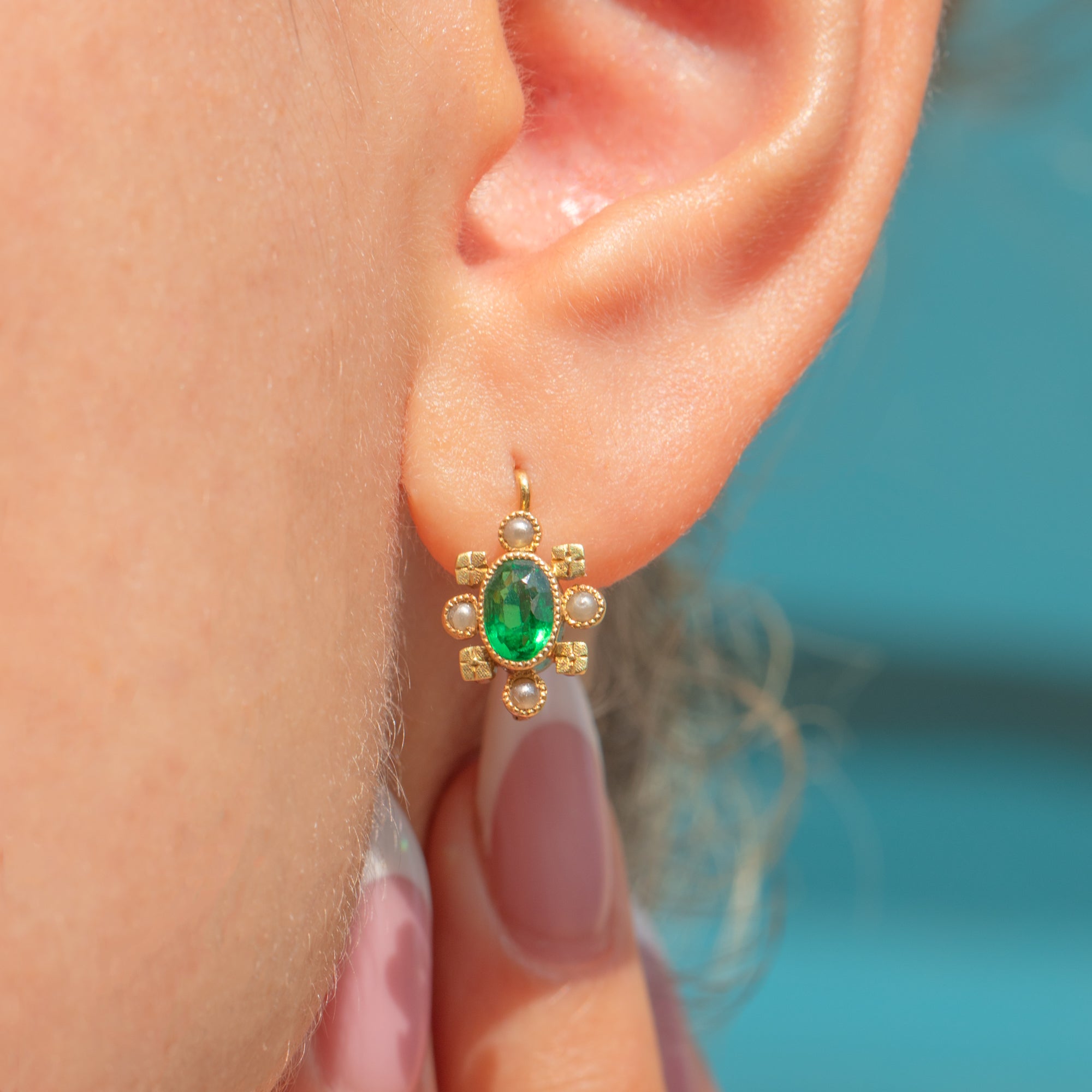 These Belle Époque earrings are a refined example of early 20th-century French design, crafted in 18ct Gold with elegant lever-back clasps. Each earring features a luminous central green Paste, encircled by lustrous Pearls and complete with ornate floral motifs.