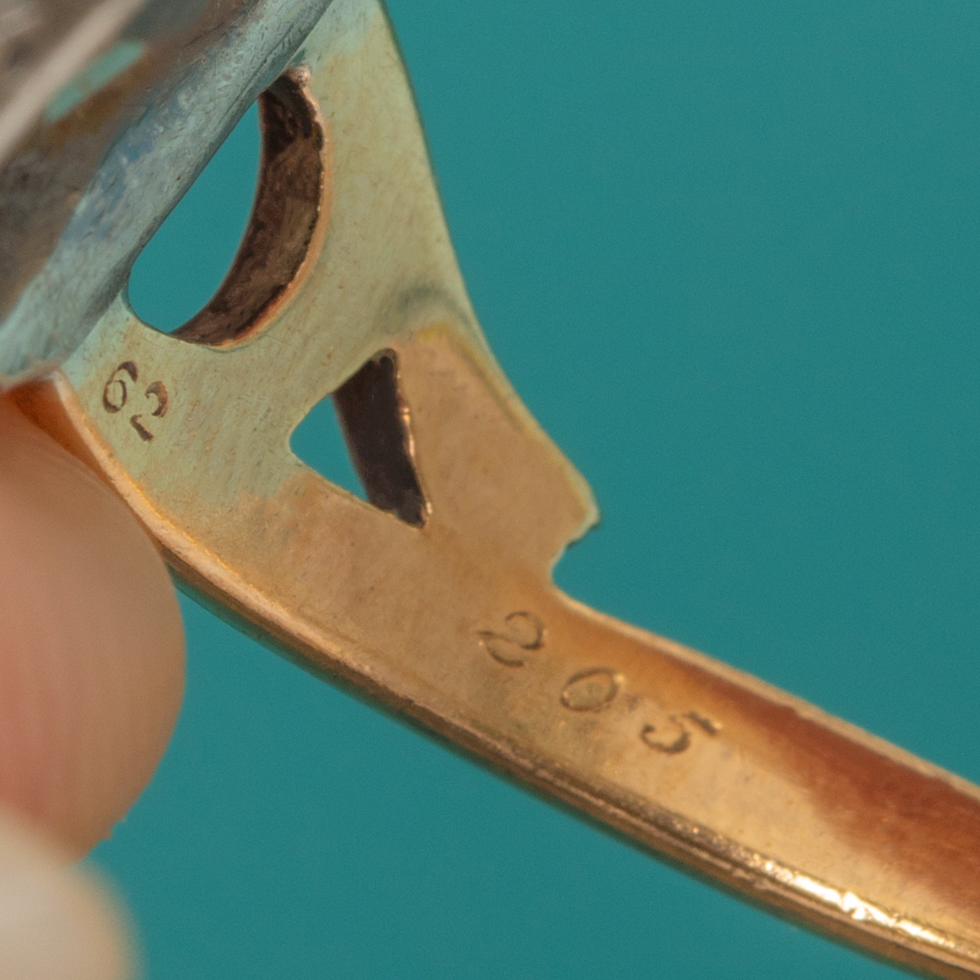 Elegantly split, pierced shoulders with dark navette accents lead to a pretty under-gallery, lending lightness and intricacy to the head. Stamped with the French Eagle’s Head and set with an Aquamarine of approximately 1.80cts, this antique jewel offers that effortless, softly-sparkling charm we love from the turn of the century.