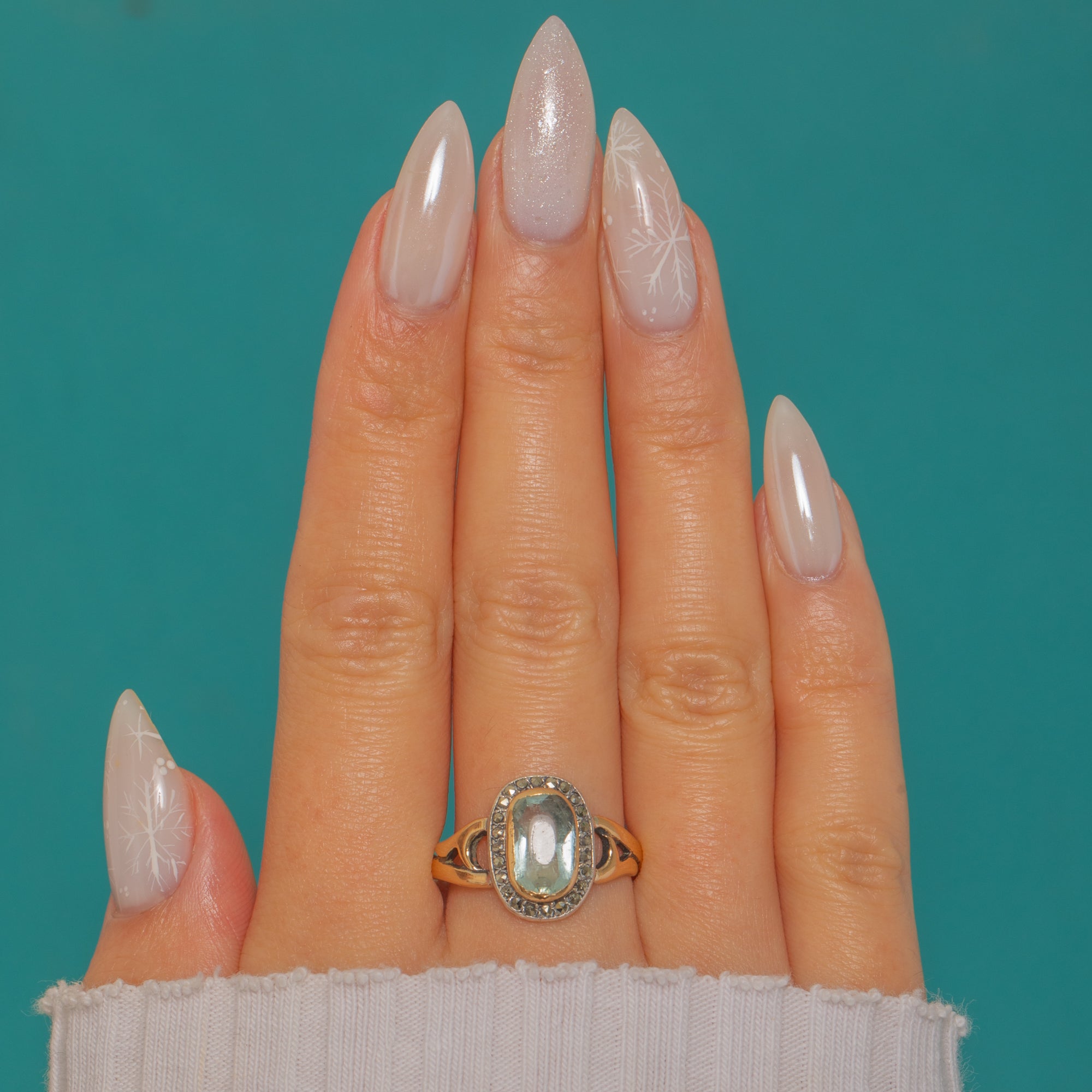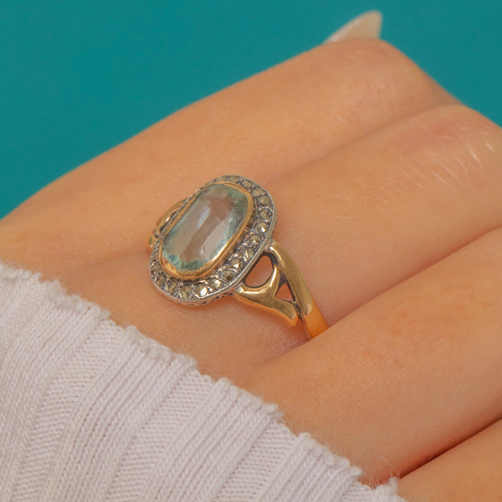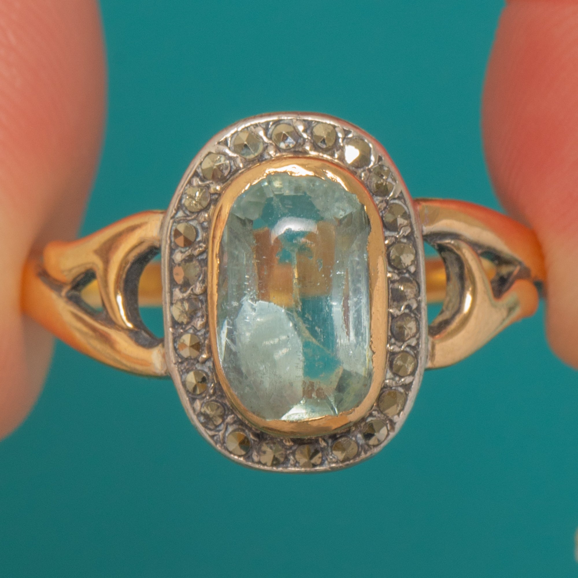 A refined French Art Nouveau cluster ring in 18ct Gold, set with a luminous pale Aquamarine in a smooth rubover collet and framed by a halo of glinting Marcasites with delicate milgrain detail. The white-toned halo plays beautifully against the warm Gold, creating a crisp two-tone effect that feels both romantic and poised.