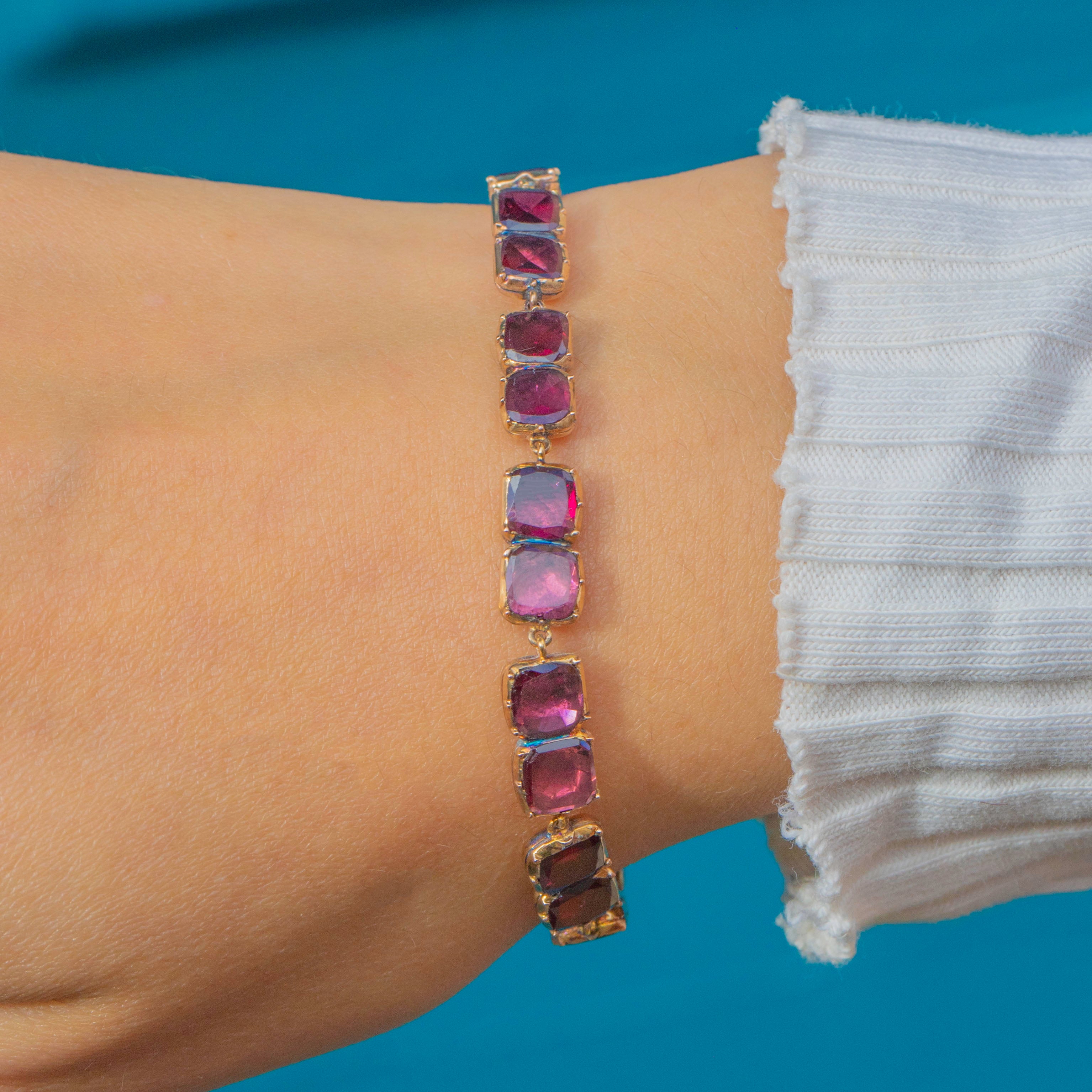 A beautiful Georgian bracelet crafted in 15ct Gold, set with a continuous row of foiled flat-cut Garnets. The stones glow with a rich, velvety red tone and subtle inner light, a hallmark of Georgian craftsmanship. Each Garnet is individually hand-set in traditional piecrust settings with closed-backs providing comfortable wear.
