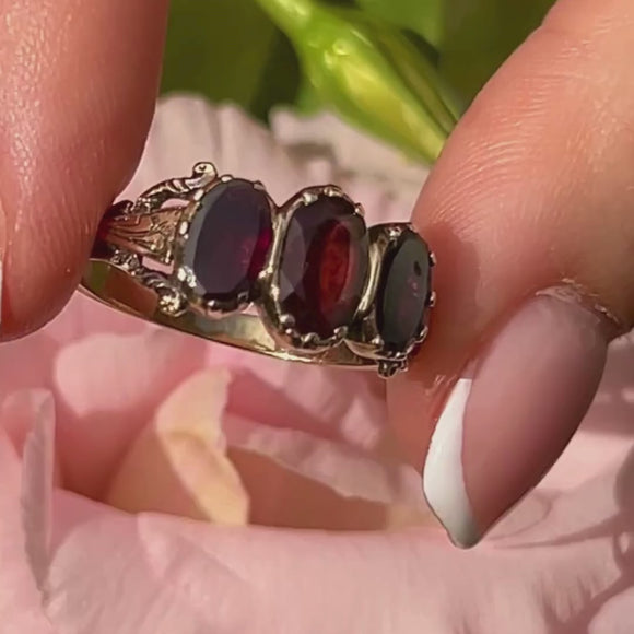 This delectable Georgian 15ct Gold Flat-Cut Garnet ring was made for adoration! Three deep-red wine Garnets are poised centre stage, with flickers of light beaming from their flat-cut facets.