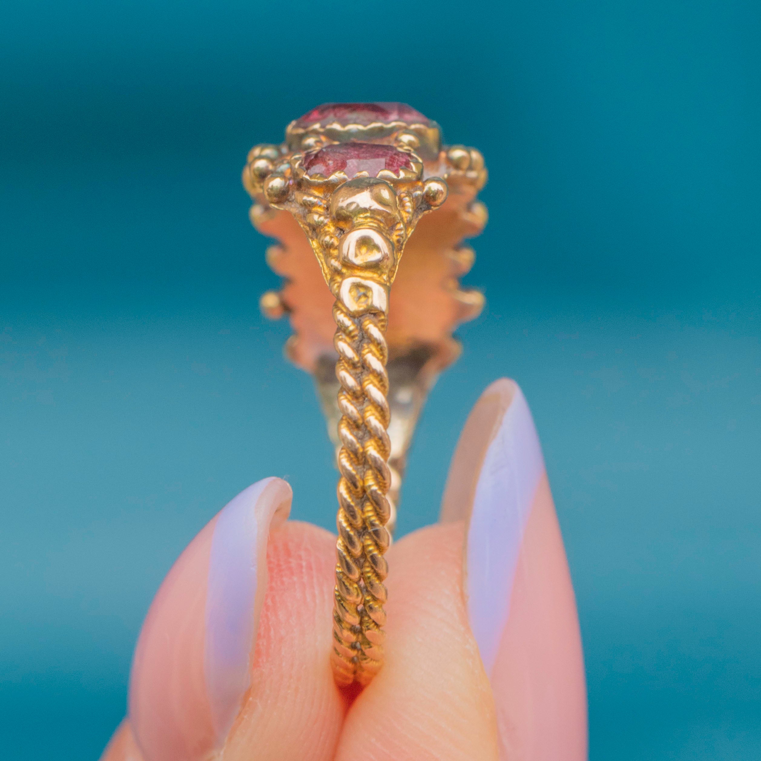 GOOD: This Georgian 15ct Gold Foiled Amethyst five stone ring is in good condition, especially considering her grand age. The Amethysts, although they have some wear to them, are set securely and foiled beautifully, a wonderful sight. The 15ct Gold is brightly saturated, and while one of the beaded details is missing, this does not affect the overall impact on the piece. Her twisted rope band has slightly warped, however, she still sits flush on the finger. At over 200 years old, this Georgian ring can be enjoyed straight from its box!