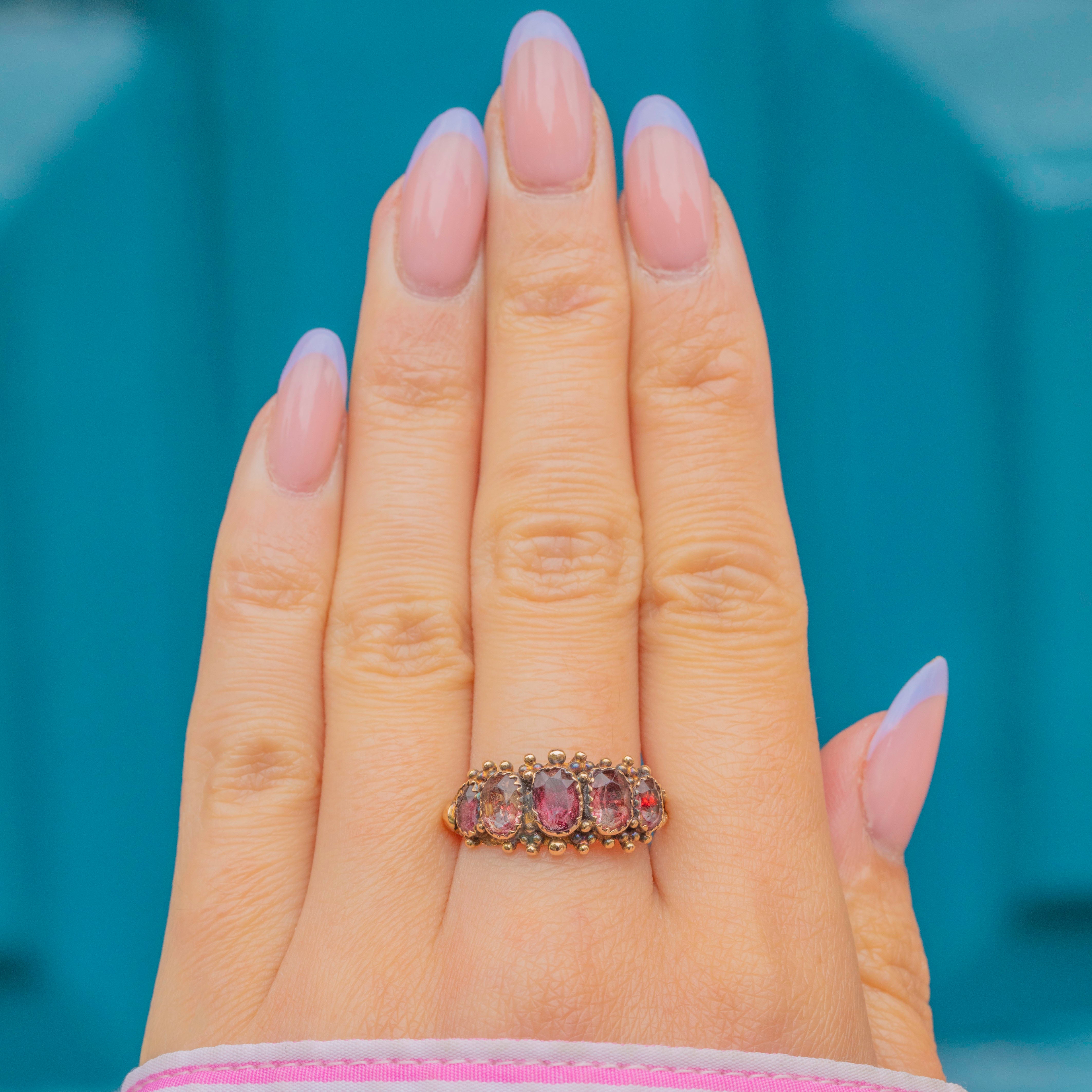 We adore the design of this Georgian 15ct Gold foiled Amethyst five stone ring- which is quintessentially Georgian in design!