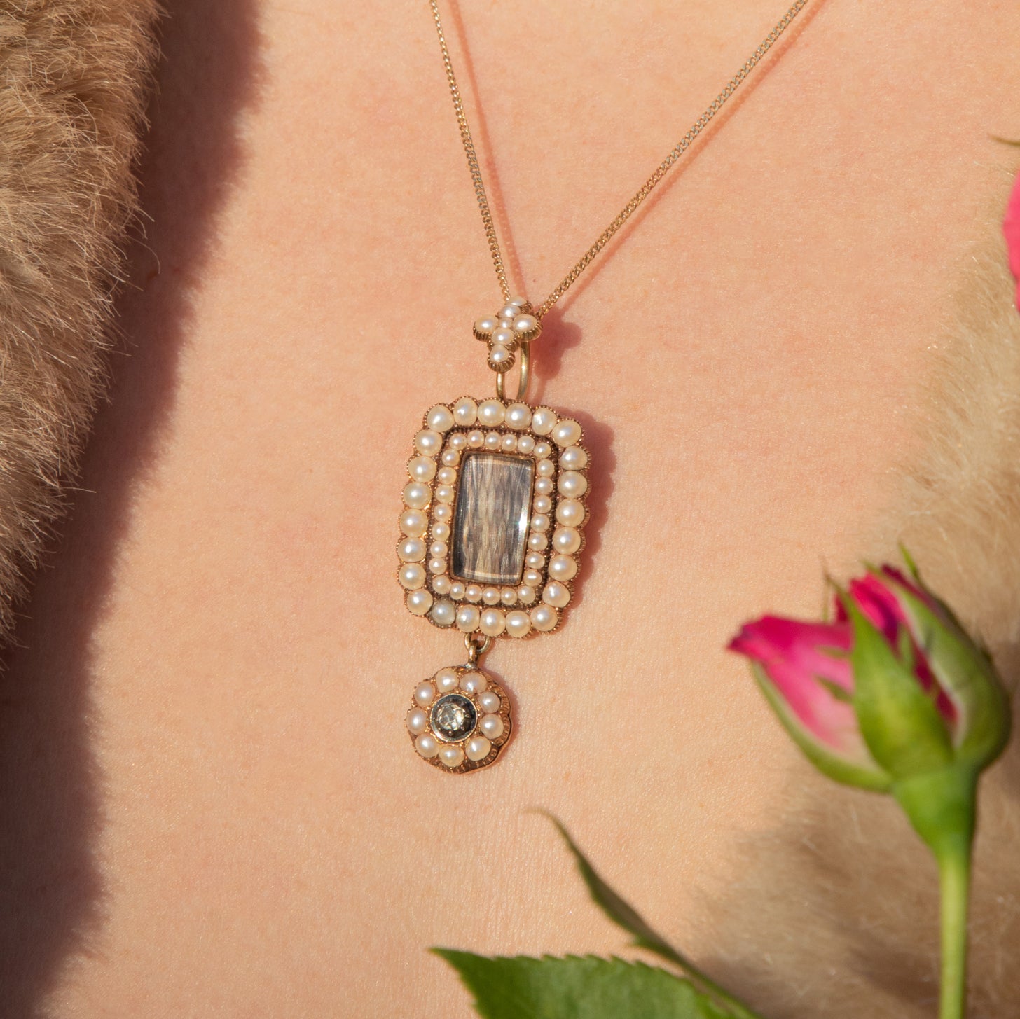 EXCELLENT. This Georgian 15ct Gold Pearl cluster Diamond pendant is in excellent condition. Her Pearl double border cluster, bale and flower cluster drop are all in fine order. There is still a lovely lustre to all the Pearls, which are all securely set with no blistering or damage to note. The professionally woven hair work has stood the test of time brilliantly, and hasn't budged from place. The Gold settings and backs are smooth to touch with no dings to note, which is just amazing! Her Diamond is set securely, and the lovely original Georgian crimped settings are perfect. The accompanying antique box is all in fine order, and is full of history. There is some light surface wear to the outer body of the box, but it is still pretty, and protects the jewellery inside. All in all, her excellent condition make this an extremely rare find!