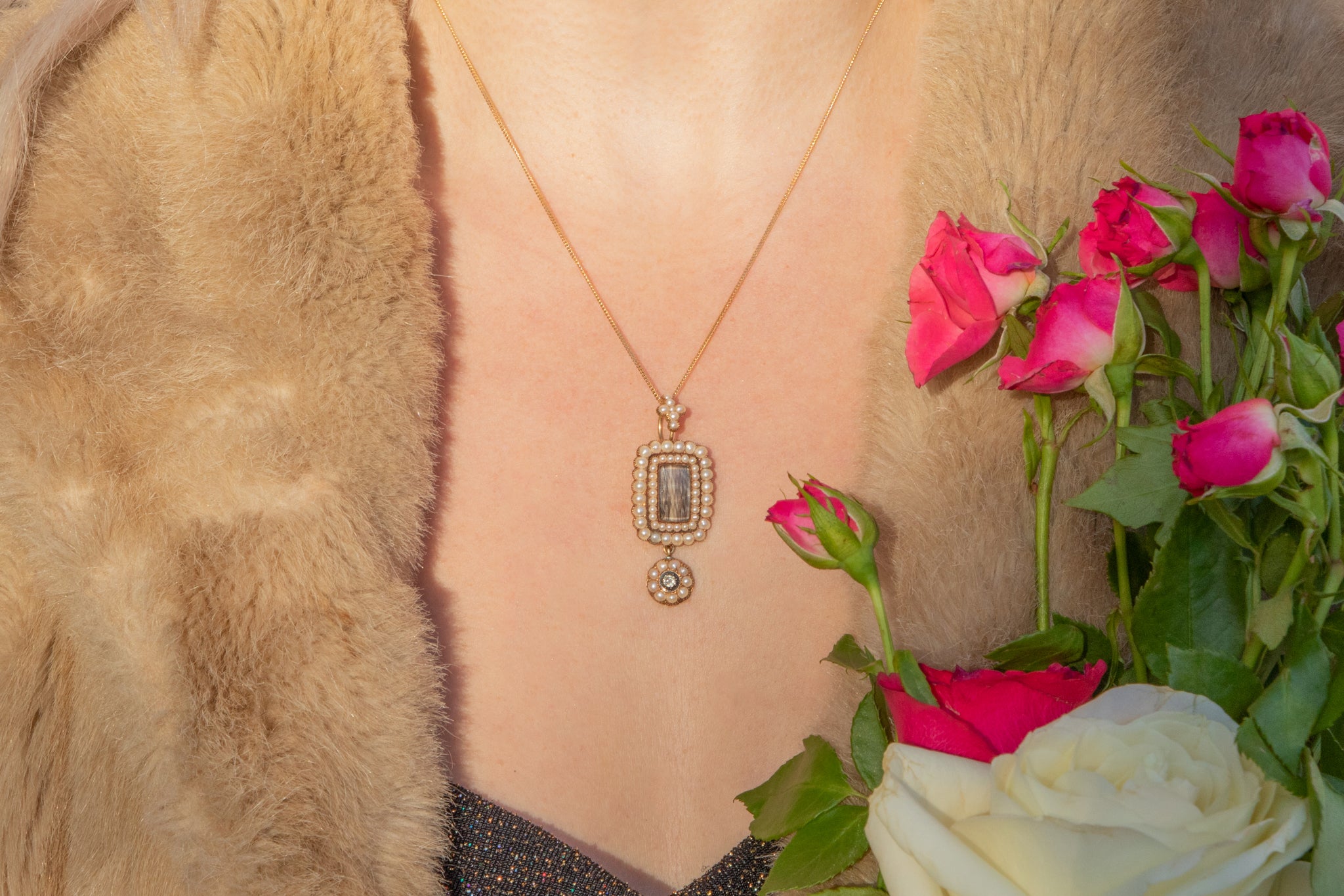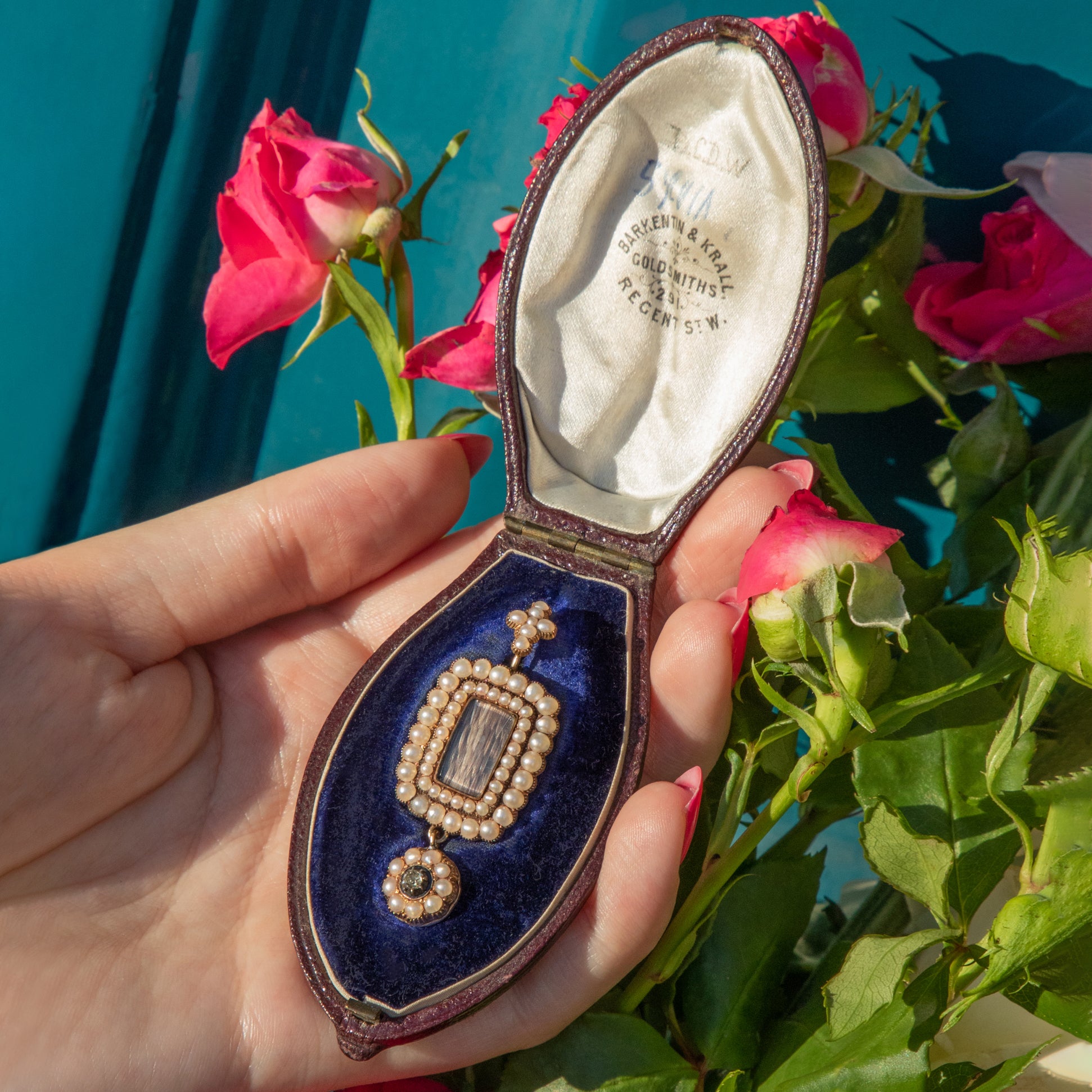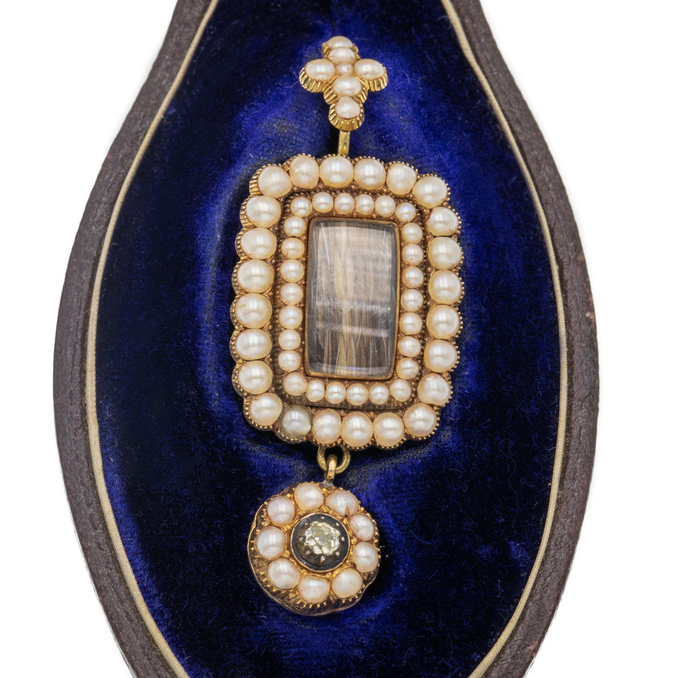 MATERIALS: 15ct Gold, Sterling Silver settings, Pearl, old mine-cut Diamond, woven hair work, brown faux Leather, indigo Velvet & Satin box innards.