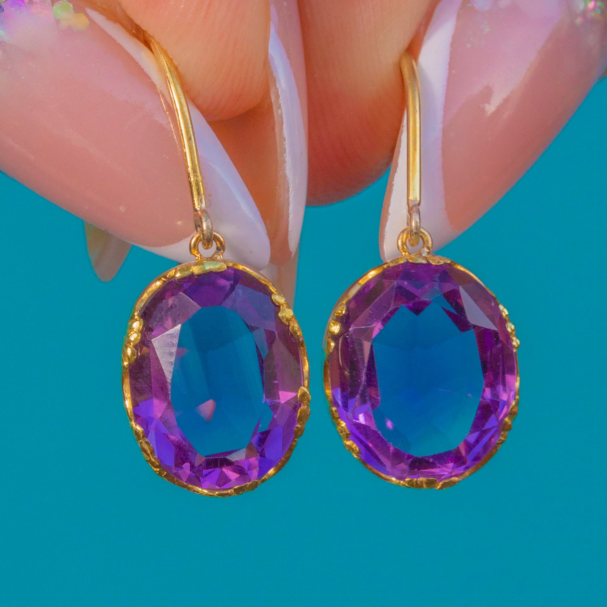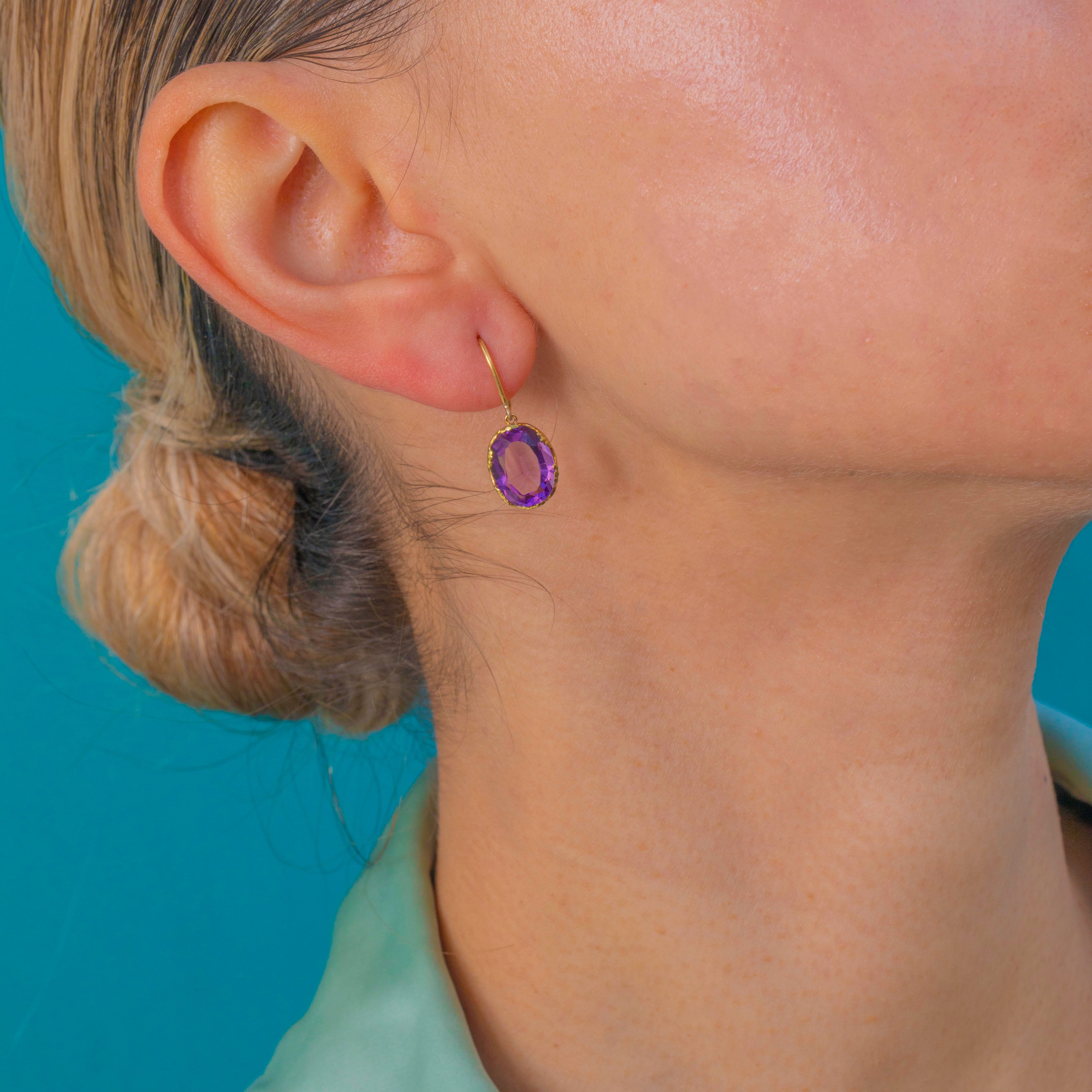 These dainty Georgian Amethyst drop earrings are beautifully elegant, showcasing soft lavender-hued gemstones in warm 18ct Gold settings. The Amethysts are bright and well-proportioned, with that lovely gentle glow characteristic of early 19th-century stones.