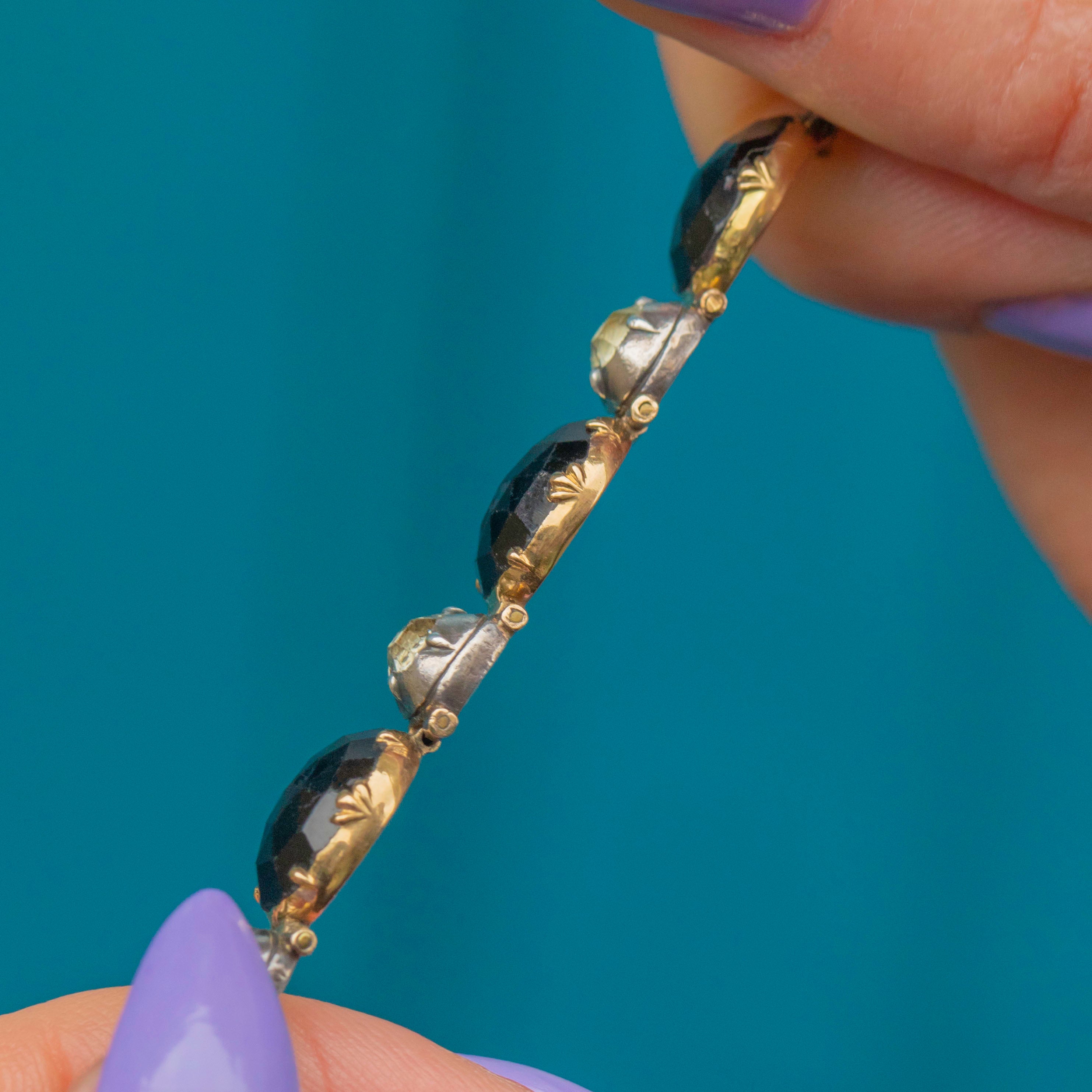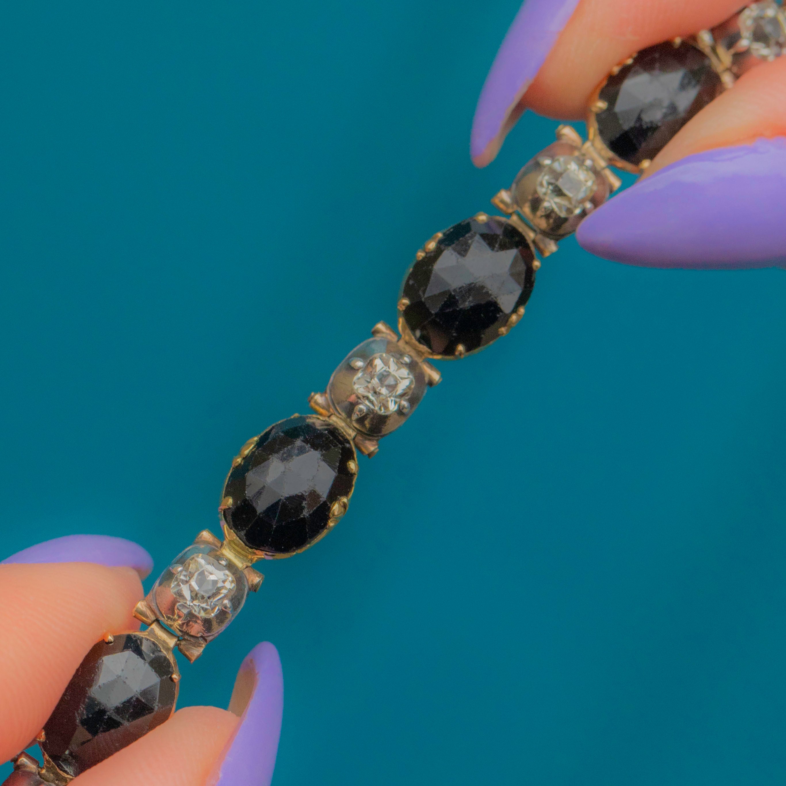 VERY GOOD: This stunning Georgian 18ct Gold French Jet bracelet is in very good condition. The gemstones are all present and securely set, with only some minor fleabites commensurate with age. The Gold is bright and buttery, and the Silver is lustrous with a light patina accrued over the years, adding to its antique charm. With each link securely connected and the clasp in fine working condition, you can wear this Georgian bracelet with absolute confidence!