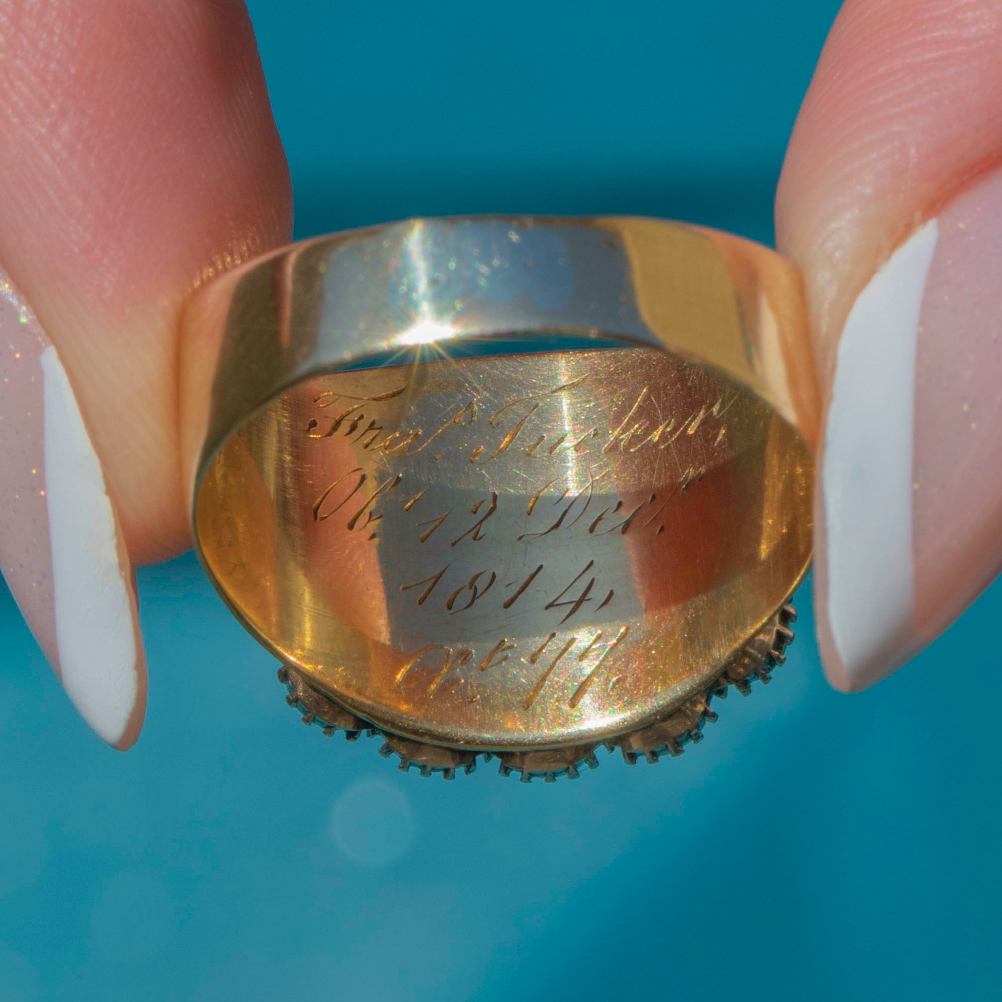 This Georgian 18ct Gold Garnet & Pearl cluster ring will make a striking statement. The ring boasts a brightly saturated 18ct Gold band with a high-shine polish that gleams in the light, and the inside is engraved with the inscription "Fra Tucker, OB: 12 Dec 1814, Age 77", adding to the ring's historical intrigue.