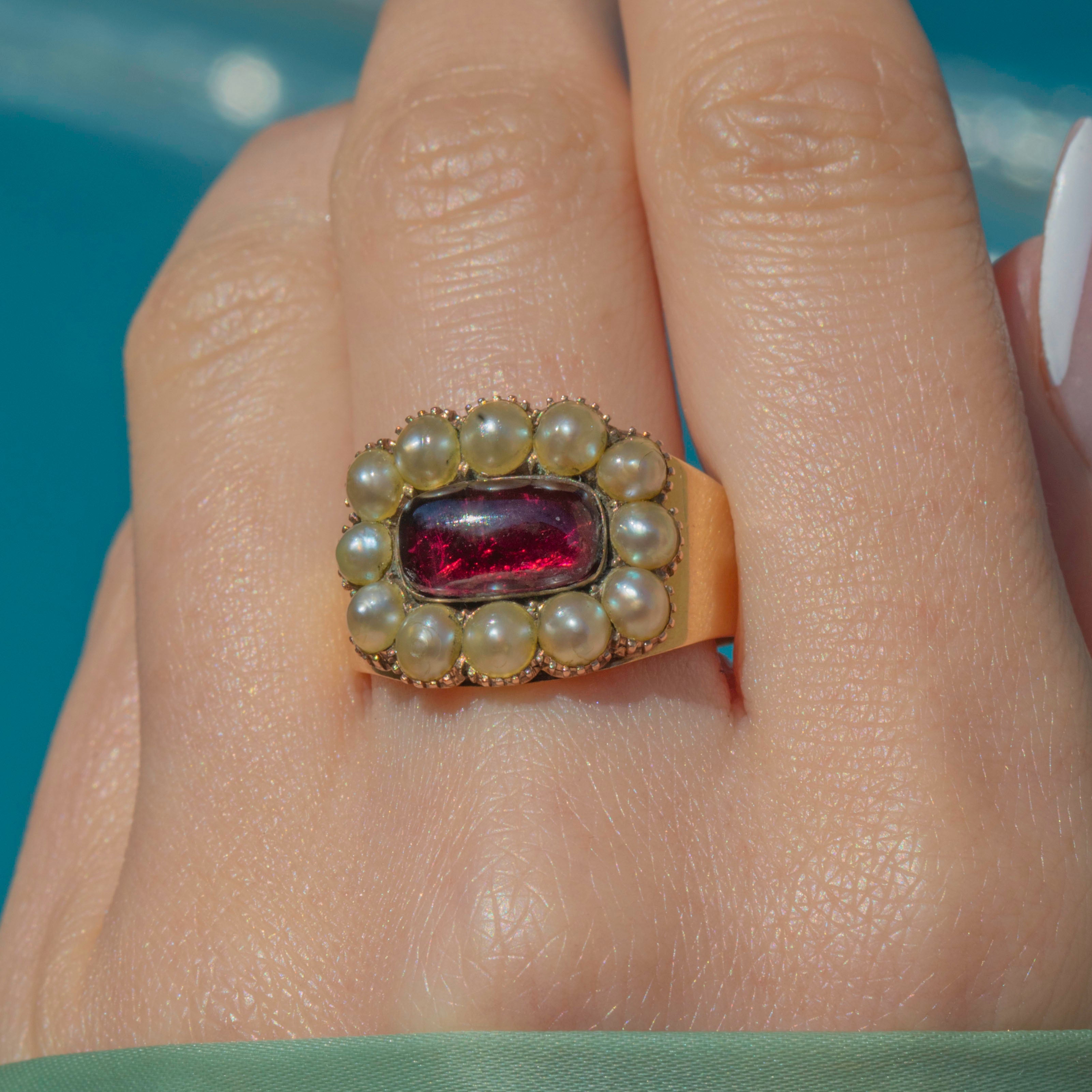 18ct Gold Georgian Garnet Cabochon Pearl Cluster Ring 1.60ct, c.1814 Item added