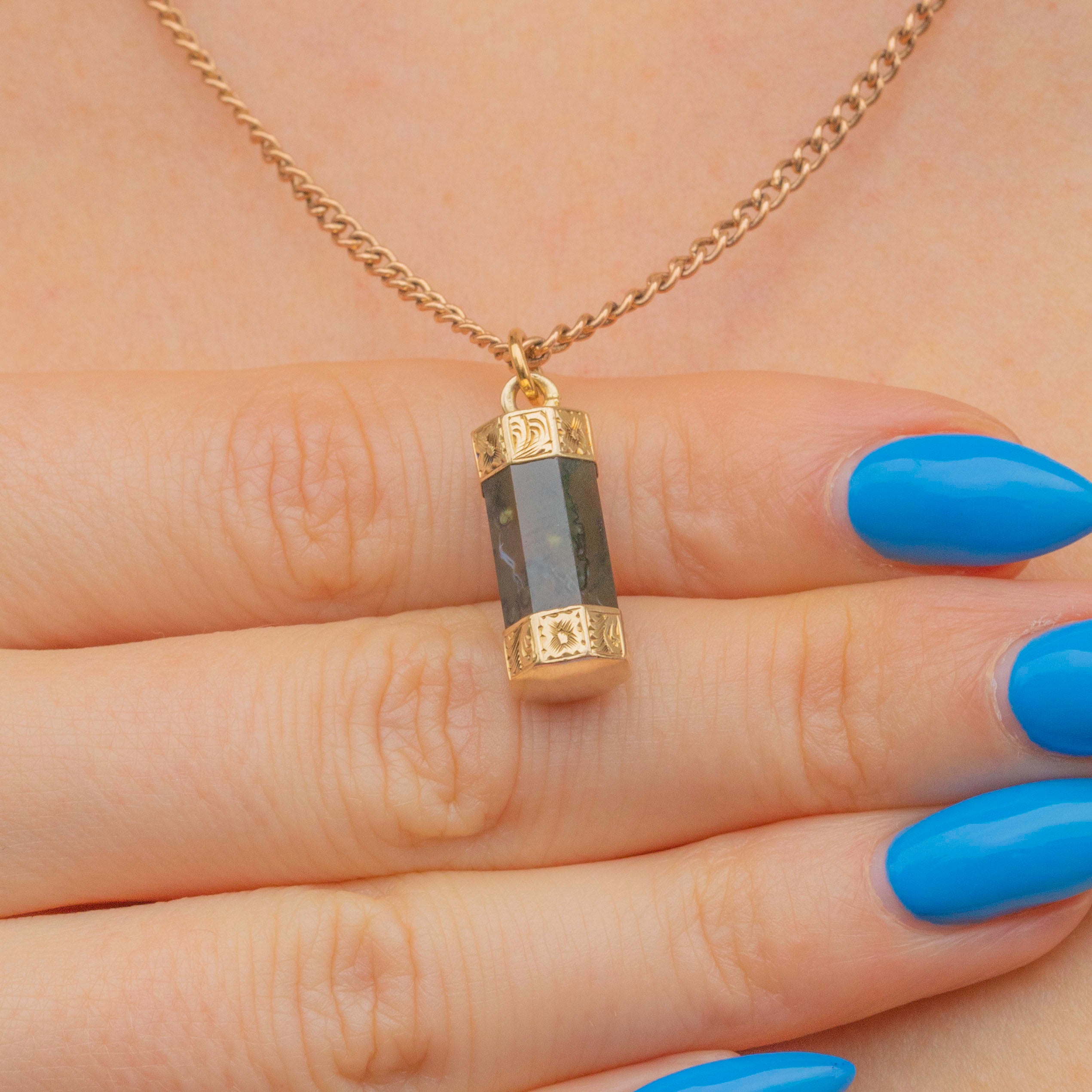This curious Georgian 9ct Gold Agate column pendant is bursting with dark, chocolatey-brown hues. Formed into an octagon shape, this pendant features beautifully crafted 9ct Gold settings on either side, adorned with intricate engraved panels.