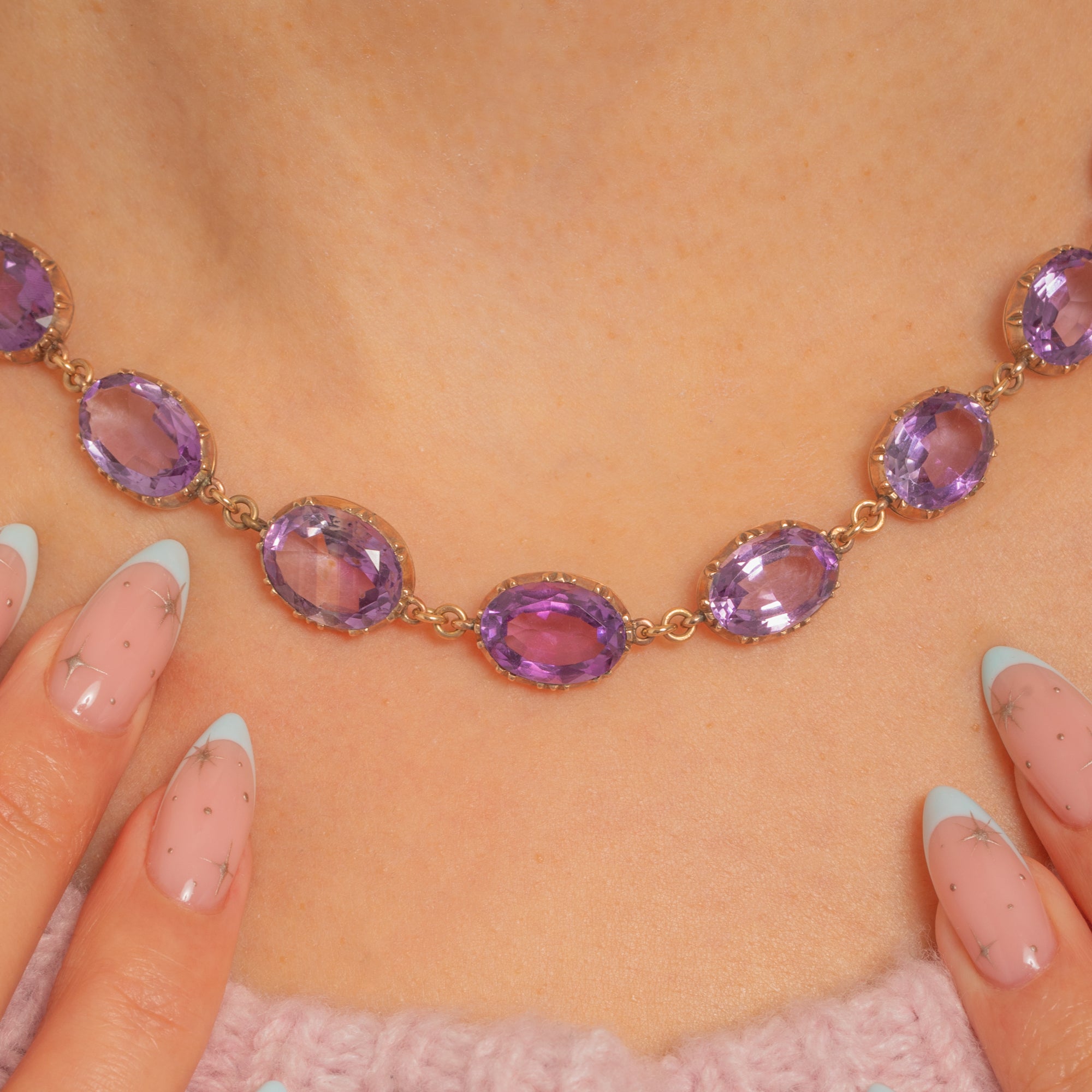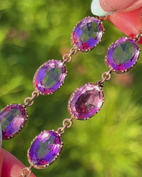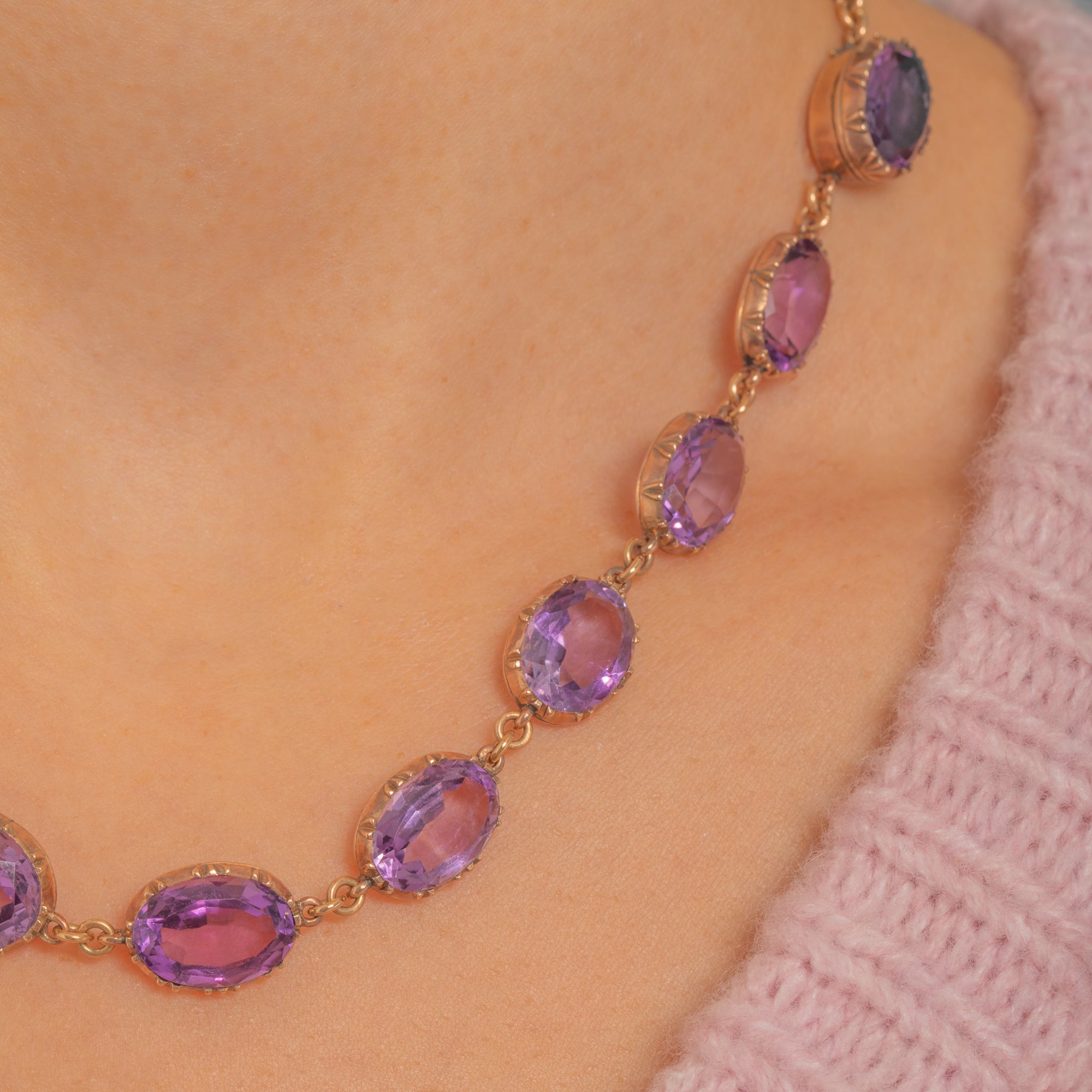 A luminous Georgian Amethyst rivière alive with rich, grape-coloured sparkle. Twenty oval Amethysts are set in crisp triple-claw, cut-down “pie-crust” collets of warm 9ct Gold, each articulated link flowing elegantly across the collarbone. The concealed clasp is cleverly integrated as a link, with the two clasp Amethysts traditionally closed-back and foiled for that soft inner glow beloved in early 19th-century jewels.