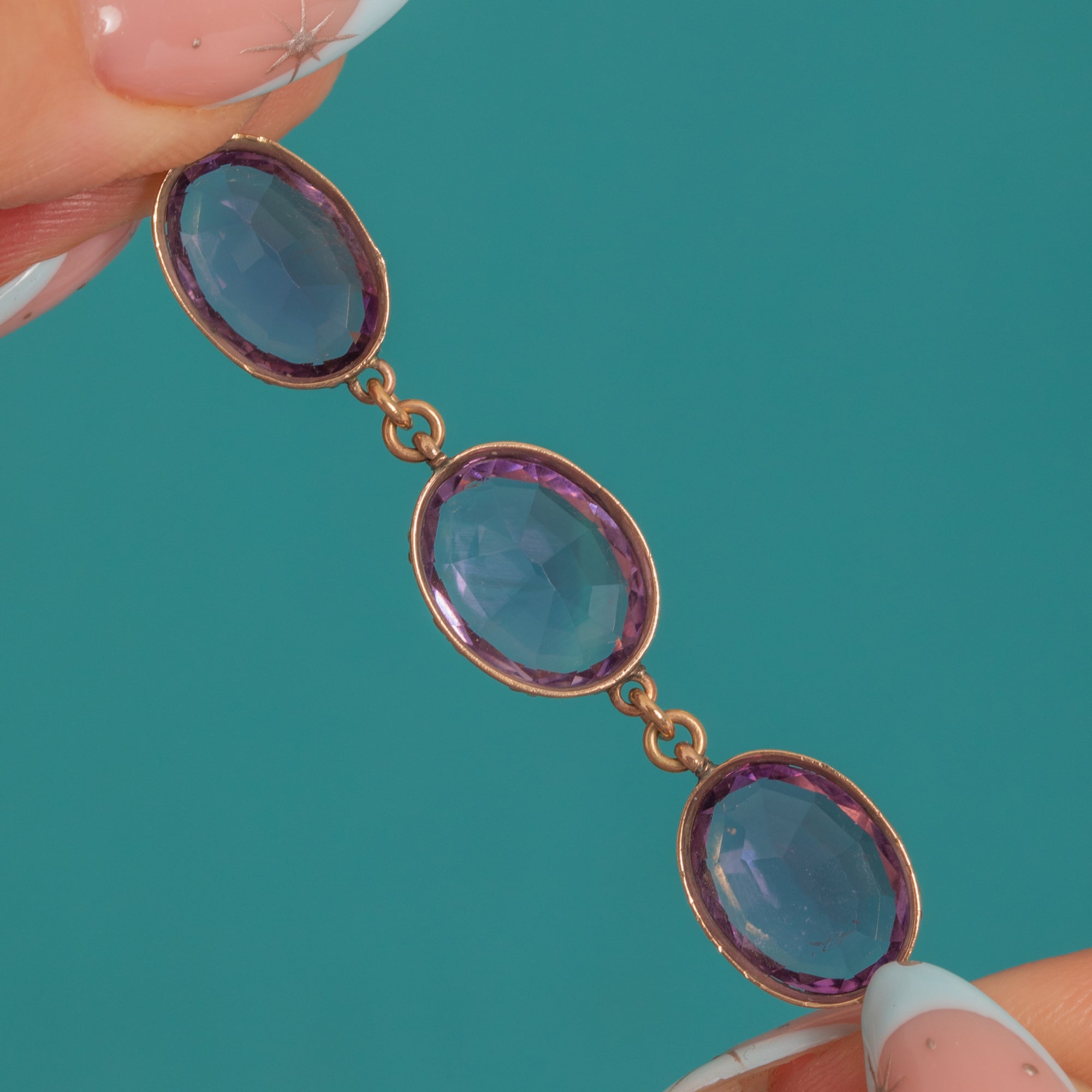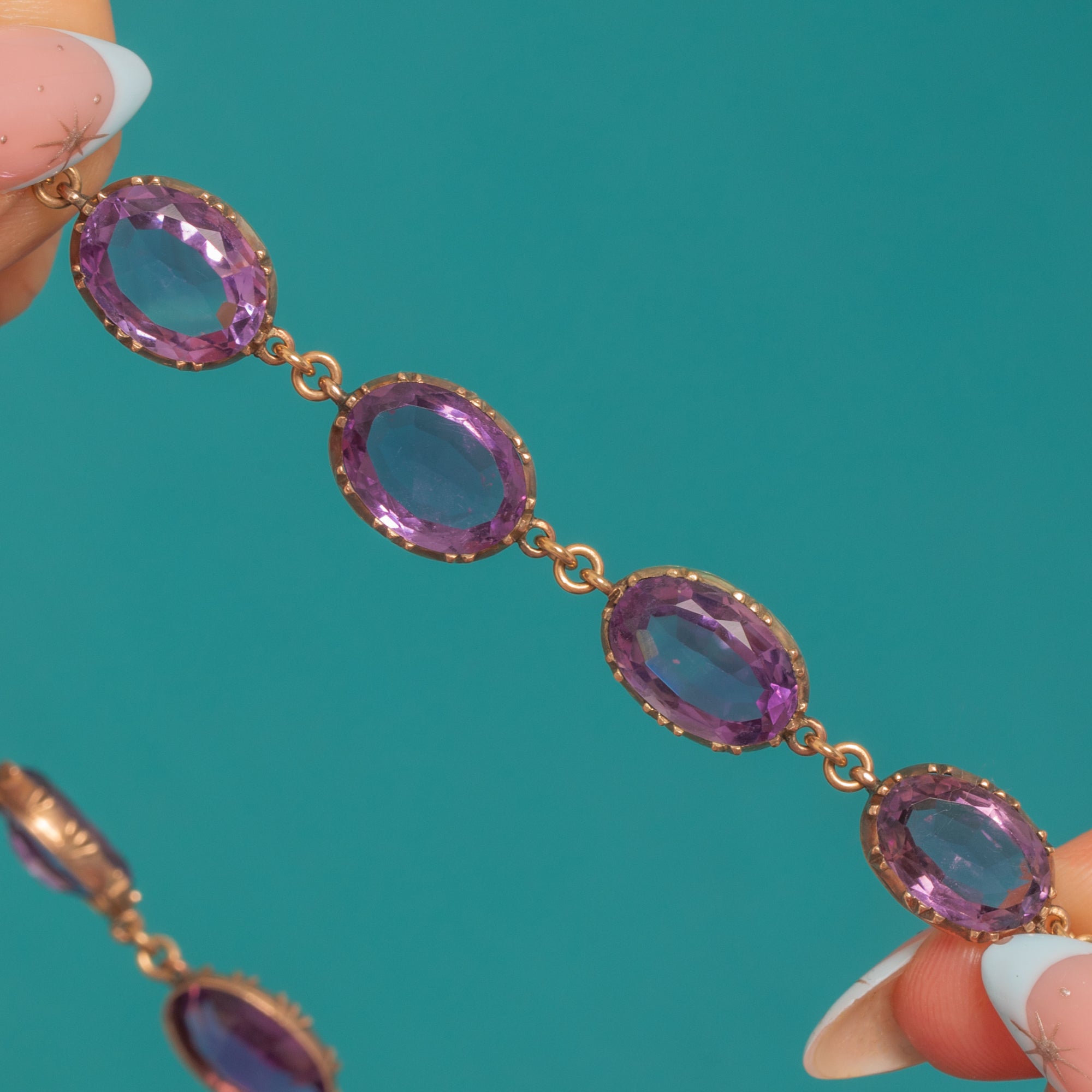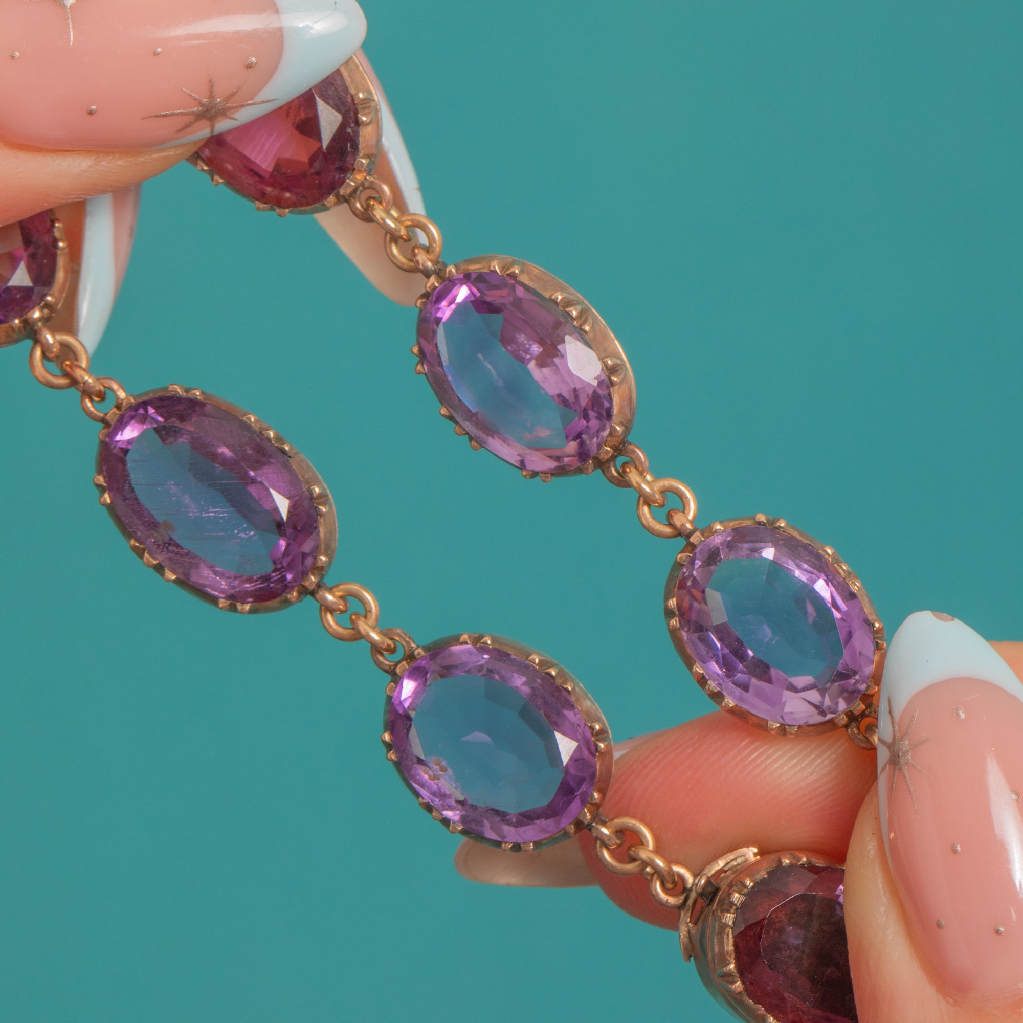 A luminous Georgian Amethyst rivière alive with rich, grape-coloured sparkle. Twenty oval Amethysts are set in crisp triple-claw, cut-down “pie-crust” collets of warm 9ct Gold, each articulated link flowing elegantly across the collarbone. The concealed clasp is cleverly integrated as a link, with the two clasp Amethysts traditionally closed-back and foiled for that soft inner glow beloved in early 19th-century jewels.