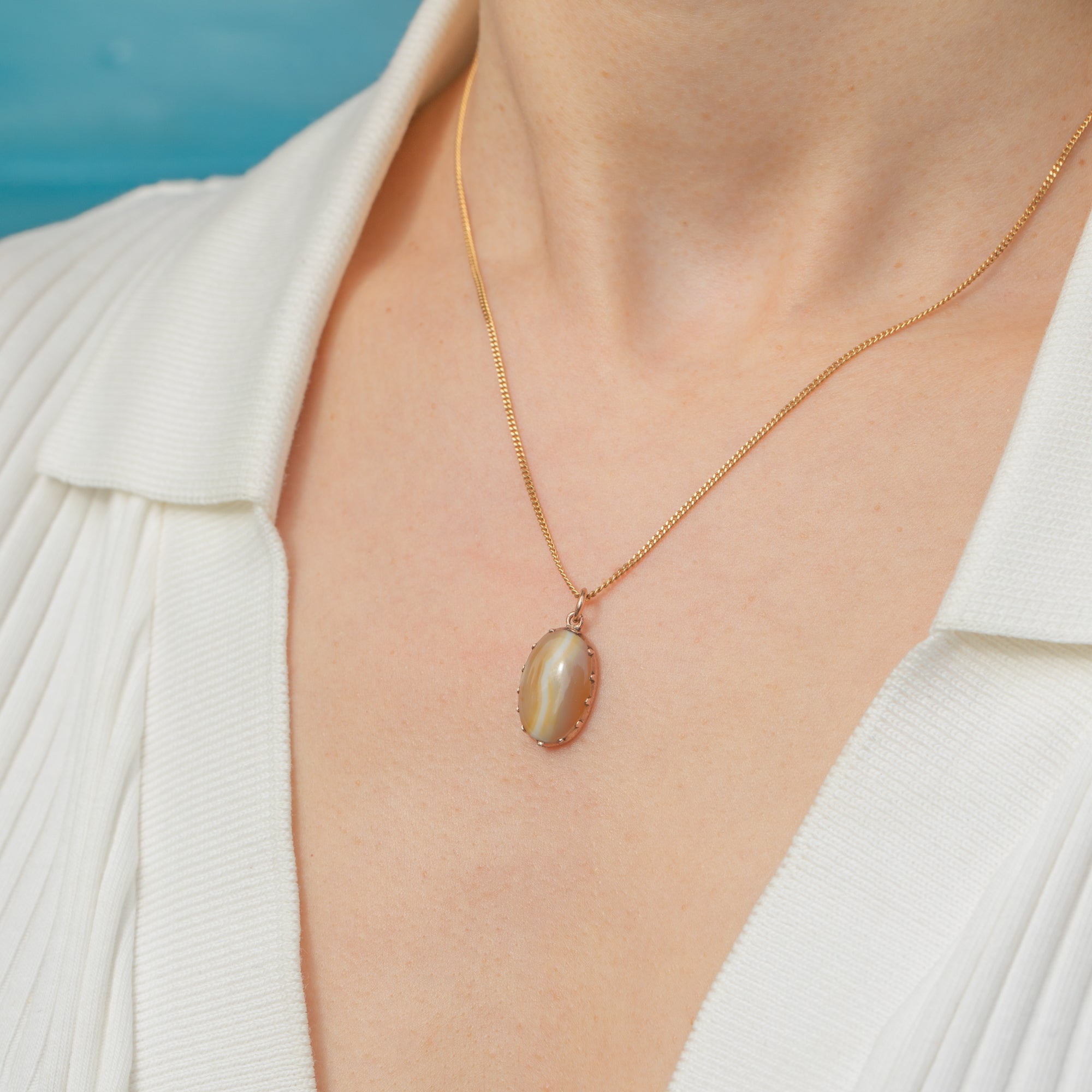 VERY GOOD-EXCELLENT: This Georgian 9ct Gold cased Agate charm is in lovely condition. The Agate is radiant and free from any scuffs or scratches. There is some light surface wear to the 9ct cased Gold setting, though this is minor and commensurate with age. With a secure jump ring, she can be worn with confidence!