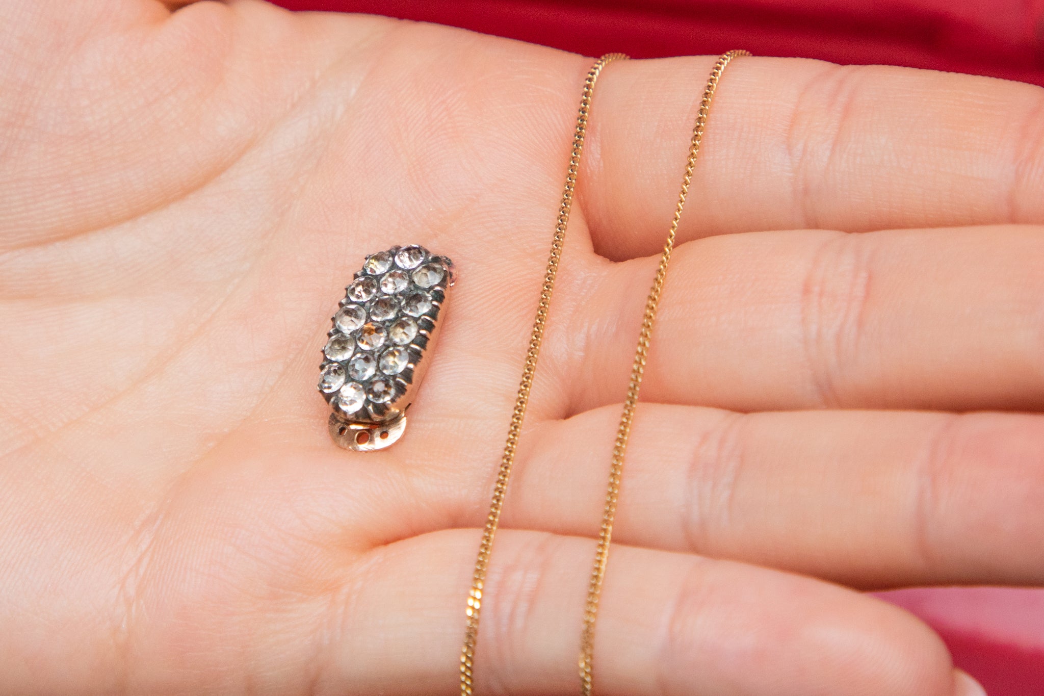 VERY GOOD. This Georgian 9ct Gold Diamond Paste clasp is in very good antique condition. Inlaid with twinkling Paste stones, her Gold remains glossy and free from dings or dents to note. There are some signs of subtle wear, but this is to be expected from an item of this age! The clasp mechanism, although slightly stiff, is in fine working order too.