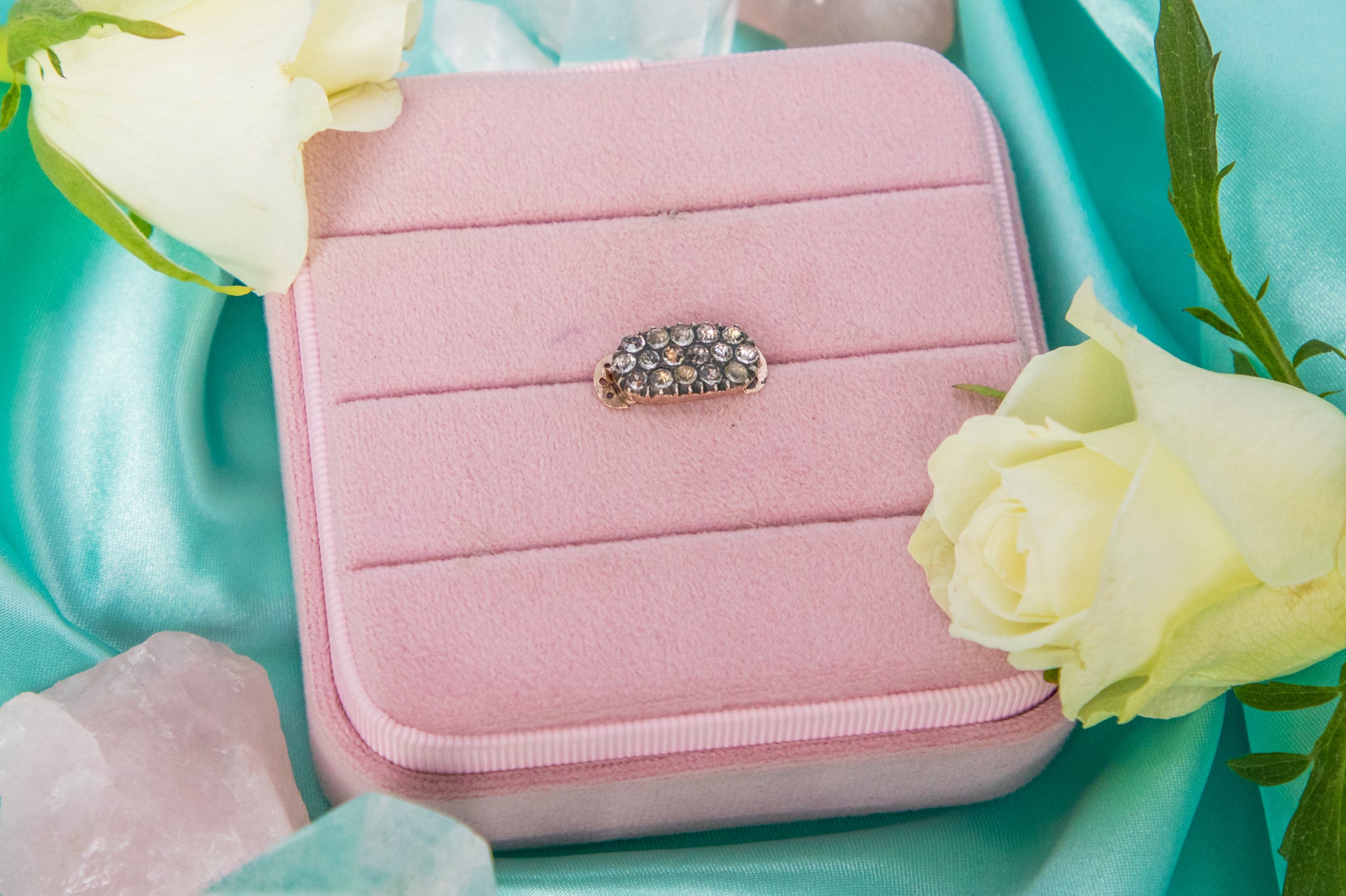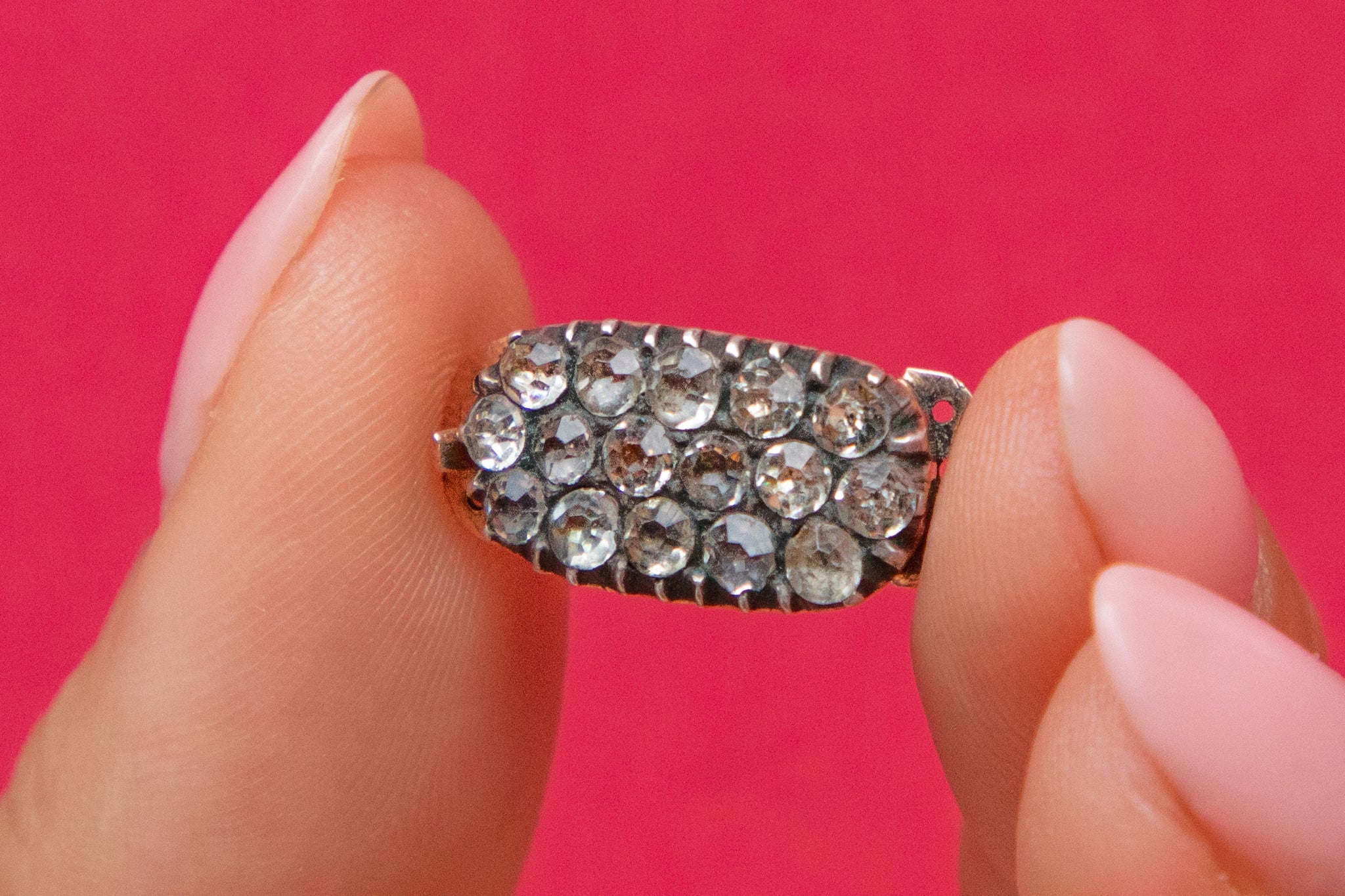 What an adorable Georgian 9ct Gold Diamond Paste clasp! Crafted from a sleek 9ct Gold with a subtle rosé hue, she is inlaid with three rows of sparkling Diamond Paste stones.