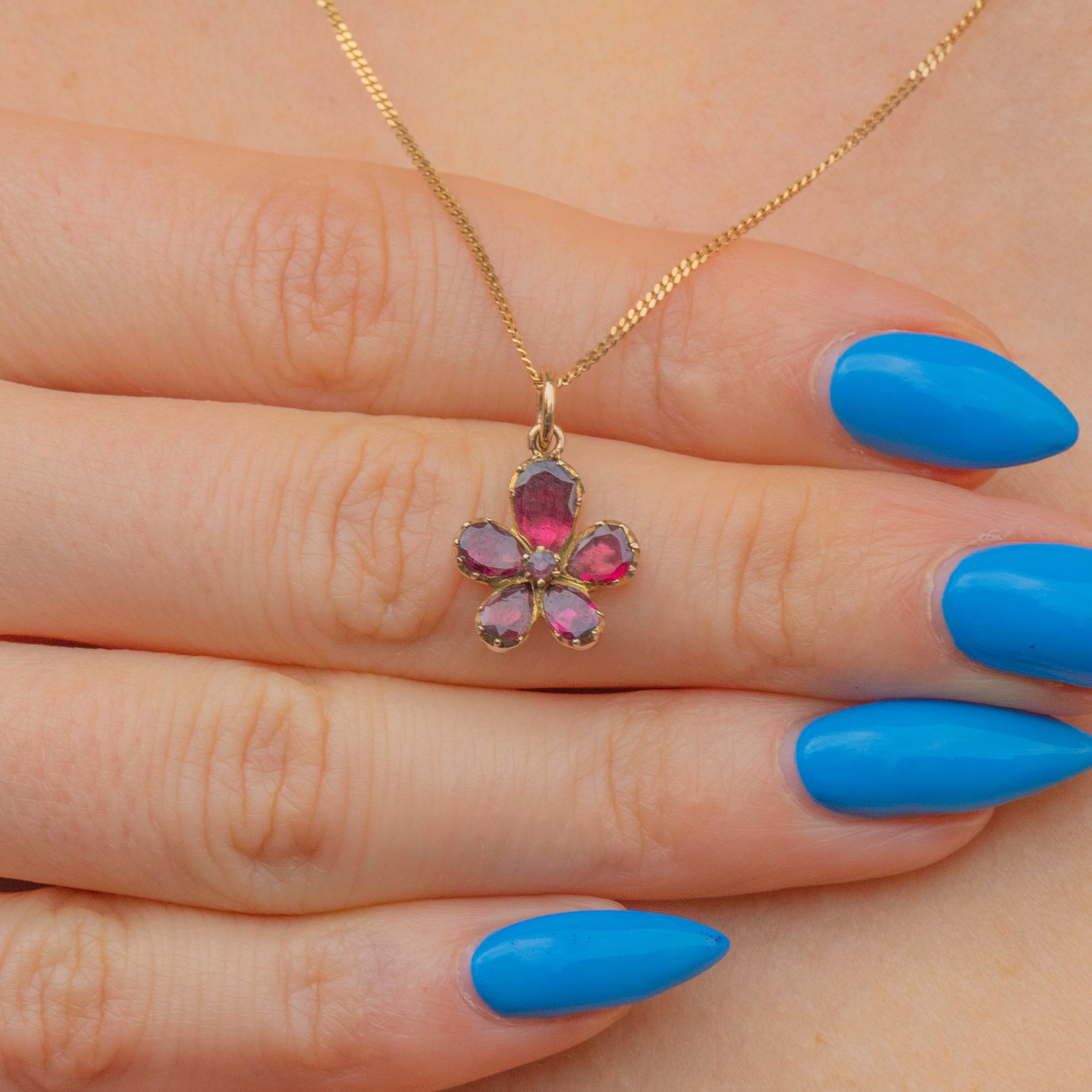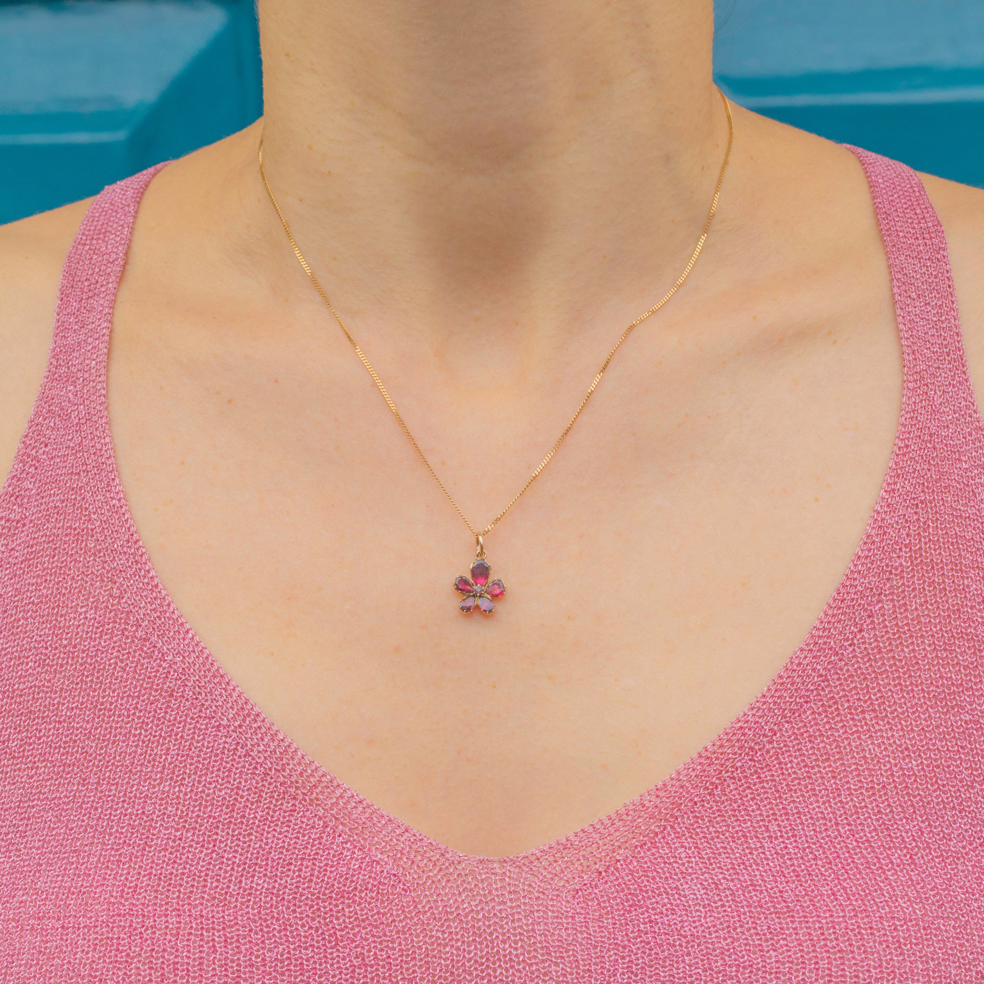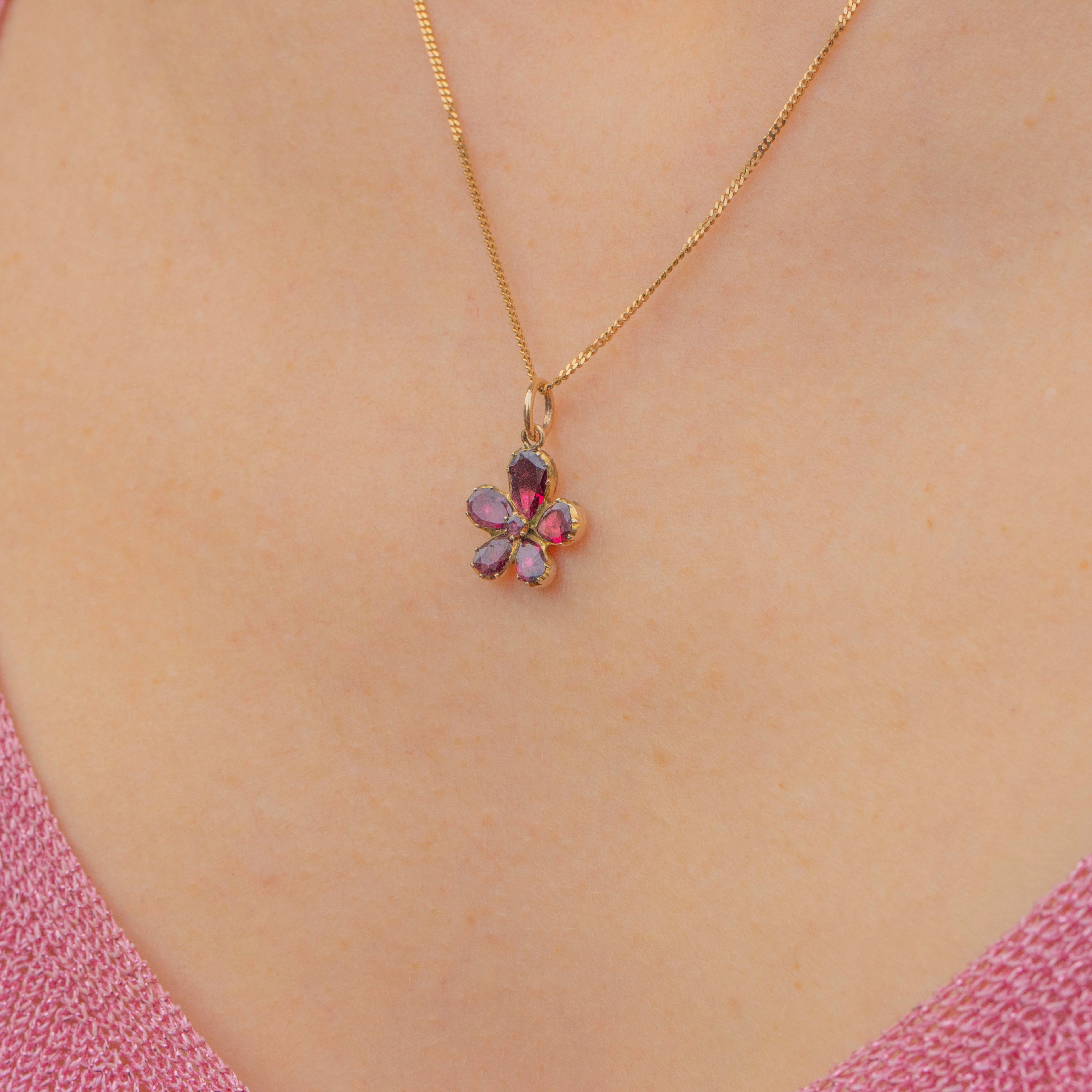 This Georgian 9ct Gold flat-cut Garnet pansy flower charm is just adorable!