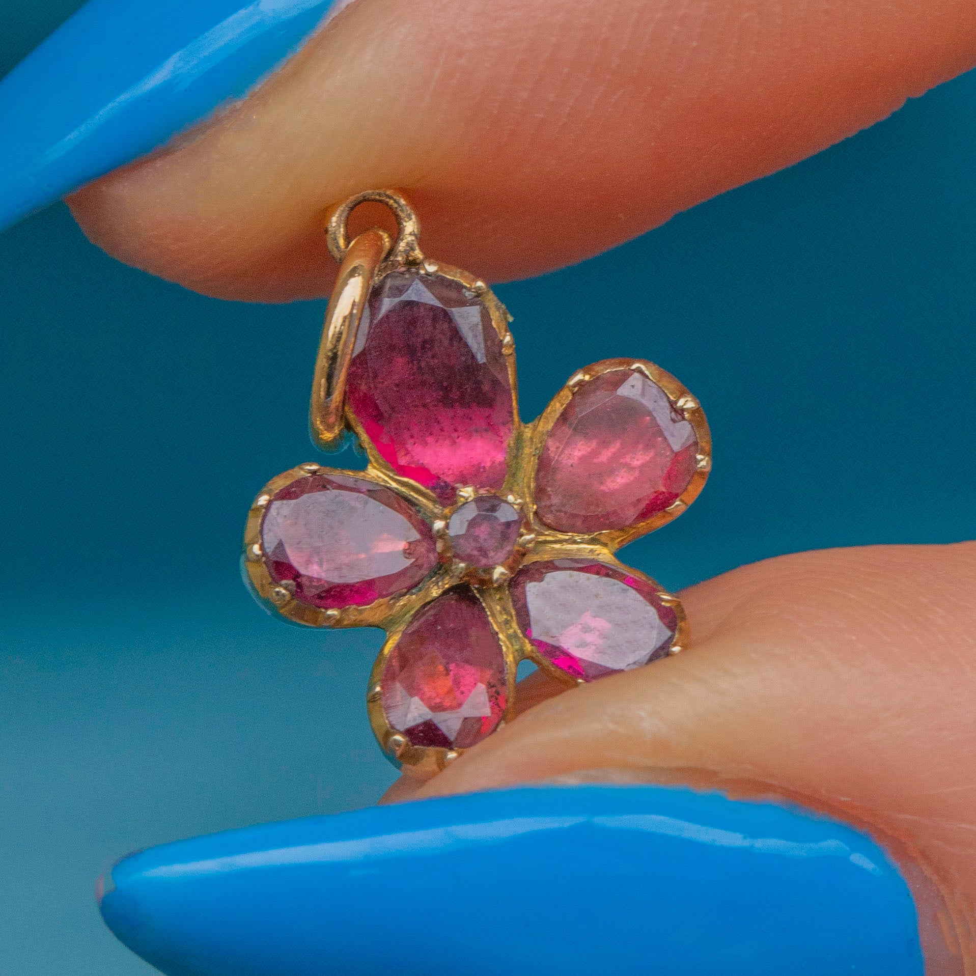 Featuring six flat-cut Garnets, with a combined weight of 0.84ct, this floral Georgian delight is the embodiment playful charm. Her Garnet petals capture the light beautifully, radiating deep magenta hues which are wonderfully complimented by the warmth of her 9ct Gold piecurst settings.