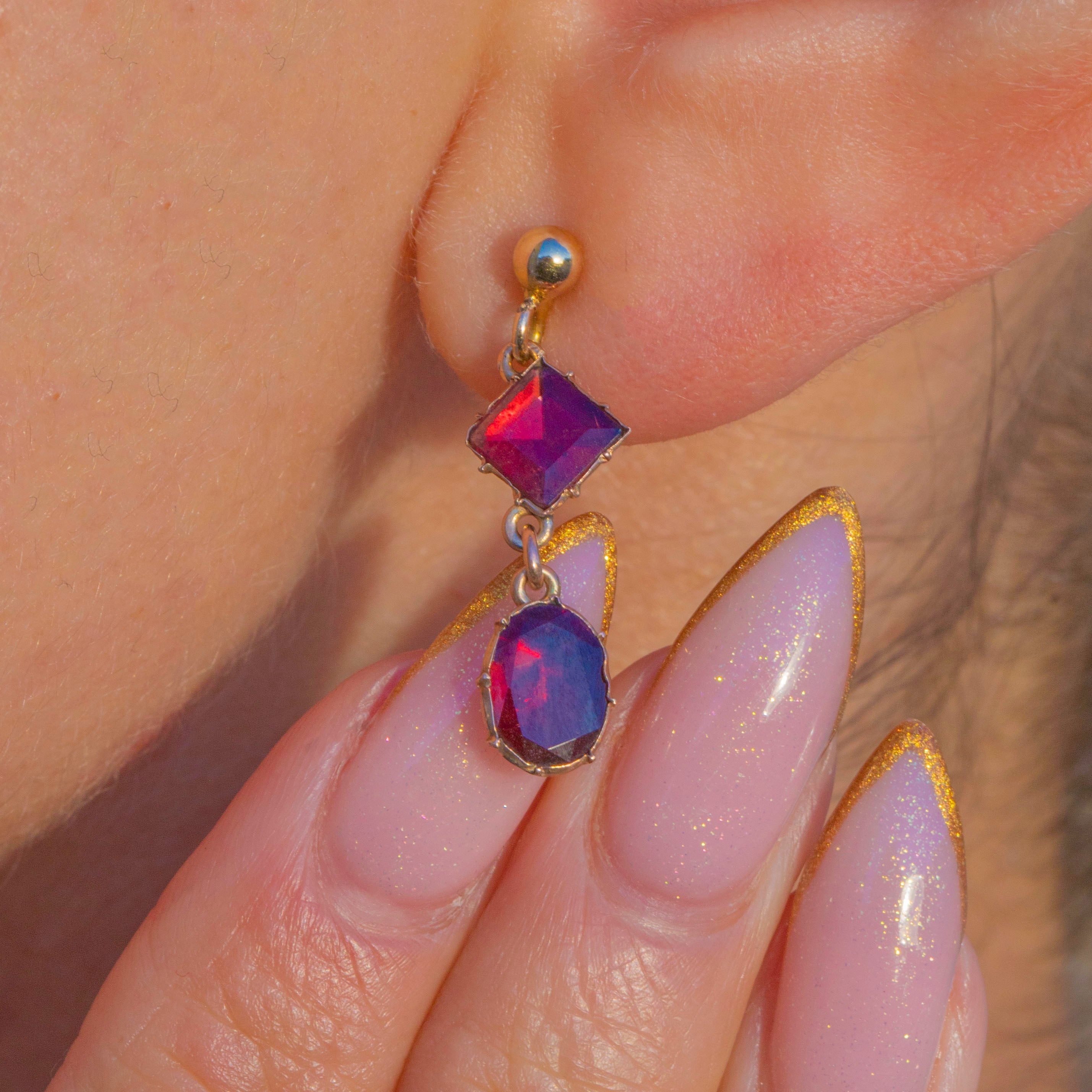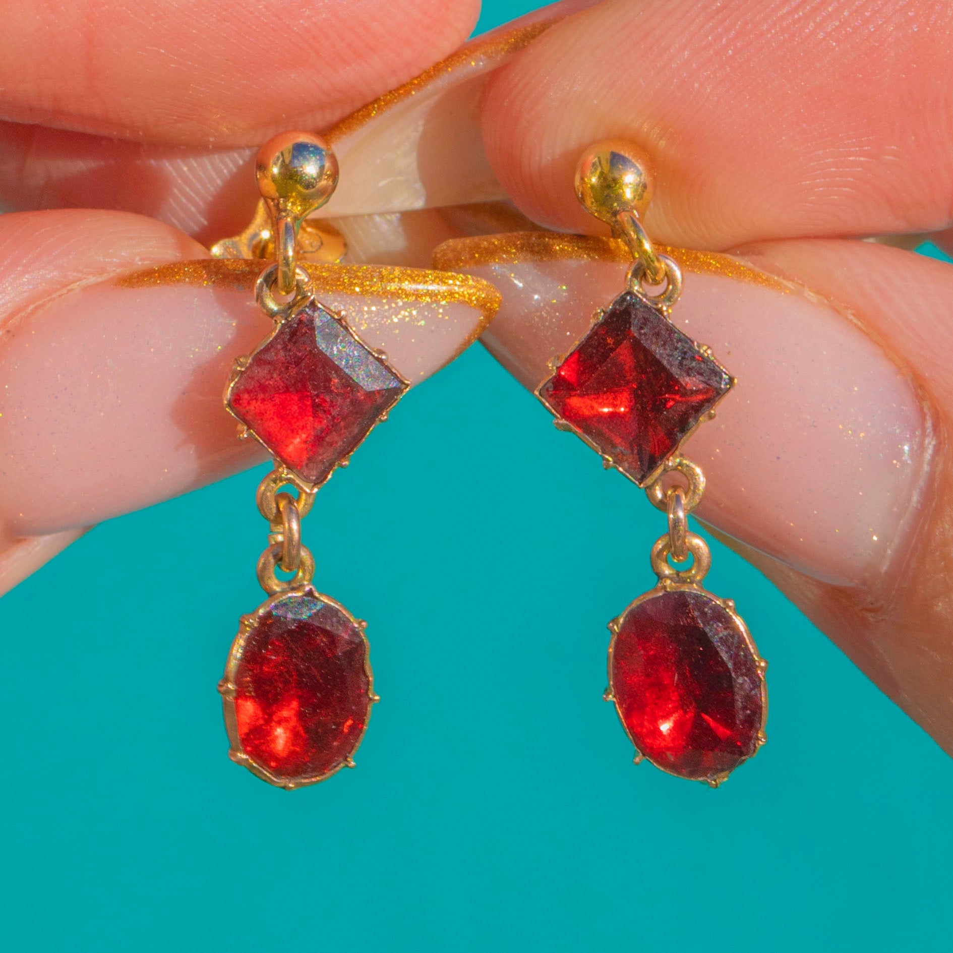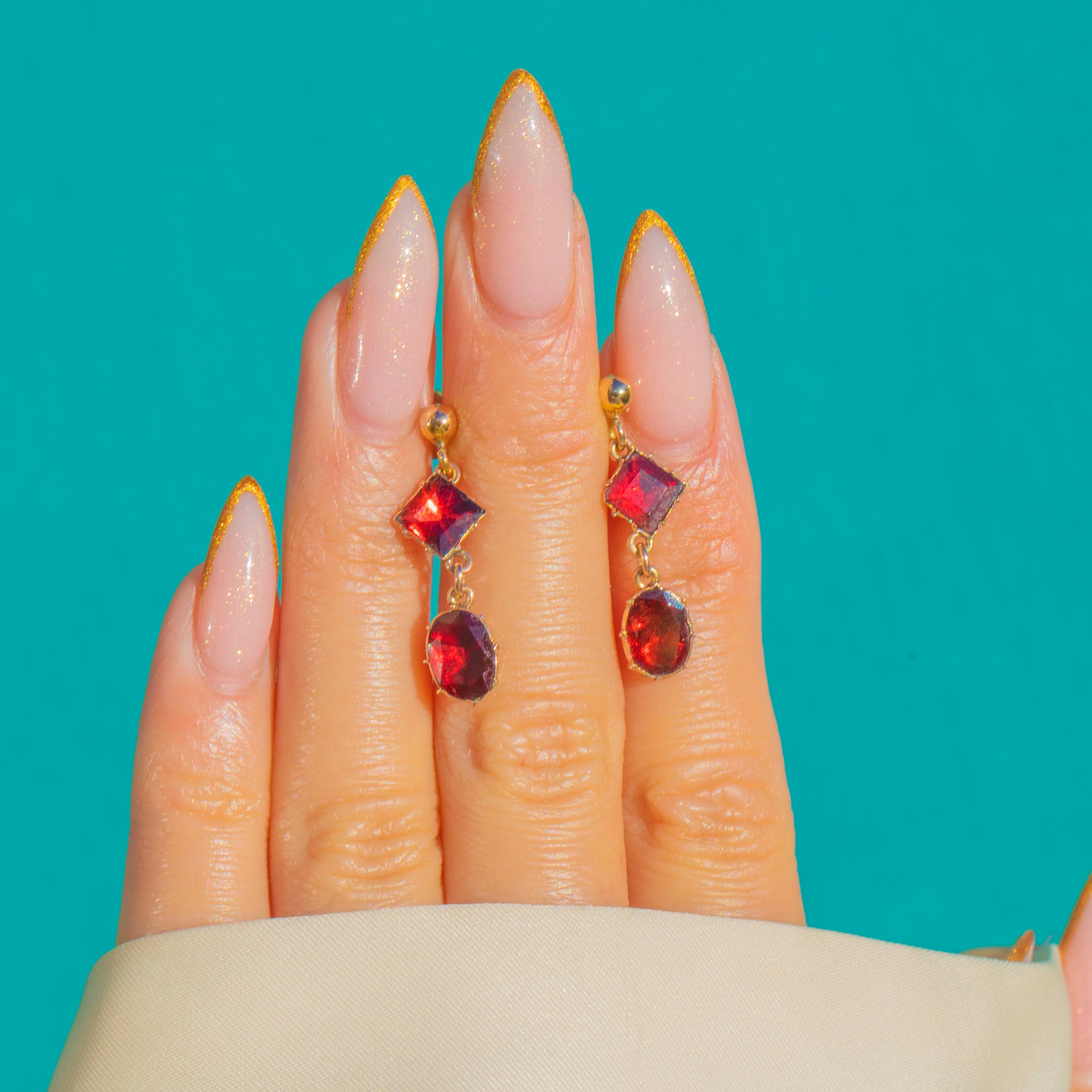 These glowing Garnet drops began life as Georgian earrings and have been lovingly converted onto 9ct Gold stud tops for easy, everyday wear. The flat-cut Garnets are foiled for luminosity- glowing with a rich, fiery red that catches the light beautifully as they sway.