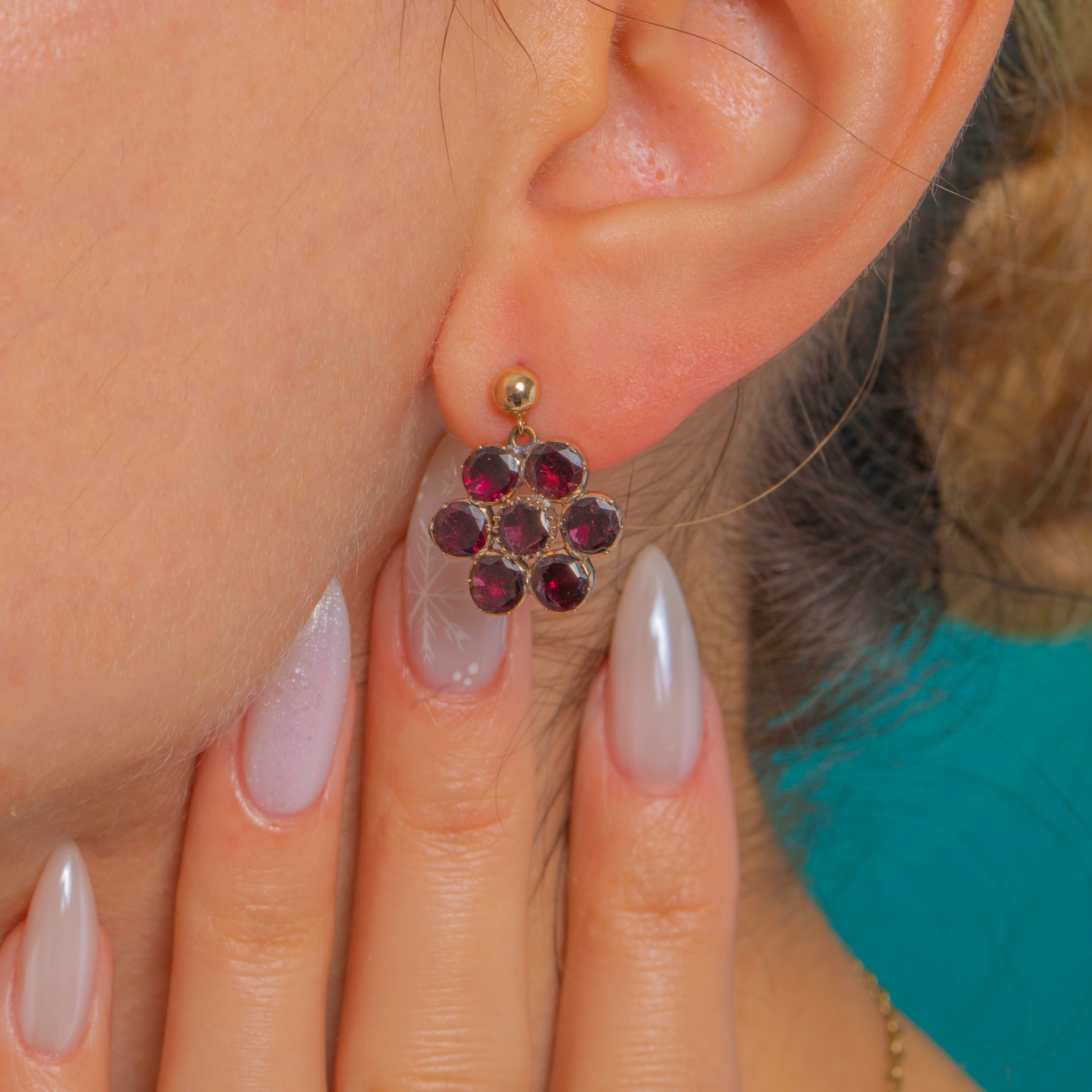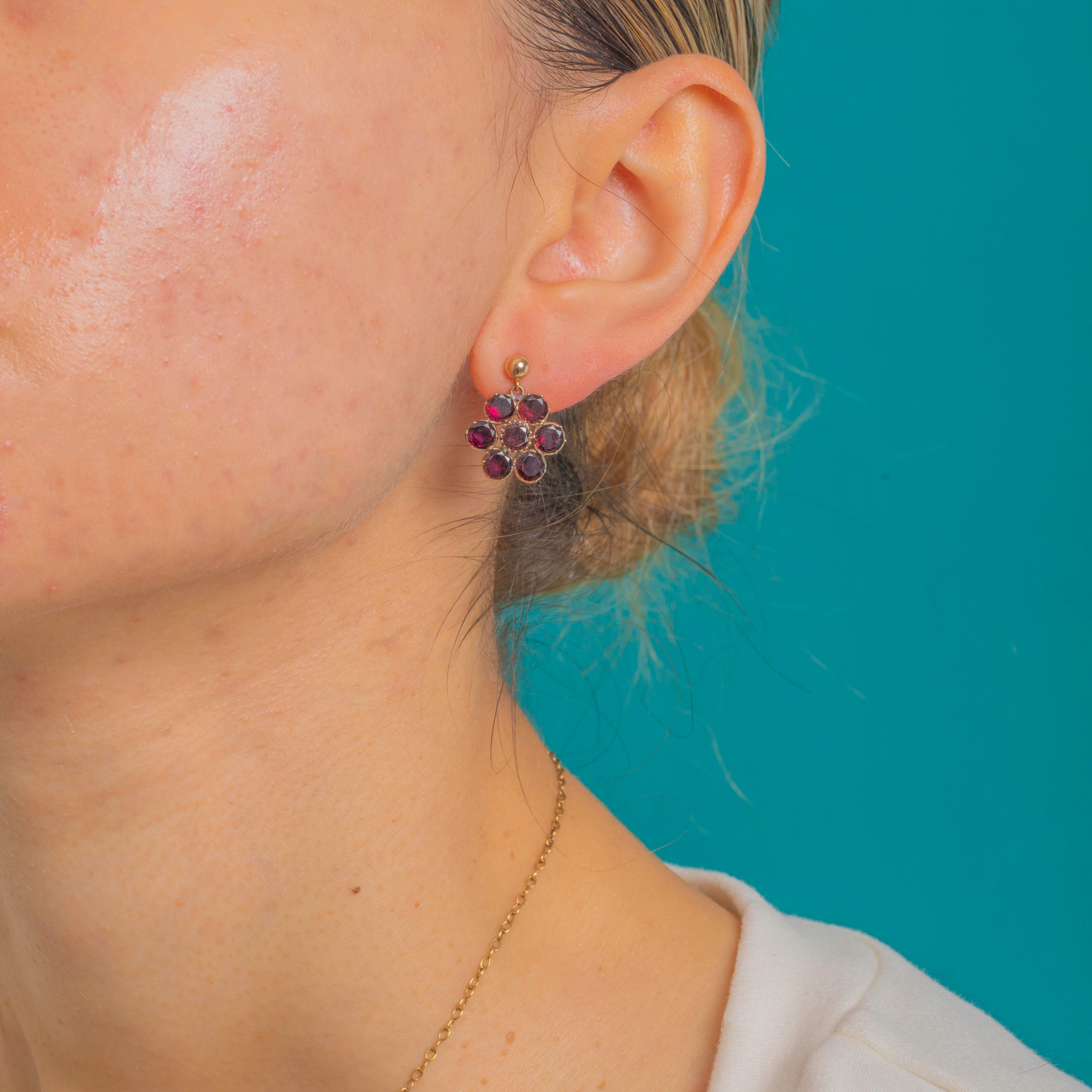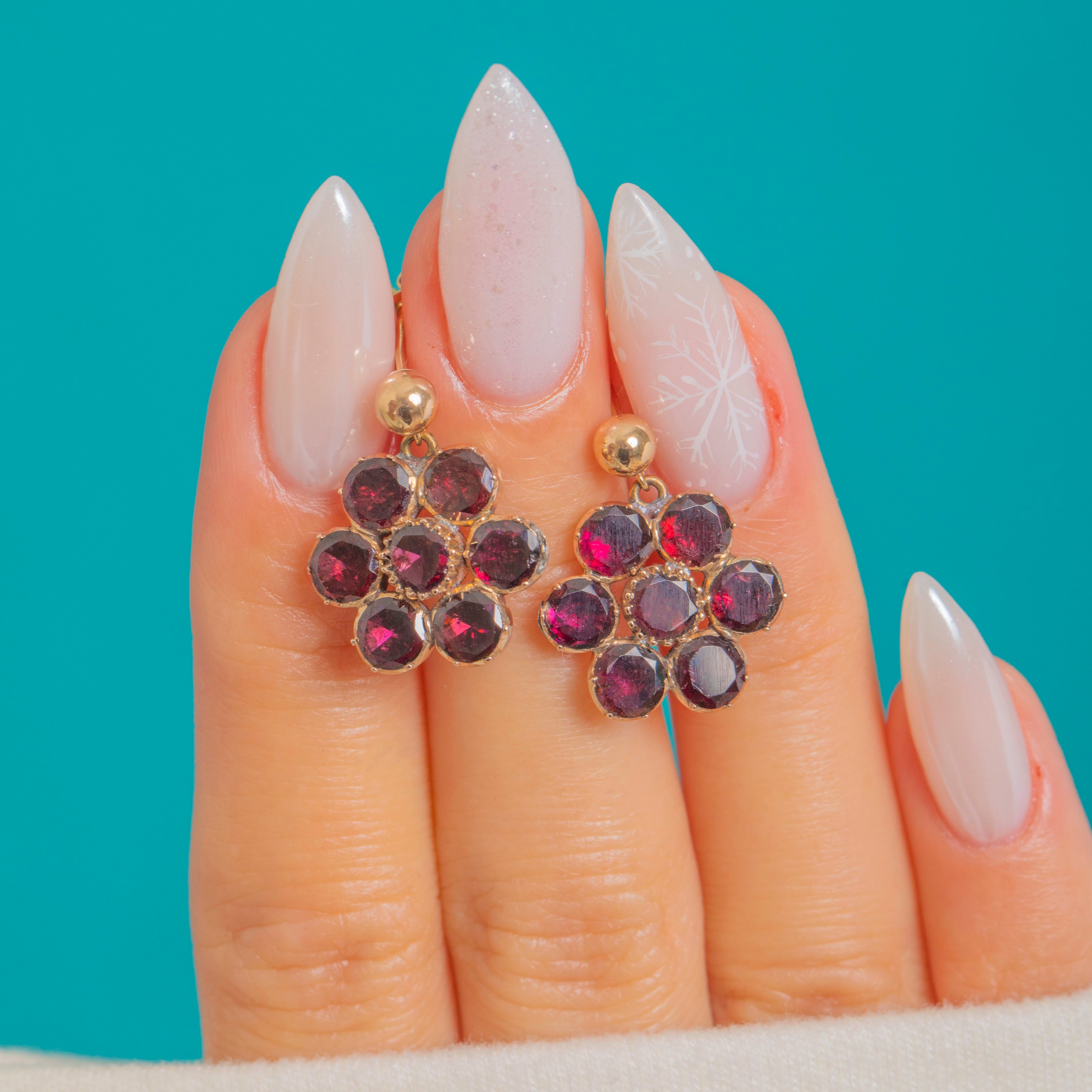 Dainty and romantic, these Georgian Garnet “daisy” earrings each bloom with seven rich wine-red stones. The flat-cut Garnets are hand-set in foiled closed-back 9ct Gold crimped collets, creating that lush, luminous glow we adore from this period. Their petite proportions and refined floral symmetry make them effortlessly elegant for day-to-night wear.