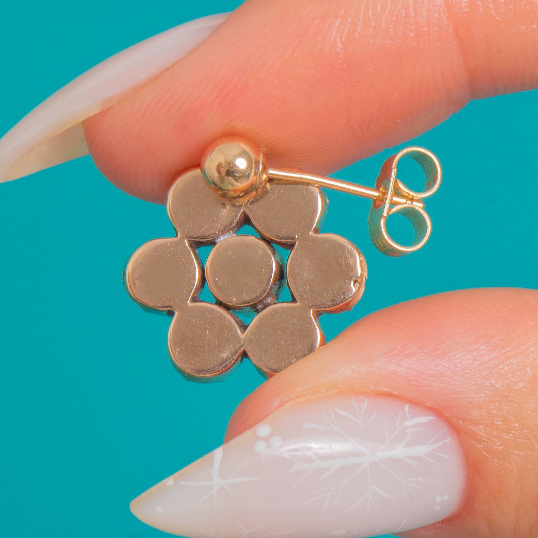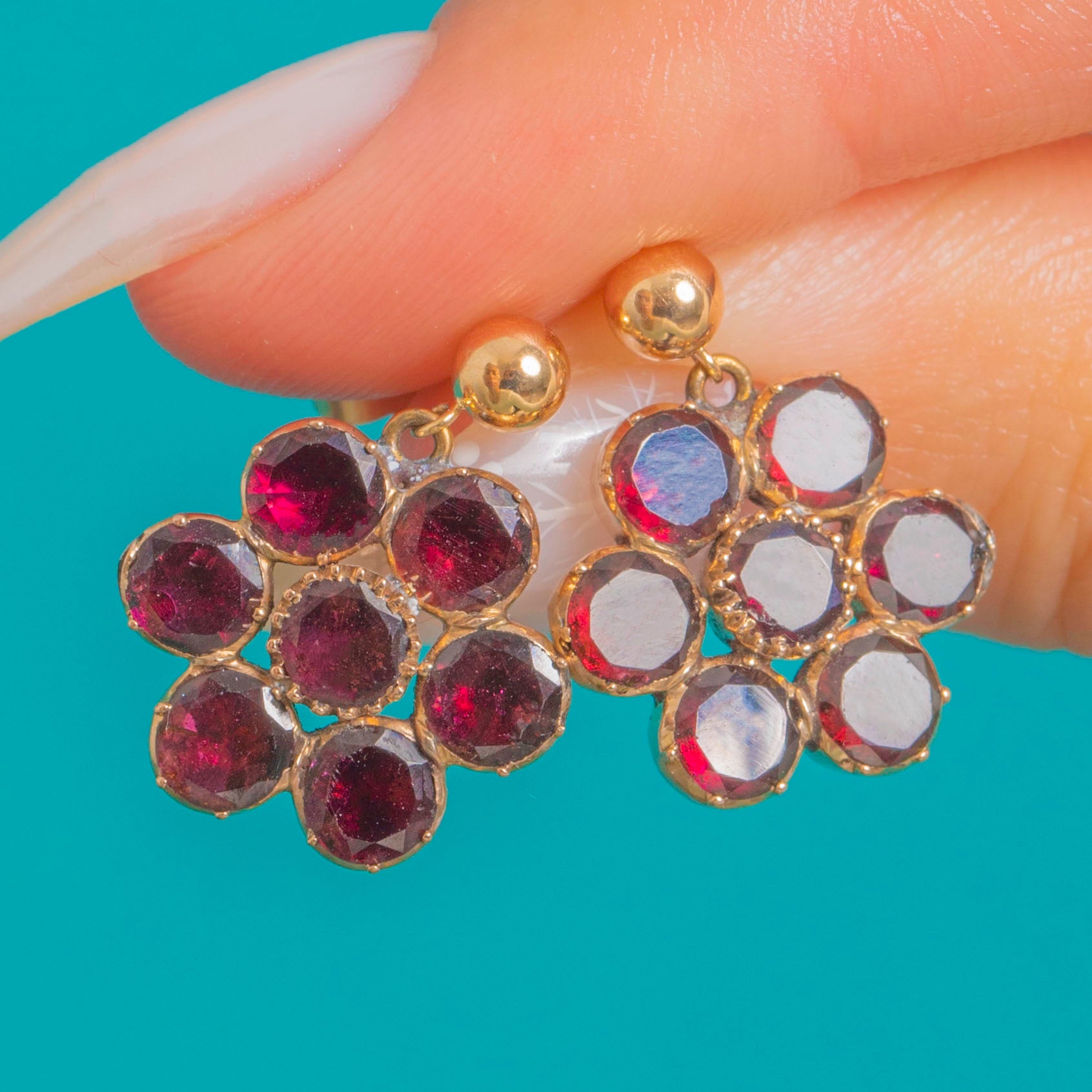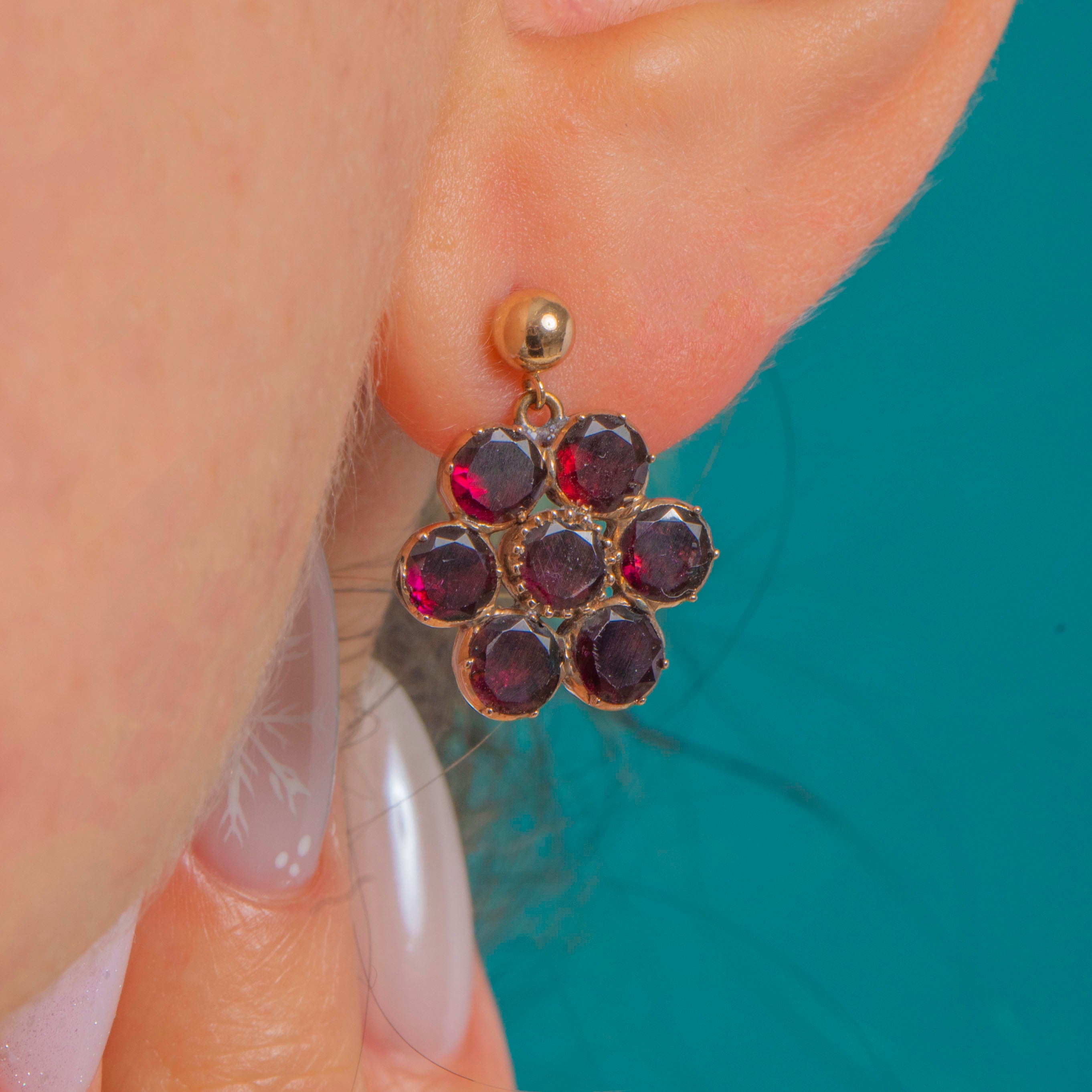 Dainty and romantic, these Georgian Garnet “daisy” earrings each bloom with seven rich wine-red stones. The flat-cut Garnets are hand-set in foiled closed-back 9ct Gold crimped collets, creating that lush, luminous glow we adore from this period. Their petite proportions and refined floral symmetry make them effortlessly elegant for day-to-night wear.