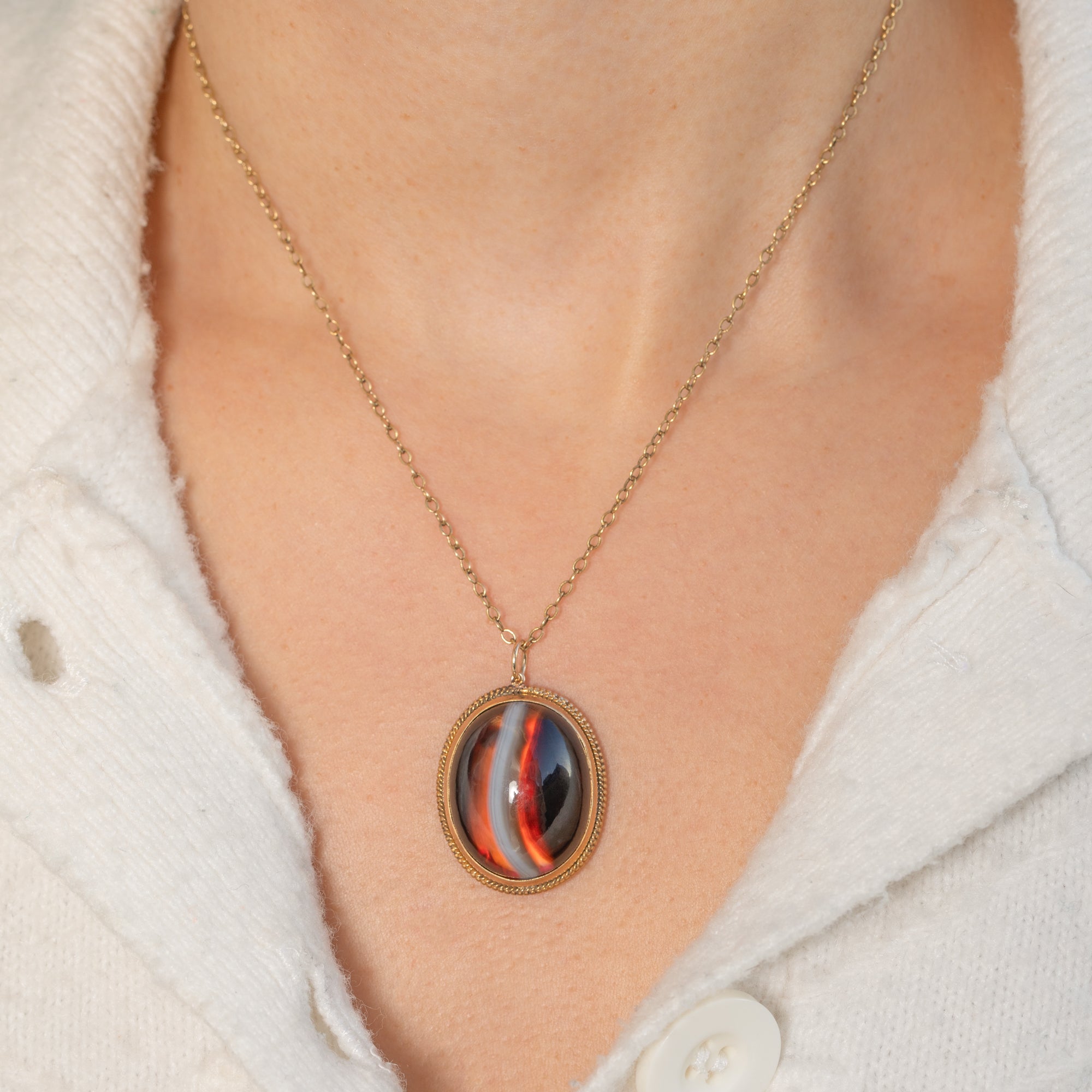 This glowing Victorian banded Agate charm pendant is a true miniature masterpiece. The richly striped cabochon shows dramatic flashes of fiery red, chocolate and inky black, cut en cabochon so the colours seem to roll across the surface as it moves. Framed in a rope-edged Gold-coloured mount, it has all the presence and romance you’d hope for from a 19th-century talisman.