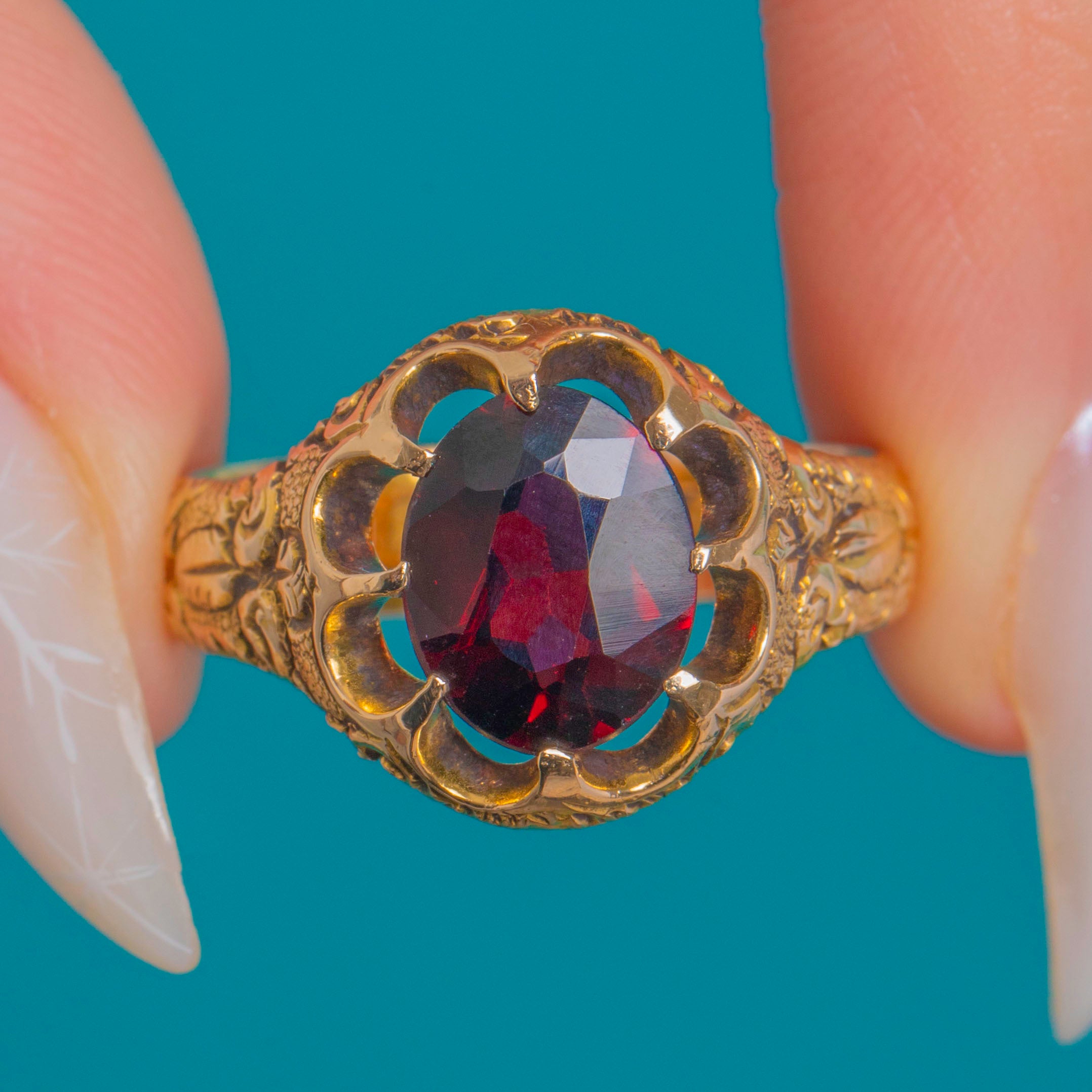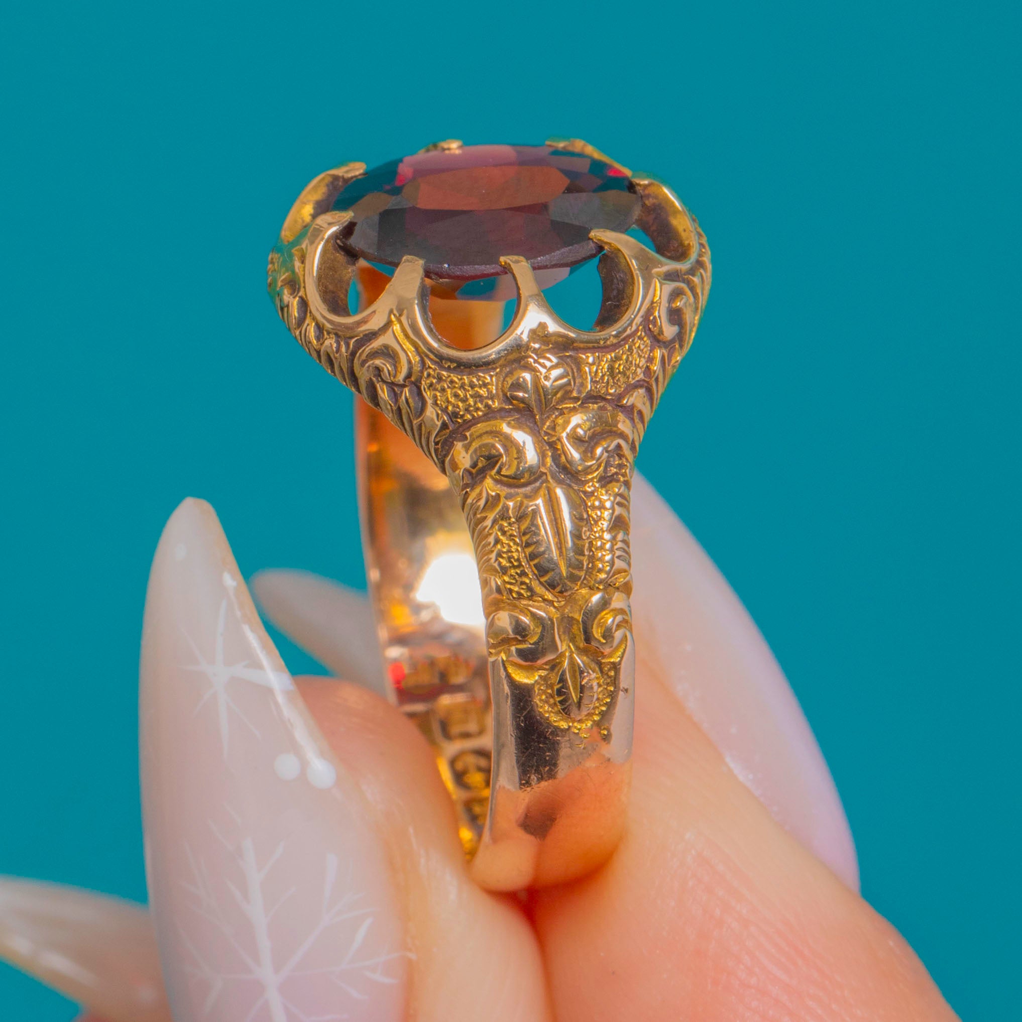 Opulent and romantic, this ornate antique 15ct Gold ring showcases a deep wine-red Garnet lifted high in a scalloped coronet "buttercup" setting. The stone’s rich hue glows beautifully in the open-back setting, while the tall profile creates a striking silhouette on the hand.