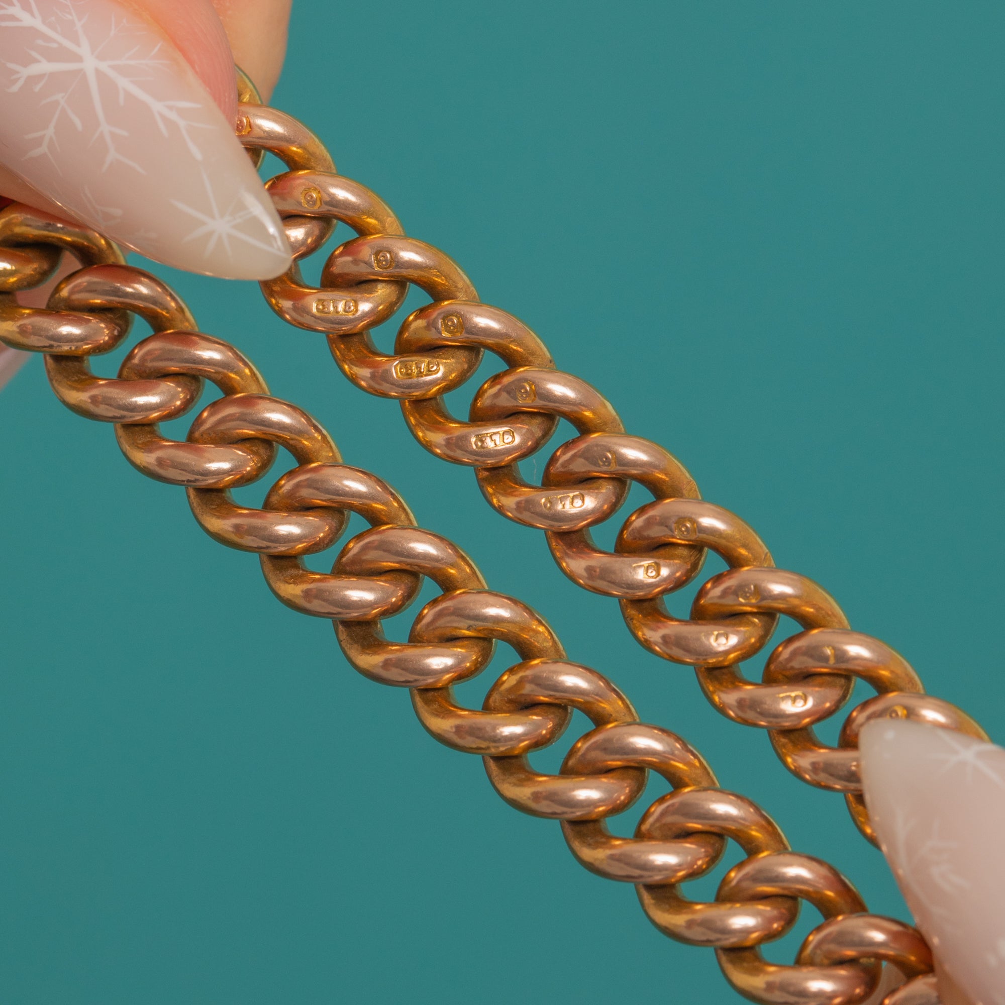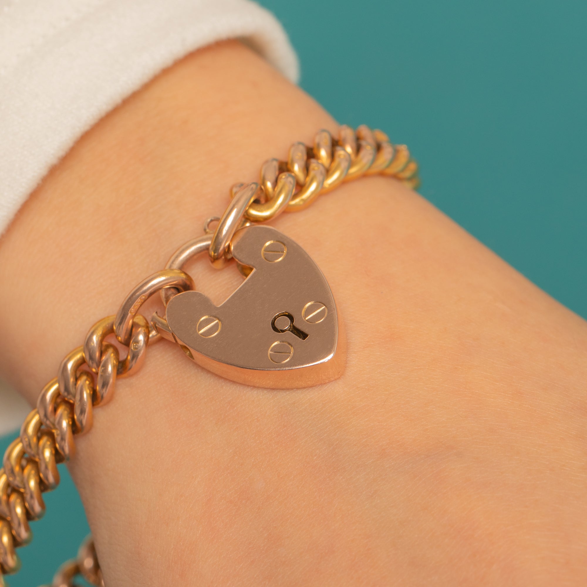A timeless icon of British jewellery, this heavy Victorian curb-link bracelet is crafted in rich 9ct Gold and finished with a classic heart-shaped padlock clasp. The chubby, uniform links are beautifully made with a bright, mirror-like polish, while the padlock bears the traditional keyhole motif and neat screw-head detailing for that perfect romantic flourish.