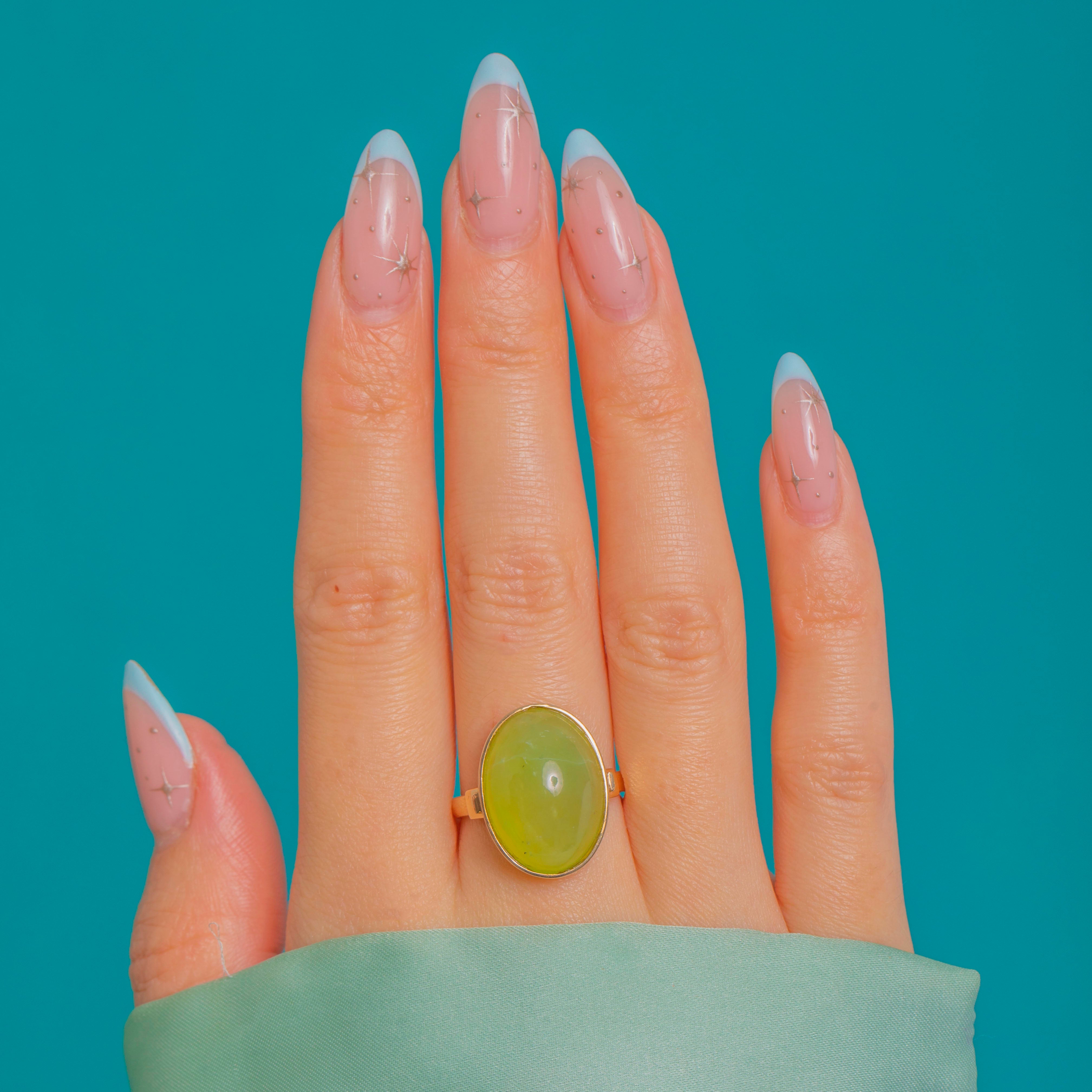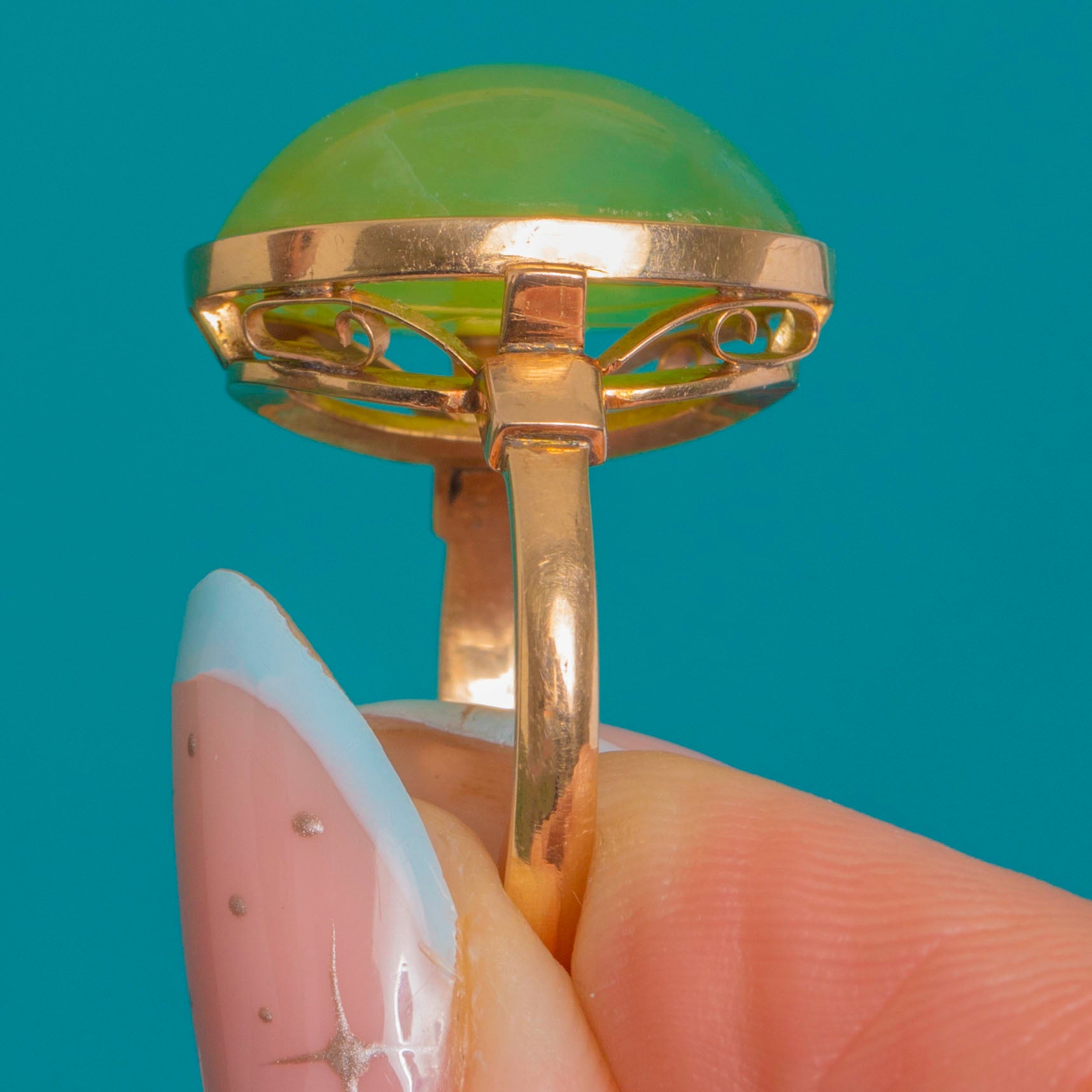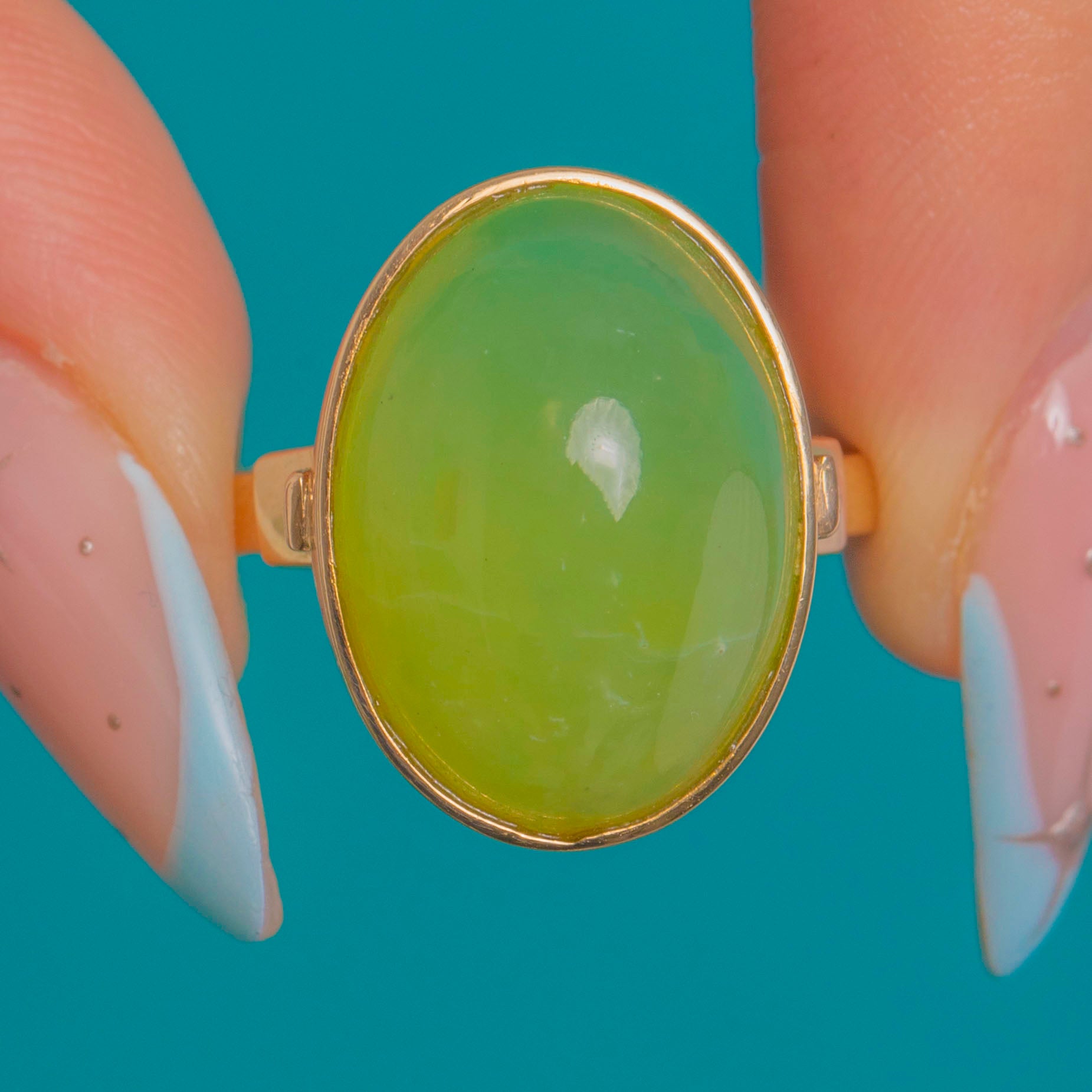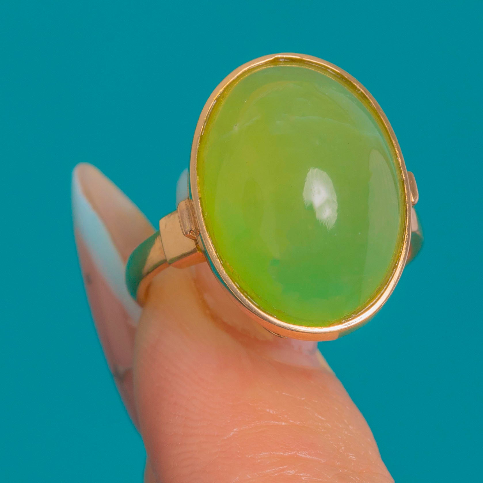 Confident and sculptural, this Vintage Chalcedony ring showcases a luscious apple-green oval cabochon set in rich 14ct Gold. The smooth rubover bezel frames the glossy dome beautifully, allowing the stone’s fresh, translucent glow to take centre stage.