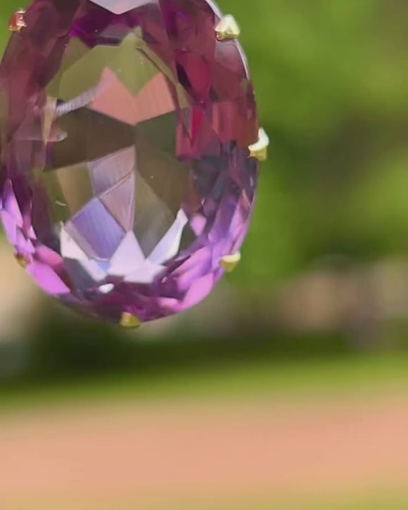 This large 9ct Gold Amethyst pendant is everything your collection needs! Set in 9ct Gold, a 30.00ct oval-cut Amethyst is poised upon a basket setting that allows light to stream through from every angle.