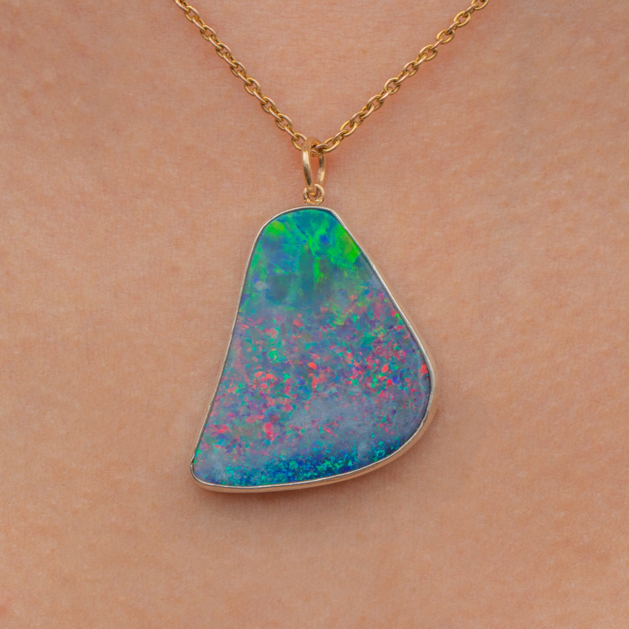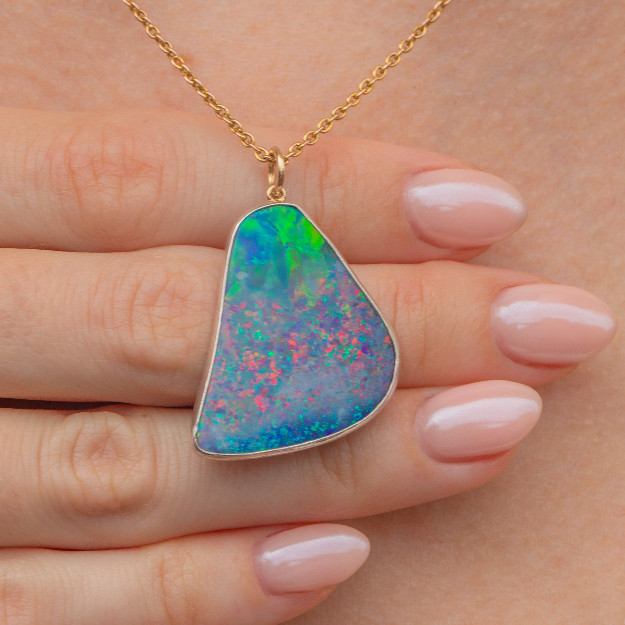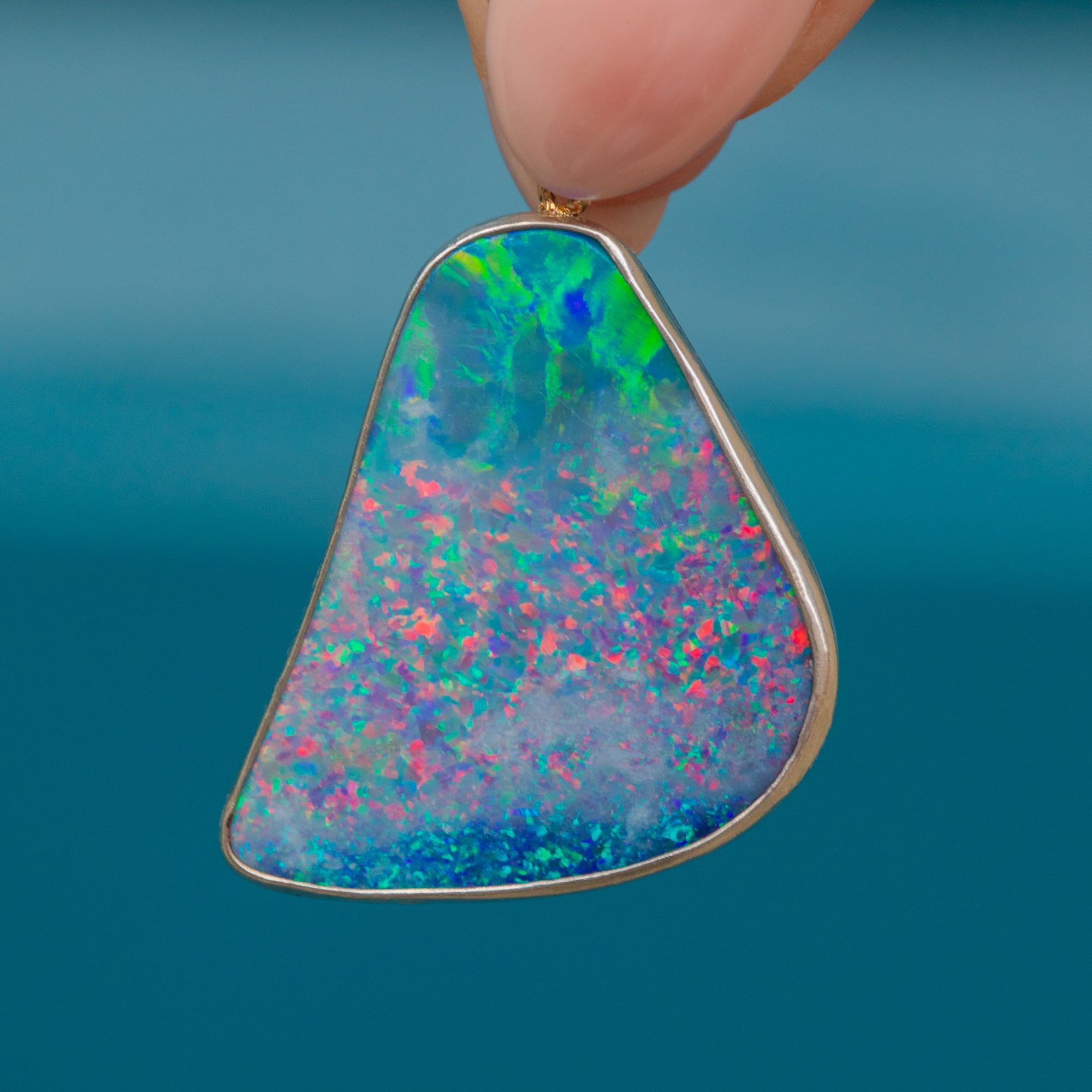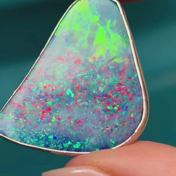 This Large Confetti Silver Opal Pendant is an eruption of colour! Like a burst of confetti, vivid flashes of hot pinks, electric blue, and lime green, you'll easily get lost in her iridescent depths.