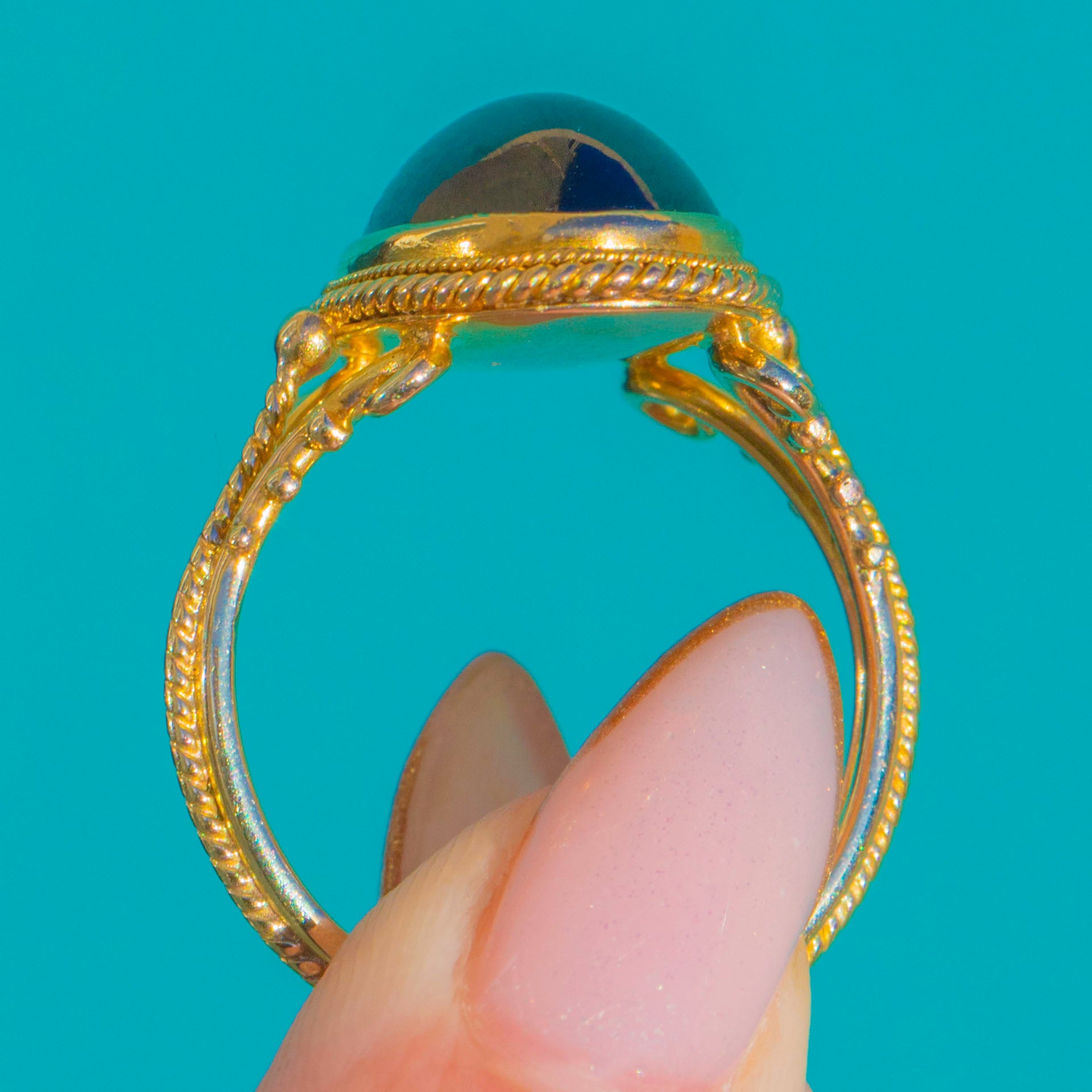 EXCELLENT: The Garnet cabochon is smooth and glossy with no chips or cracks visible under close inspection. The Gold setting shows only light surface wear in keeping with age, with the rope-twist and scroll details crisp and well-preserved. A beautifully maintained vinta