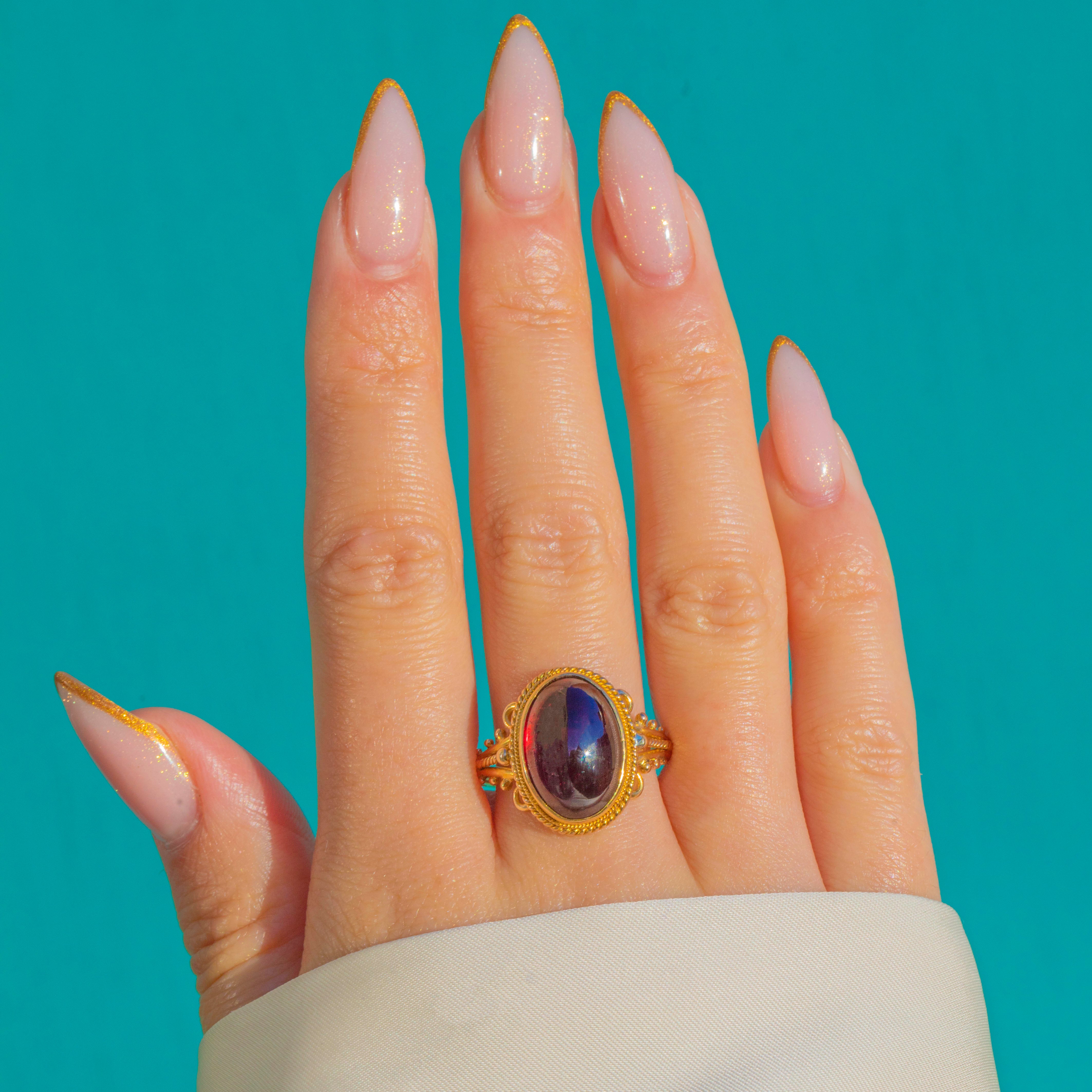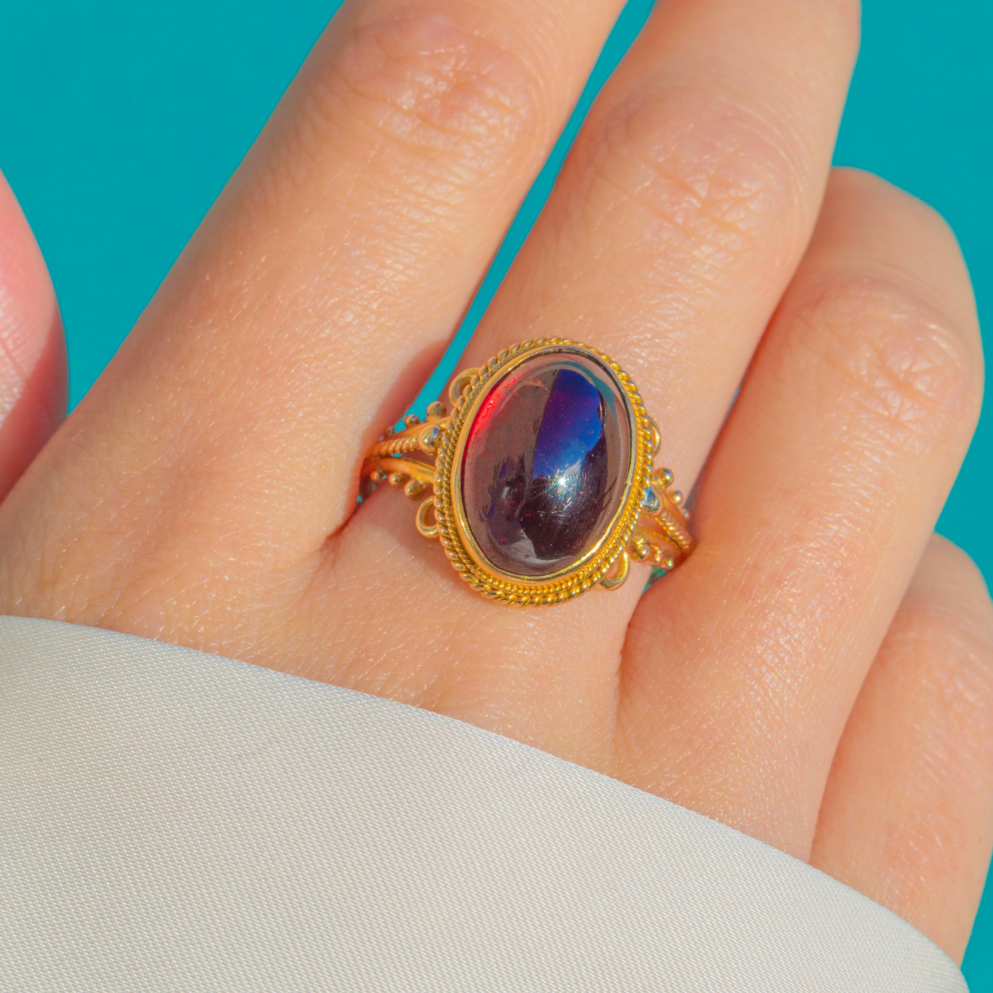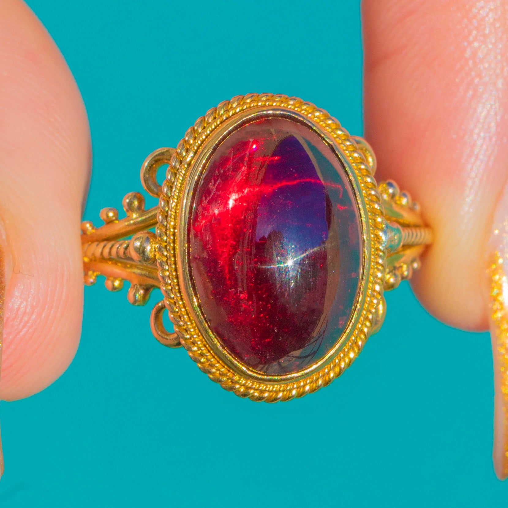 This Victorian ring showcases a striking high-domed 7.00ct Garnet cabochon in a beautifully ornate 15ct Gold setting and 9ct Gold band. The large, glossy cabochon displays rich red tones with flashes of cherry and claret, giving it a luxurious, dramatic presence on the hand!
