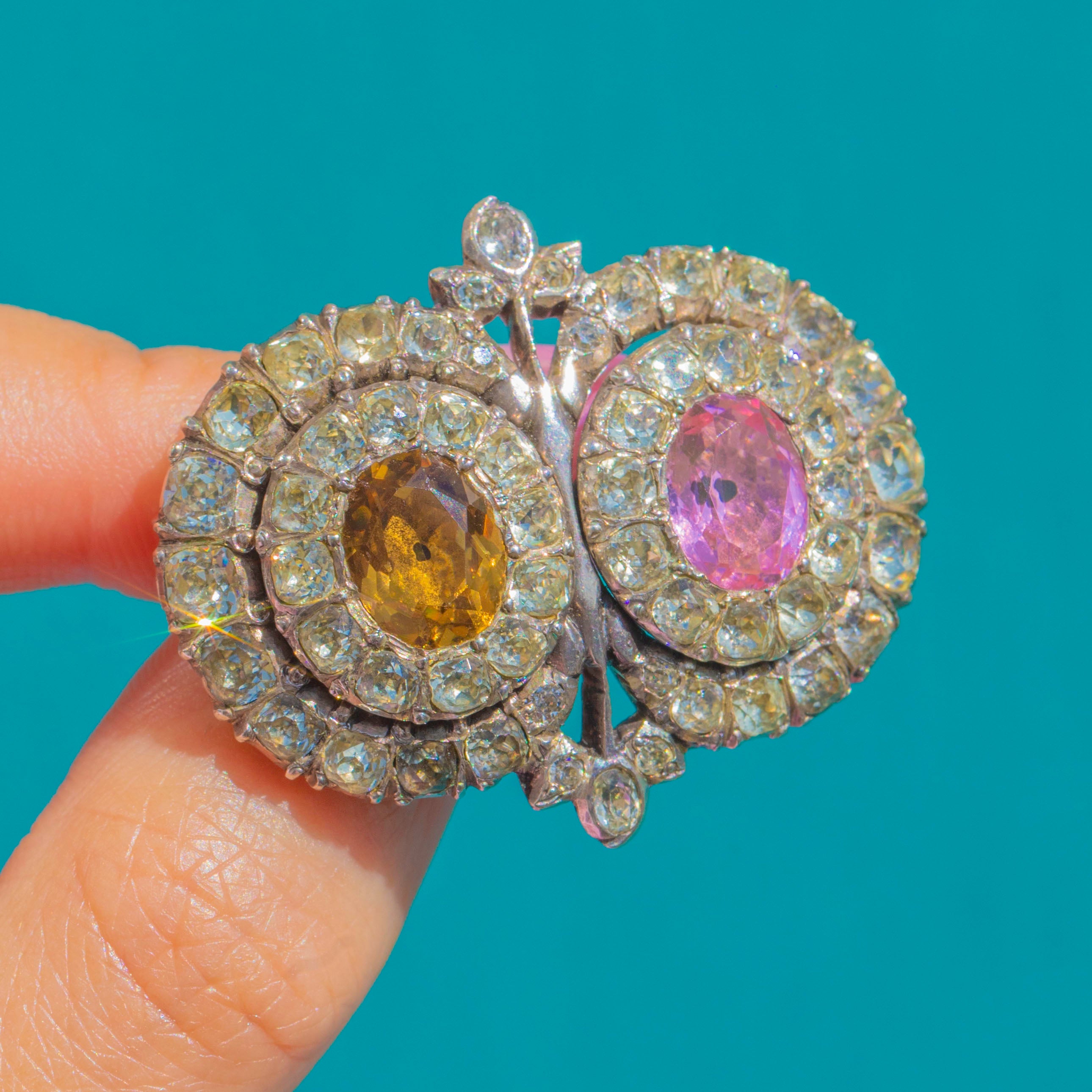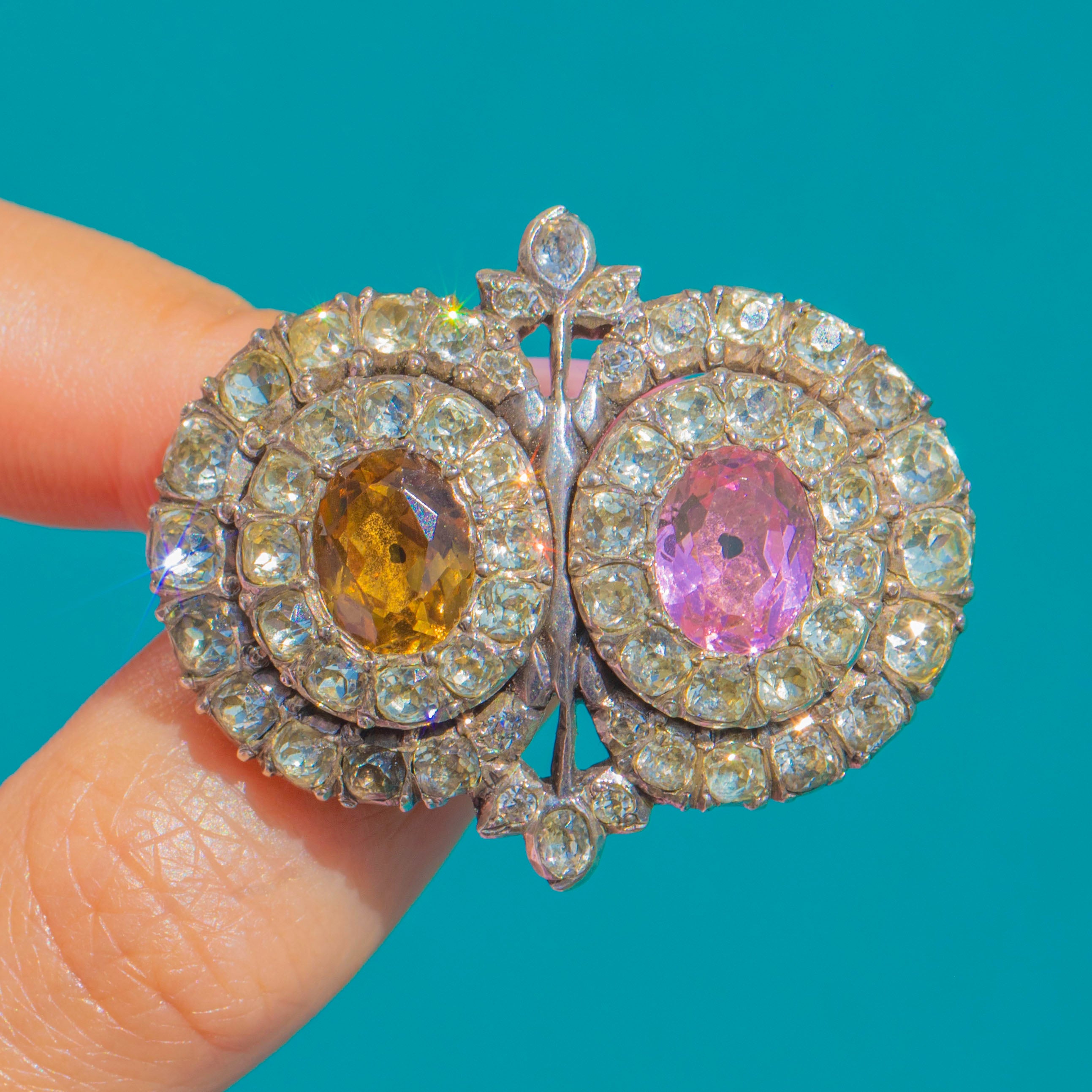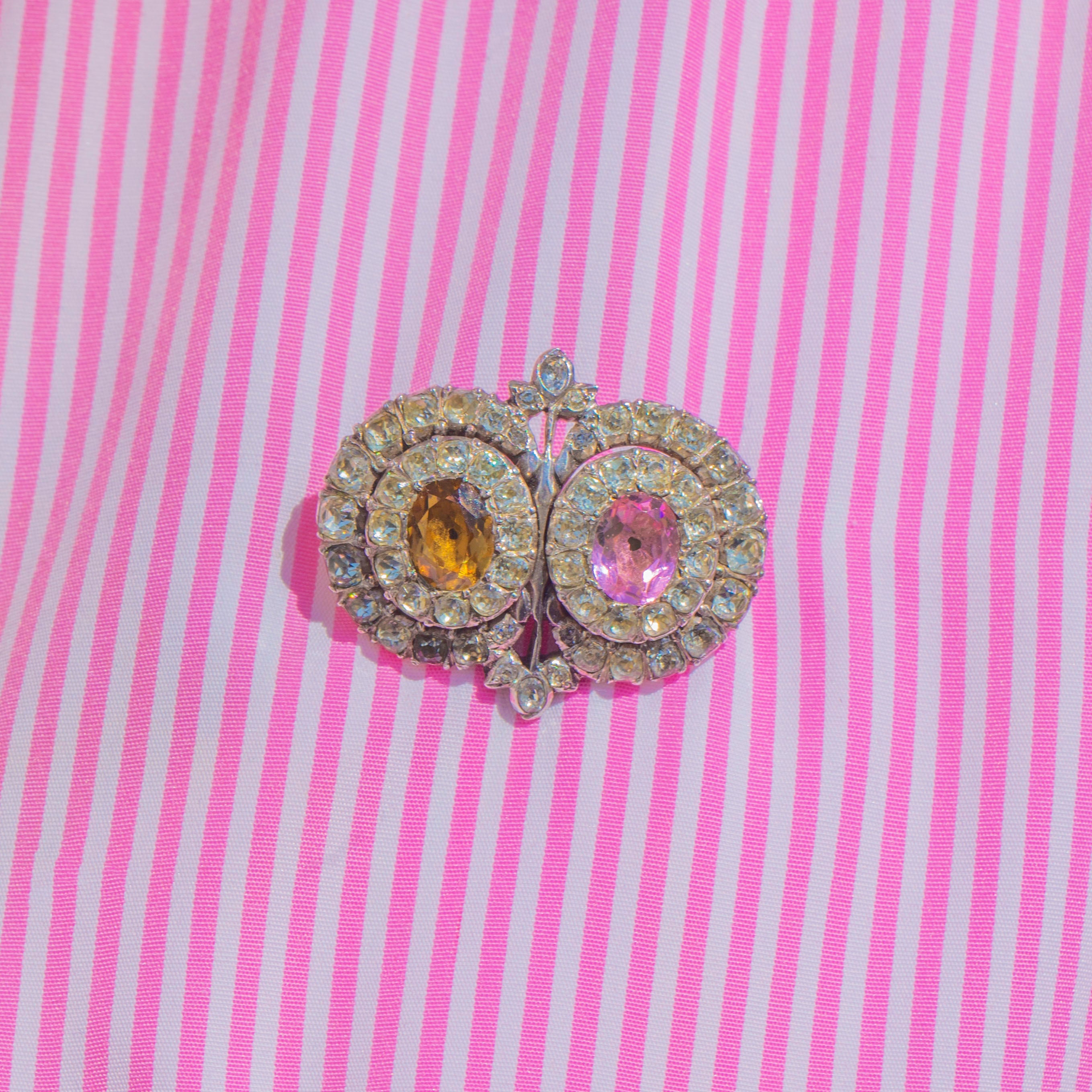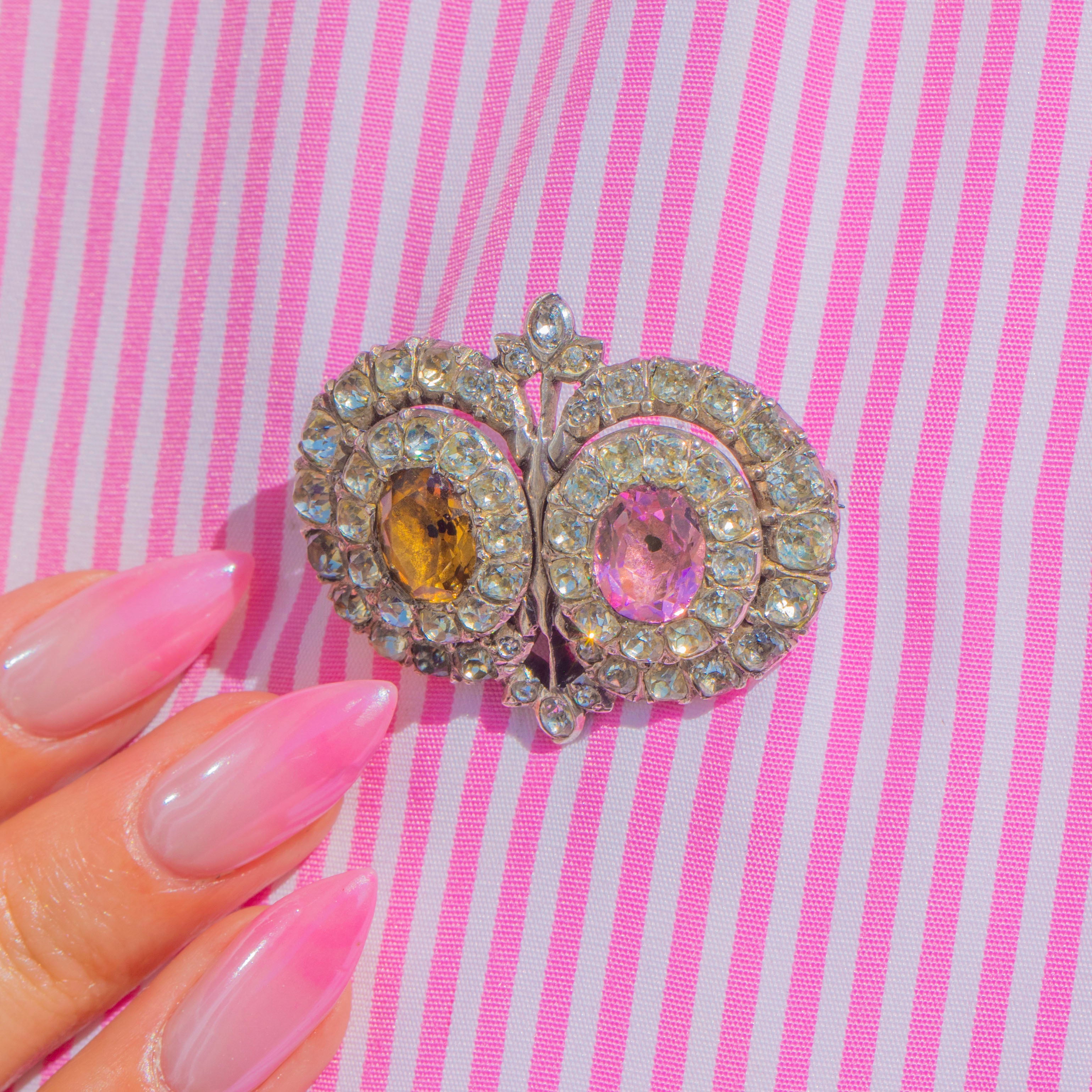 A remarkable Georgian Queen Anne Paste brooch, crafted in lustrous Sterling Silver and aglow with romantic colour. Two oval centre stones in blush pink and maple tones are haloed by shimmering white Paste, arranged in elegant concentric rows that catch the light beautifully. The softly domed Silver backs and refined cluster work create a sweet, floral silhouette with timeless charm.