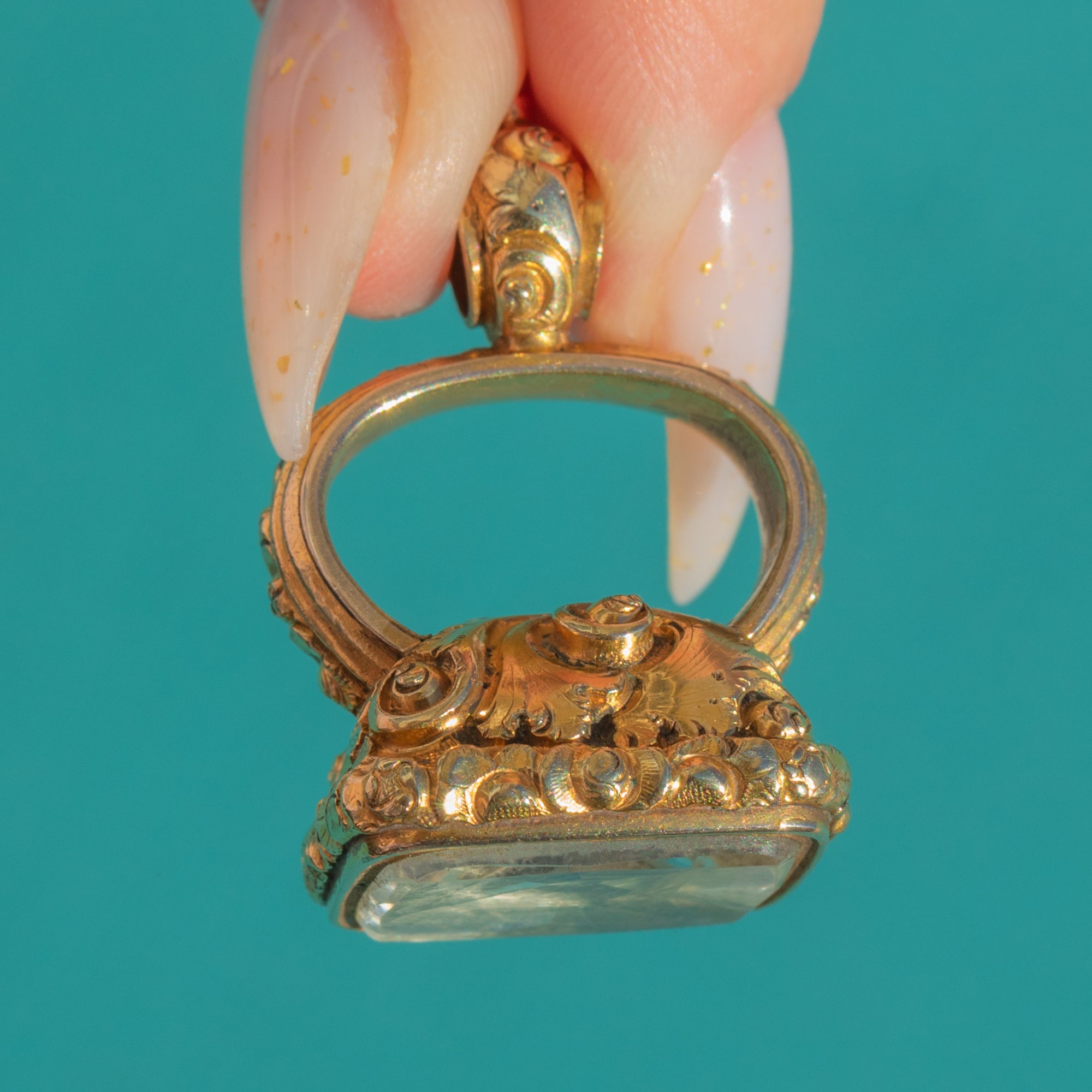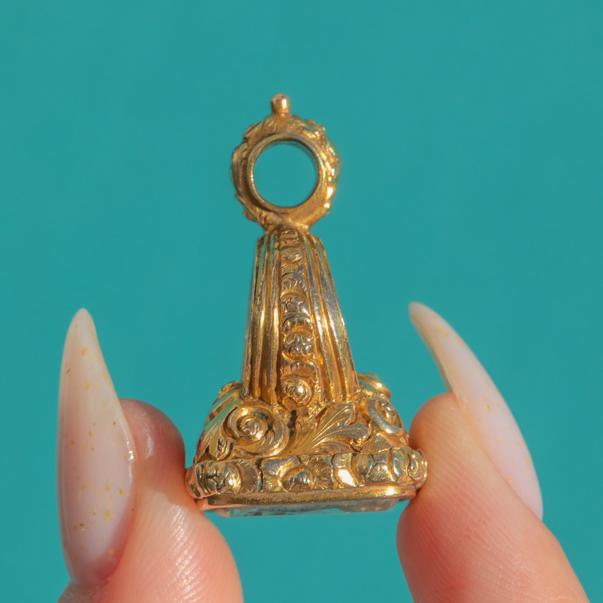 Opulent and richly detailed, this glowing Victorian fob pendant brings all the romance of the era in a compact, sculptural form. An arched handle crowns a domed, chased body adorned with foliate scrolls, rosettes, and delicate beaded and scalloped borders, the golden glow of the gilt metal mellowed by a beautiful antique patina.
