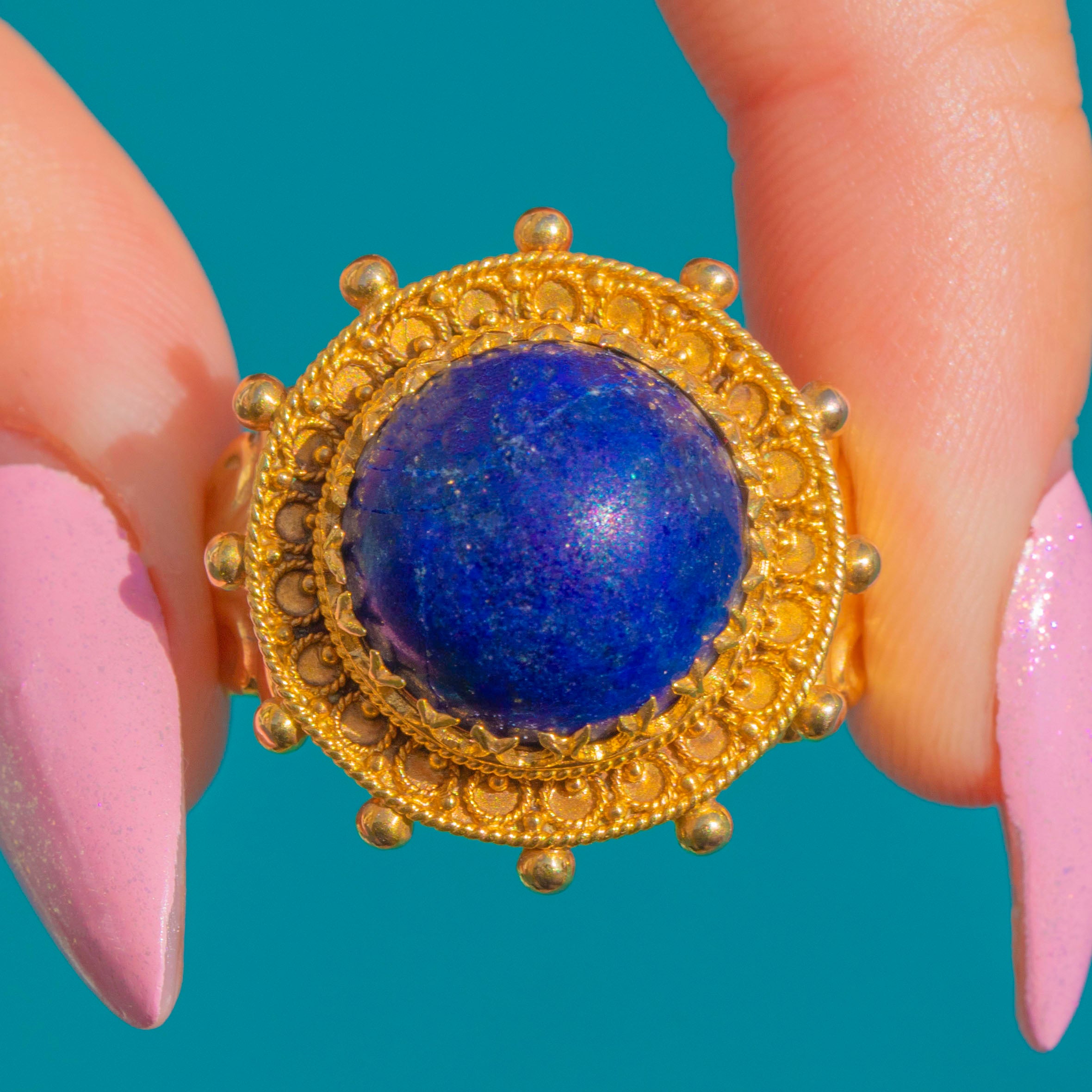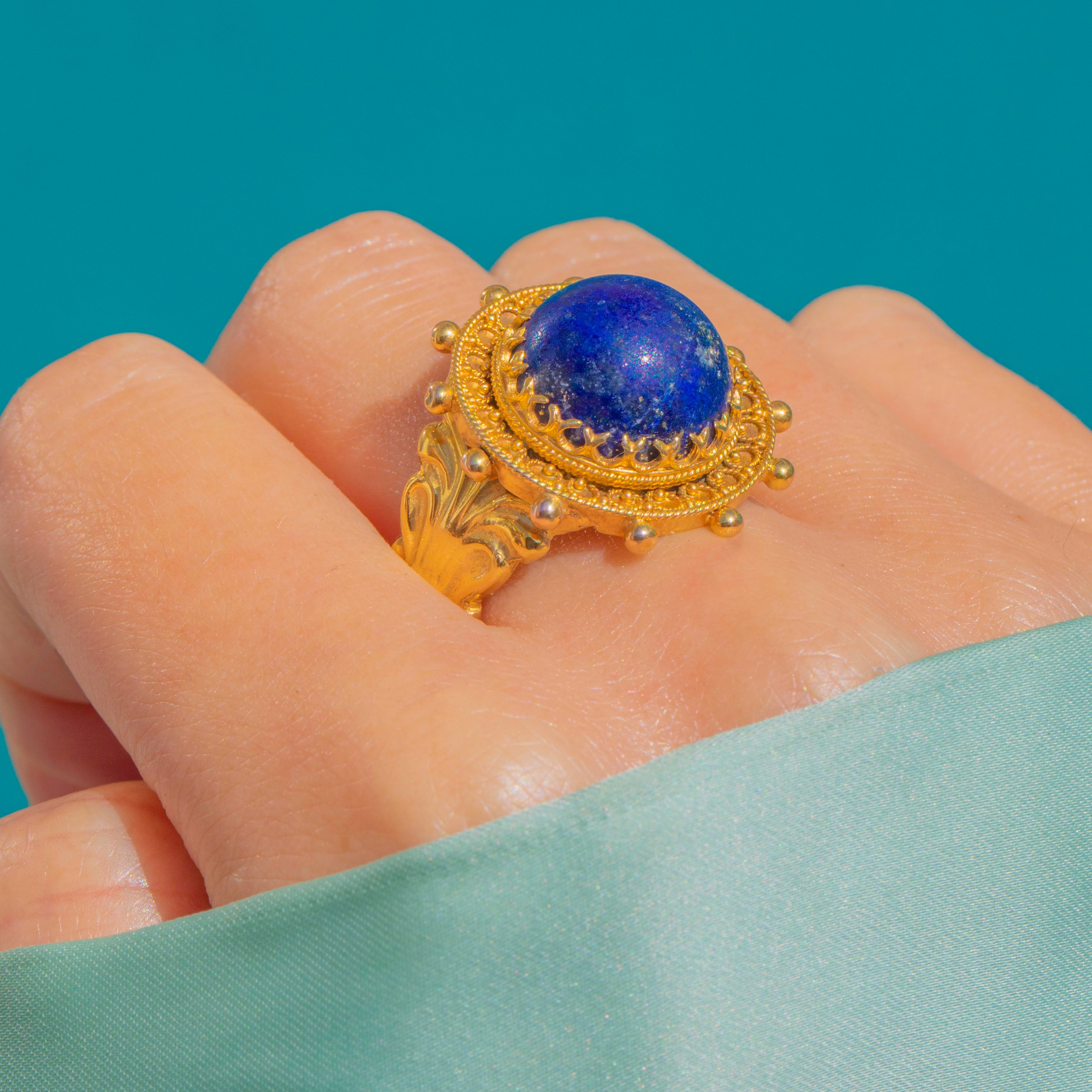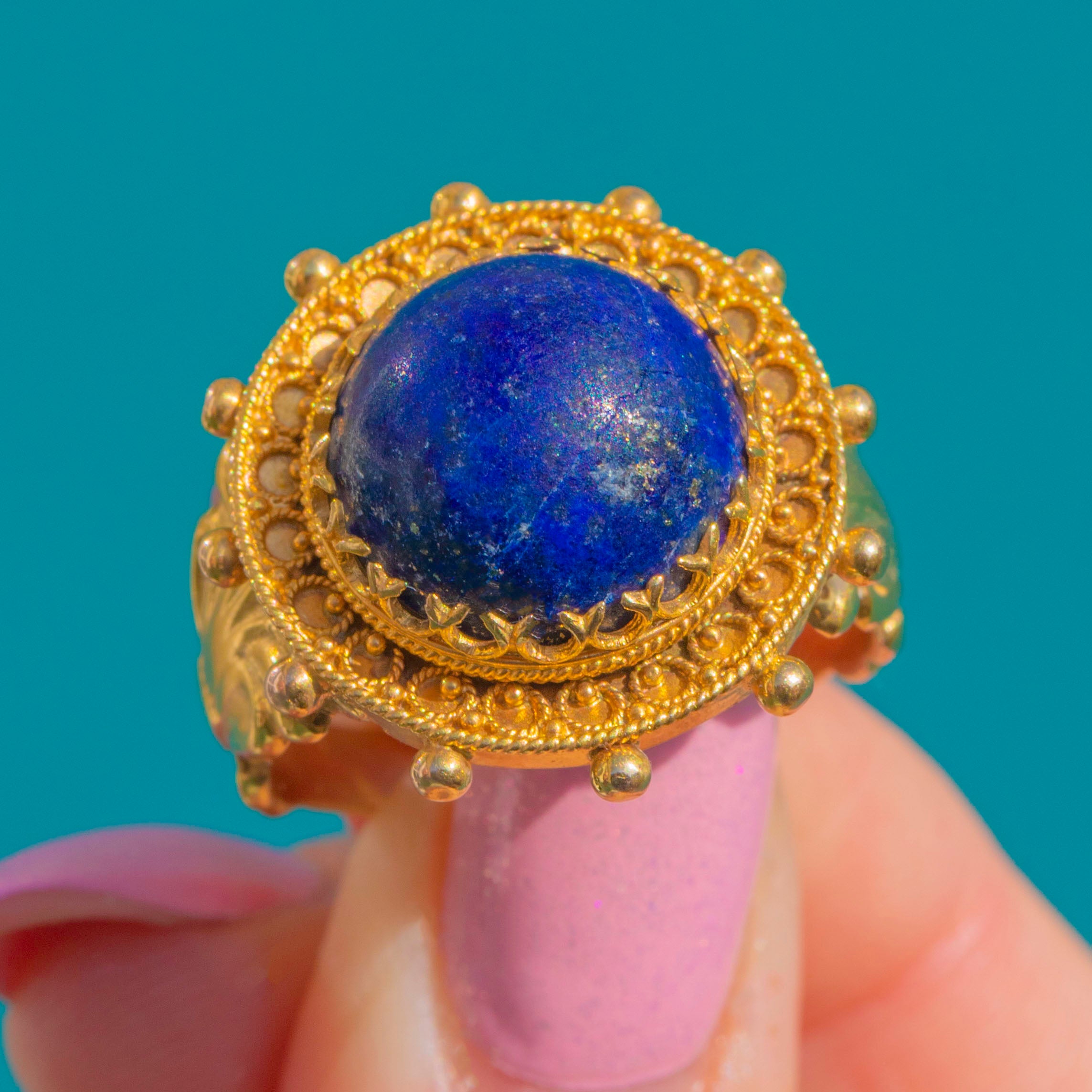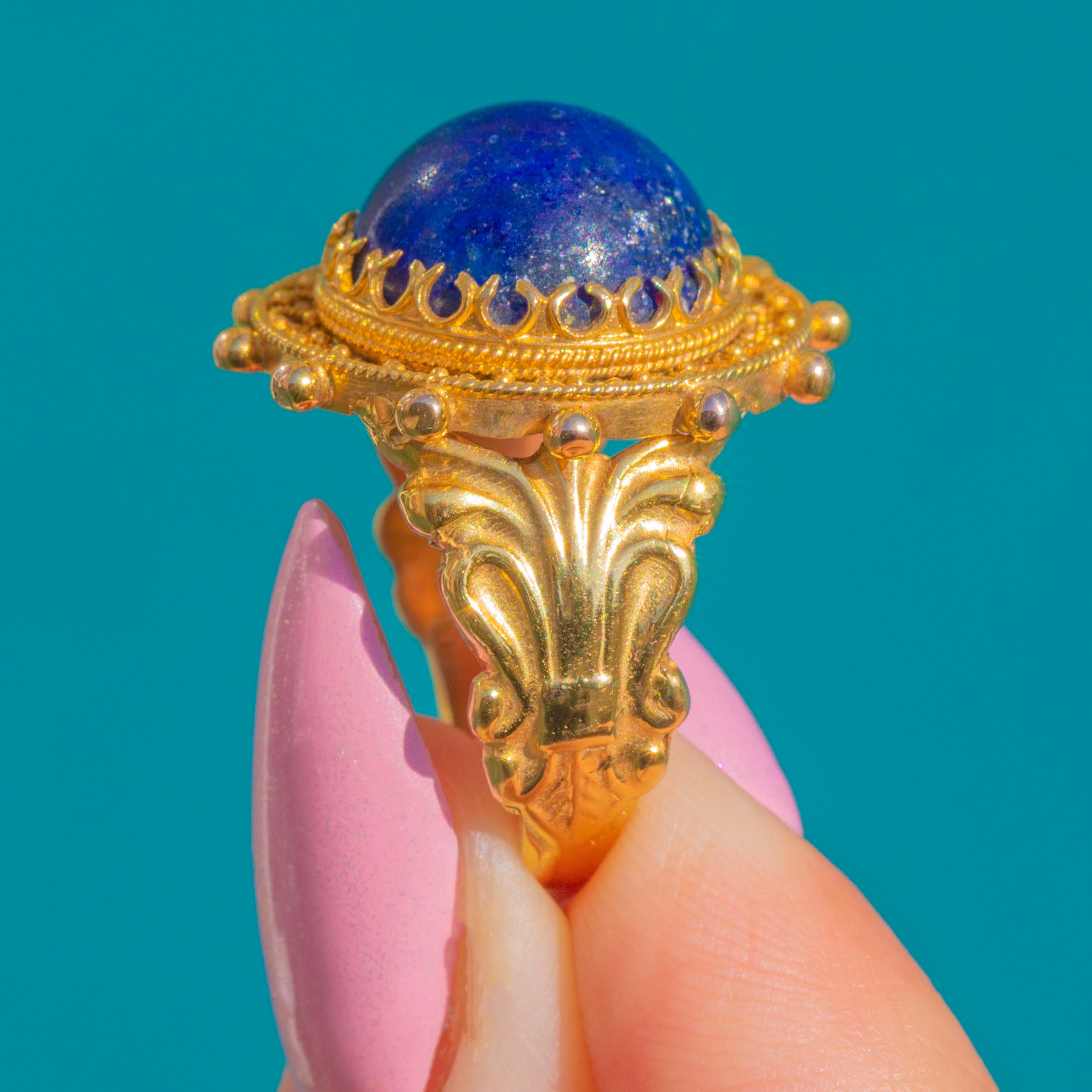 A richly ornate Victorian Etruscan Revival ring, crafted in glowing 15ct Gold and crowned with a vivid Lapis Lazuli cabochon. The domed blue gemstone brings celestial depth to the design, with natural golden flecks echoing the warmth of the surrounding Gold work.
