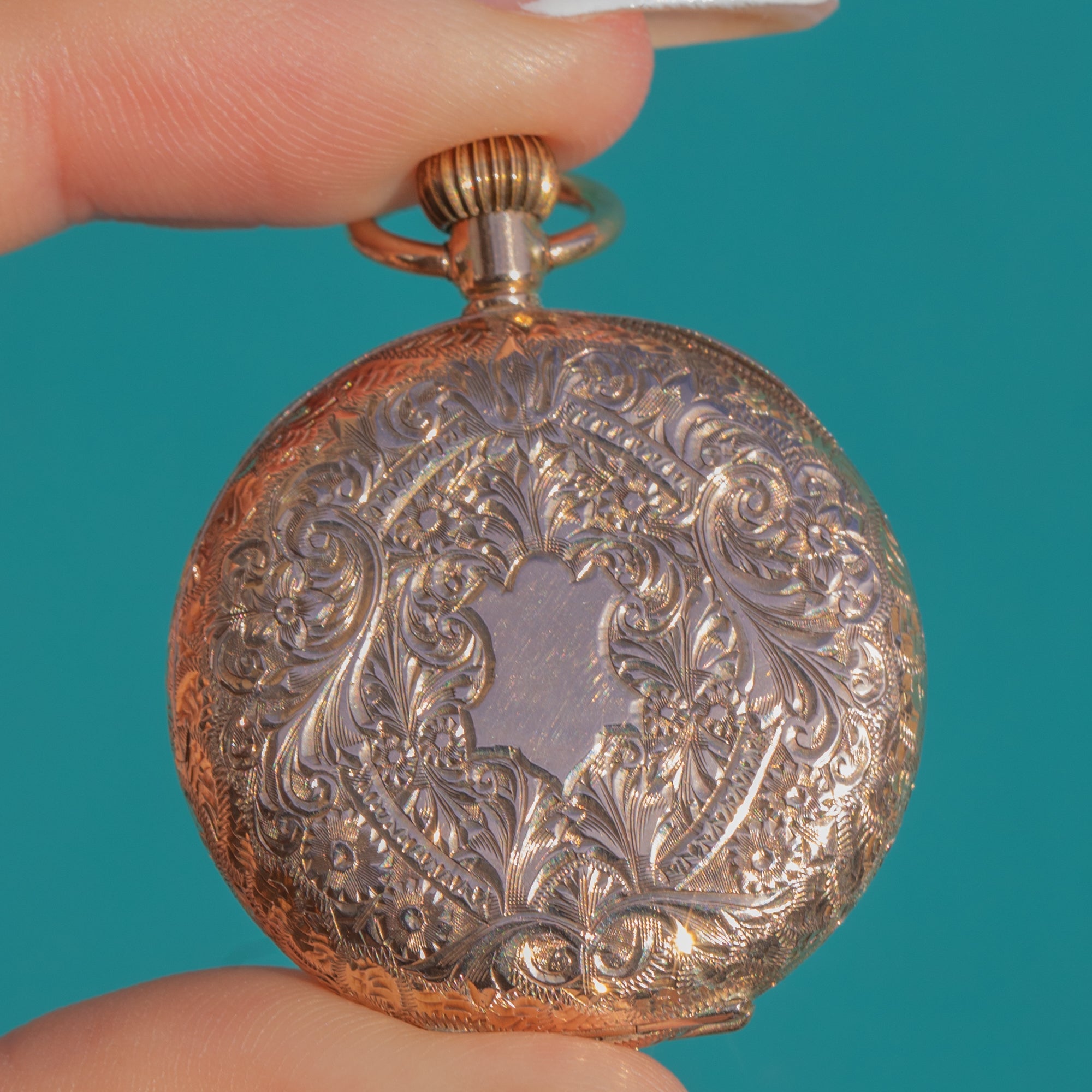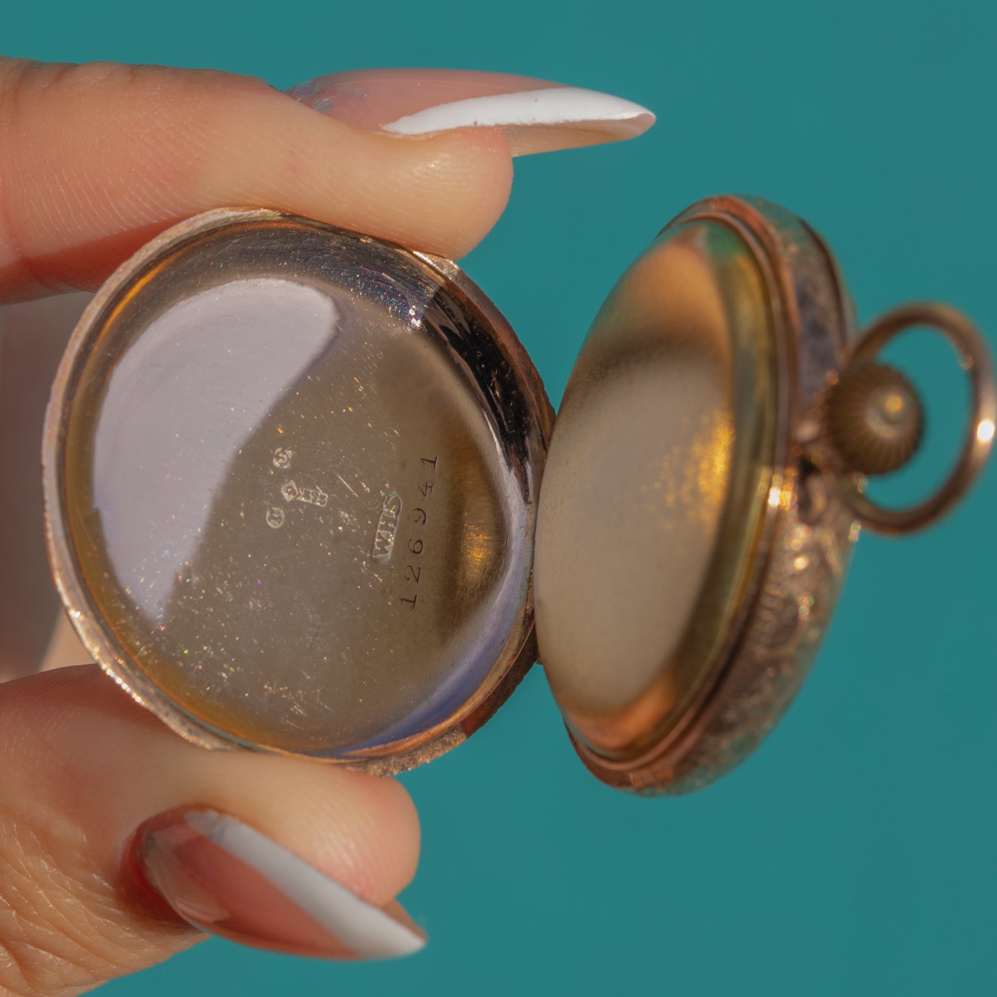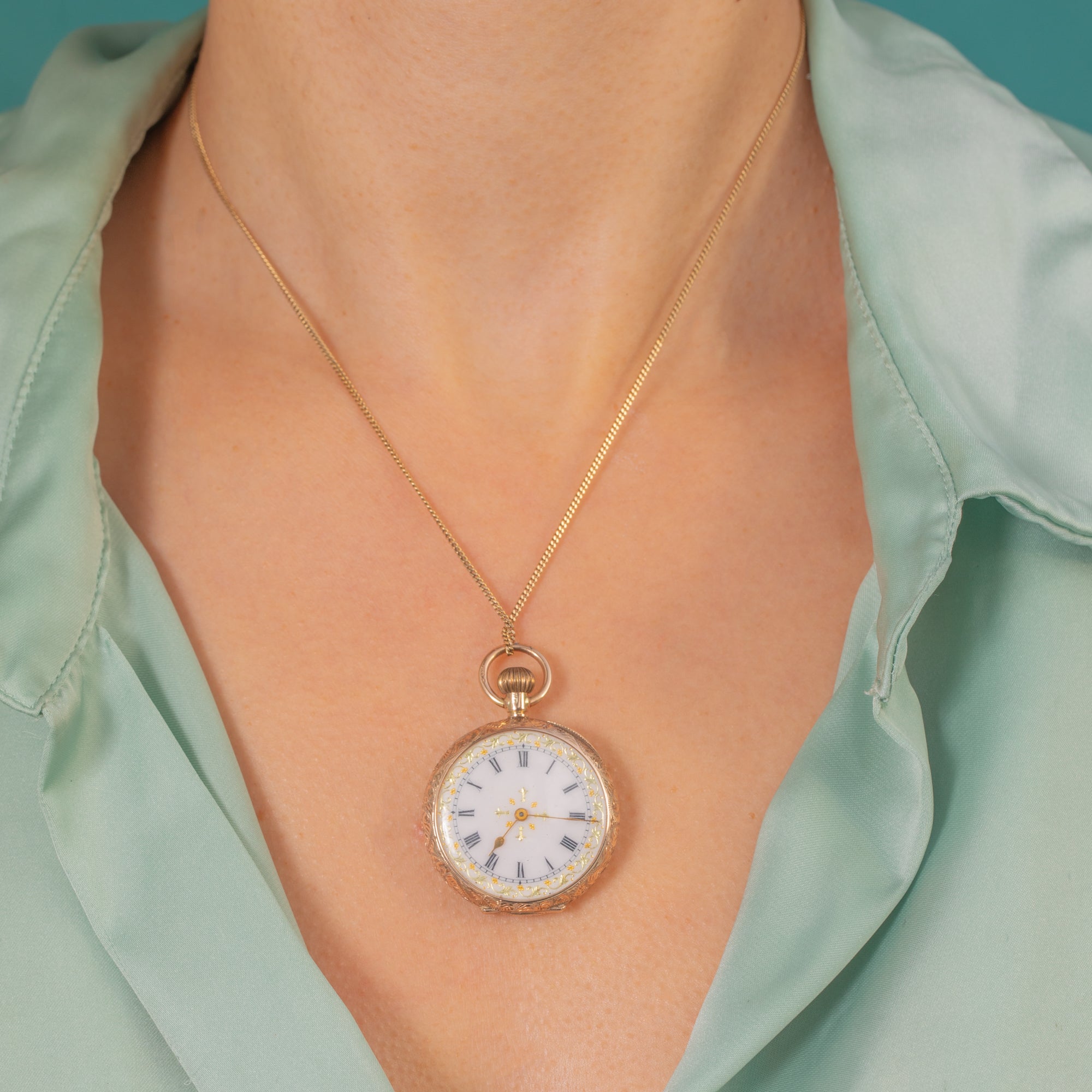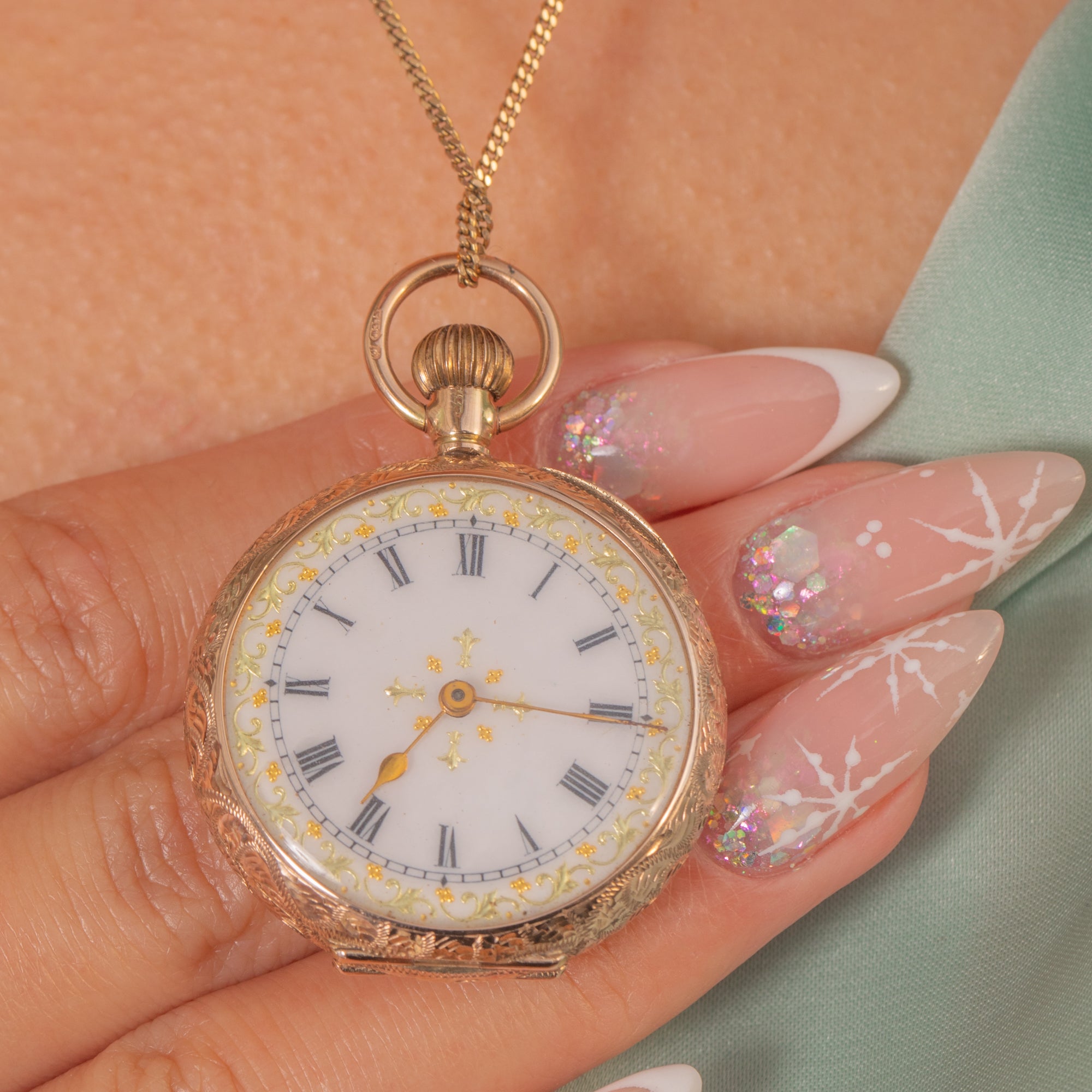This exquisite Post-Edwardian pocket watch pendant dates to 1912 and is full of early 20th-century charm. The white Enamel dial features crisp Roman numerals and tiny golden flourishes, giving it a delicate, refined aesthetic. The warm 9ct Gold case is beautifully engraved with ornate foliate patterns, catching the light with every movement.