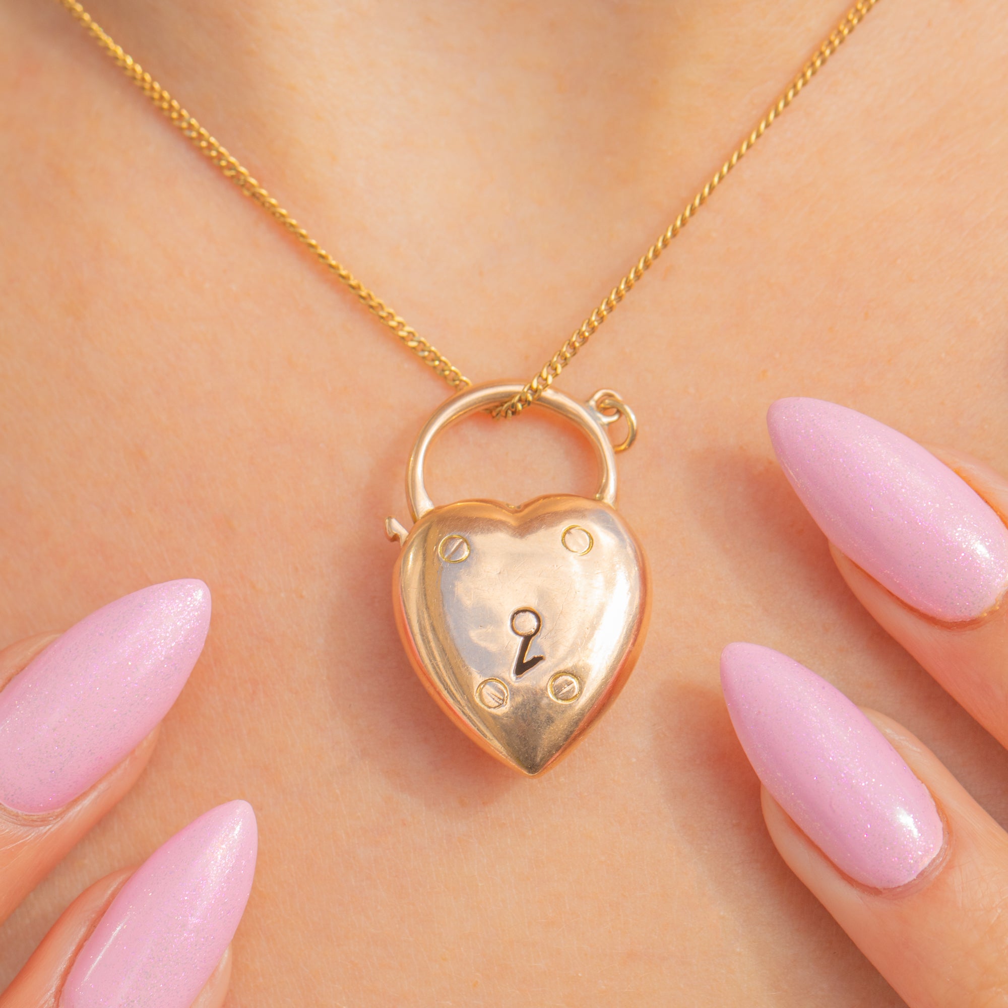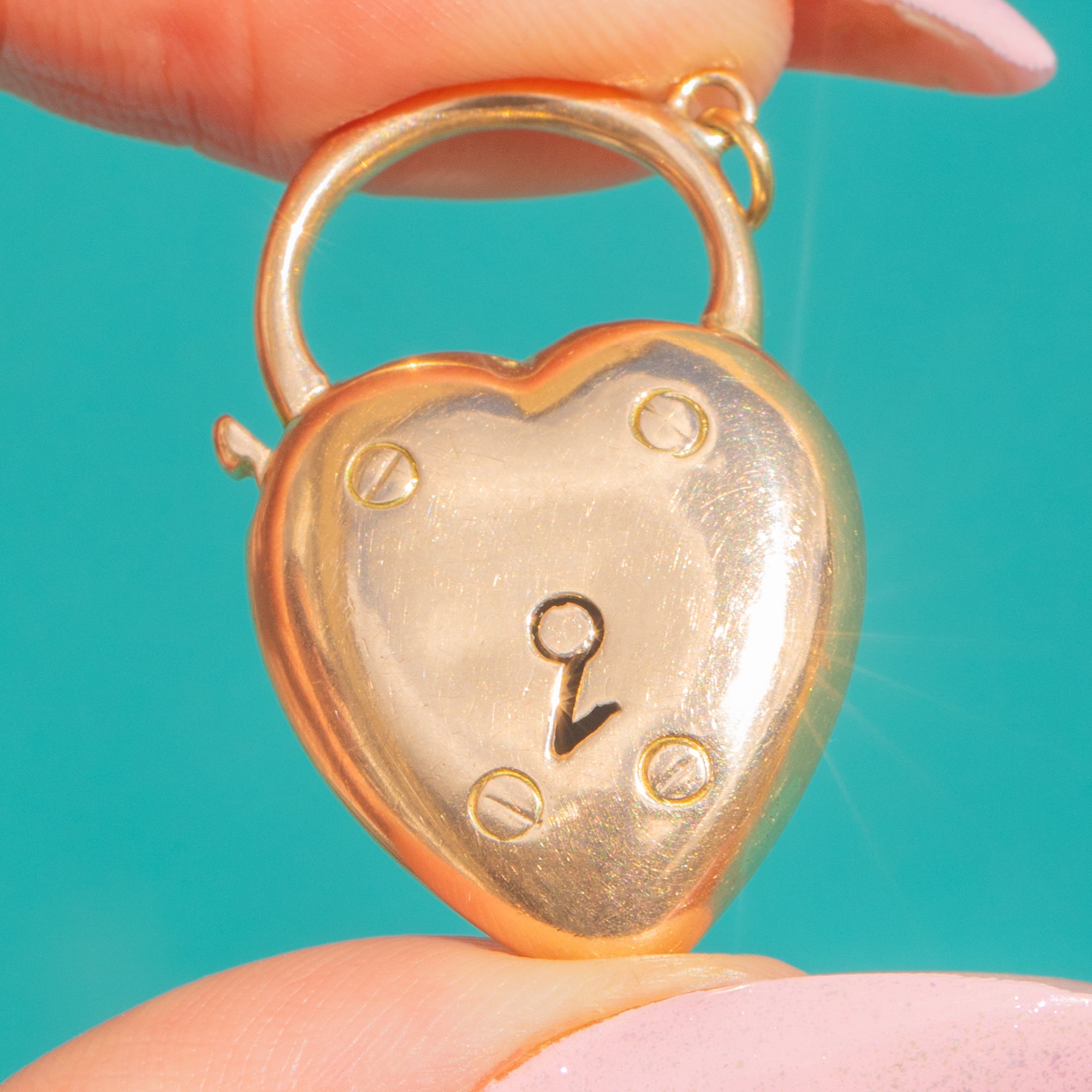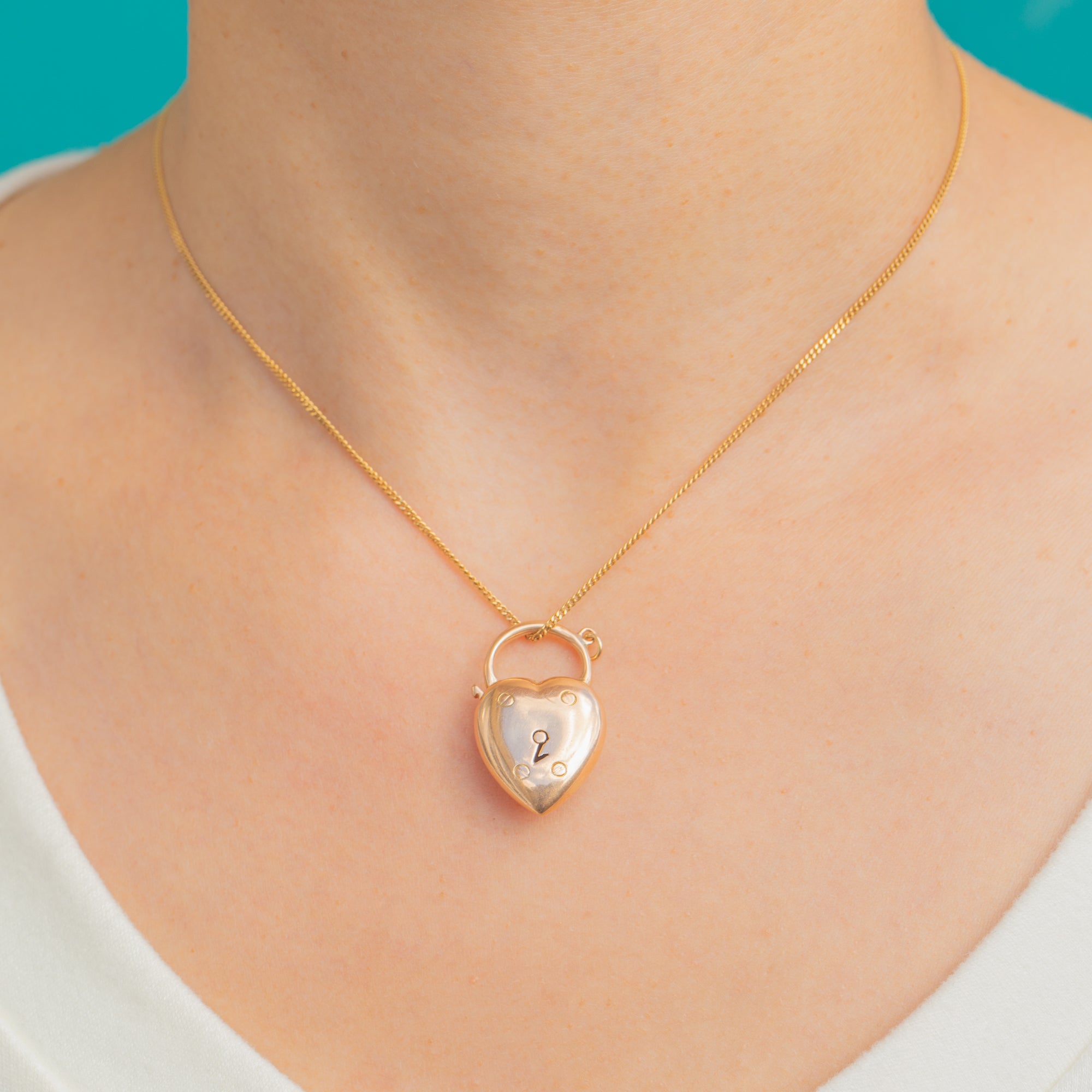 Sweet, simple and so evocative, this Victorian puffy heart padlock is crafted in glowing 15ct Gold. Its smooth, domed face is punctuated by a stylised keyhole and four petite screw-head motifs, balancing romance with a whisper of industrial charm. The rounded shackle acts as the bail, giving this classic padlock form an elegant, wearable finish.