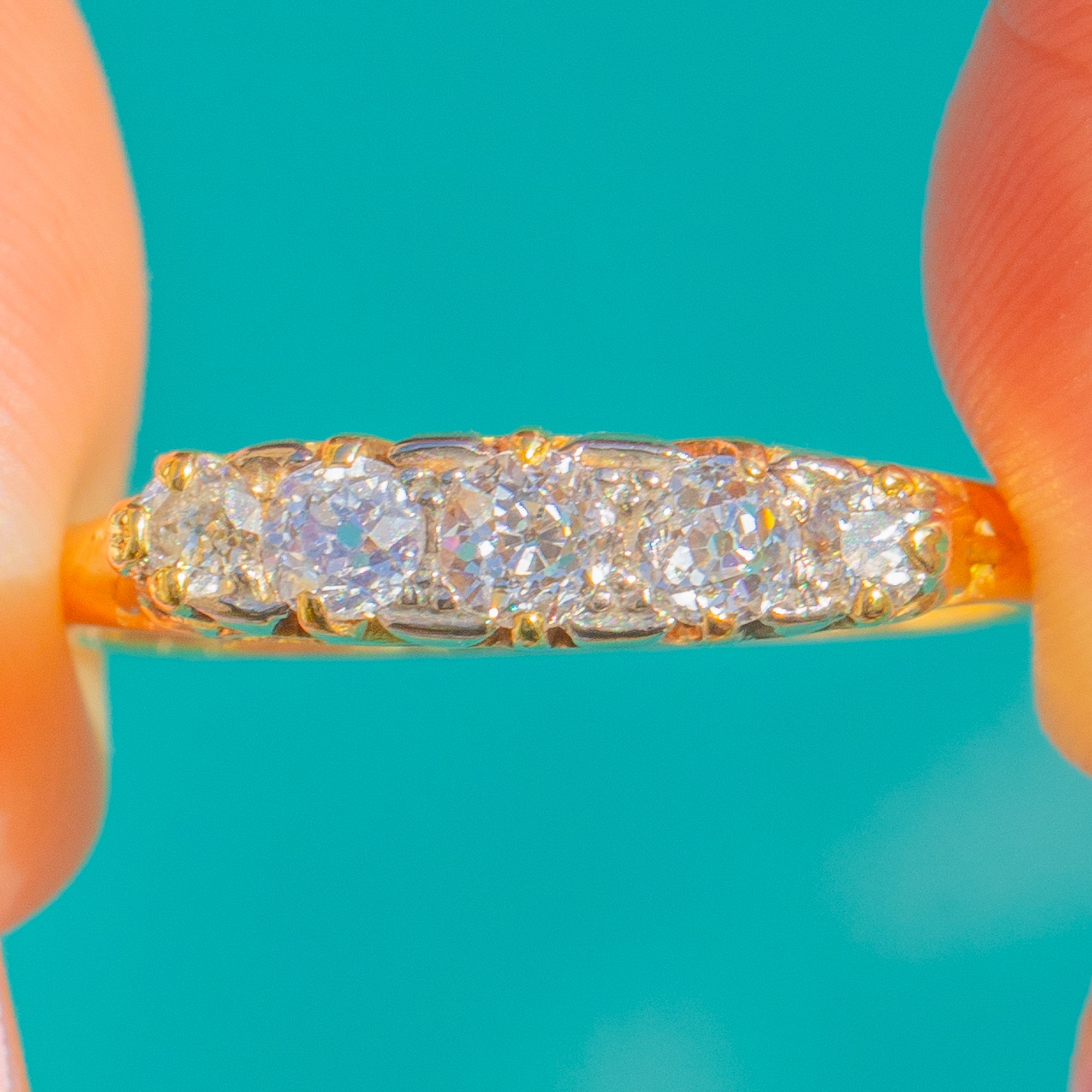 A timeless Edwardian five-stone Diamond ring, beautifully crafted in rich 18ct Gold. Five Old Mine Cut Diamonds glint in an elegant linear arrangement, their bright fire enhanced by a slim, ornate crown.