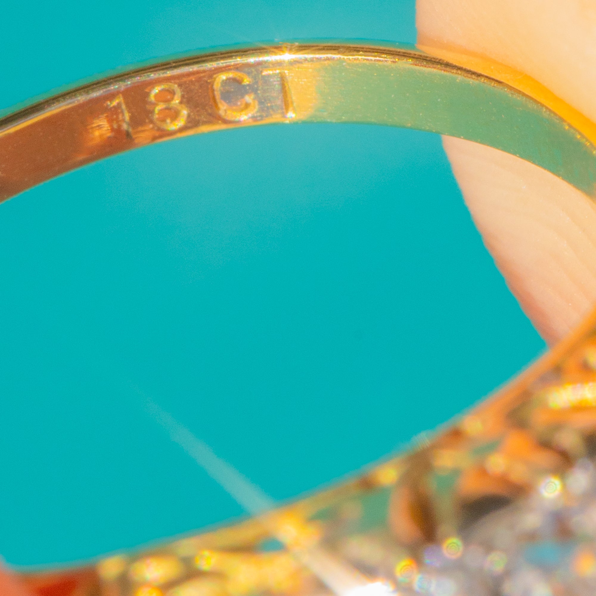 EXCELLENT: The Diamonds are bright and secure with no obvious chips or abrasions visible. The slim 18ct Gold shank and decorative settings are crisp with only light surface wear. No clear evidence of resizing or restoration is visible.