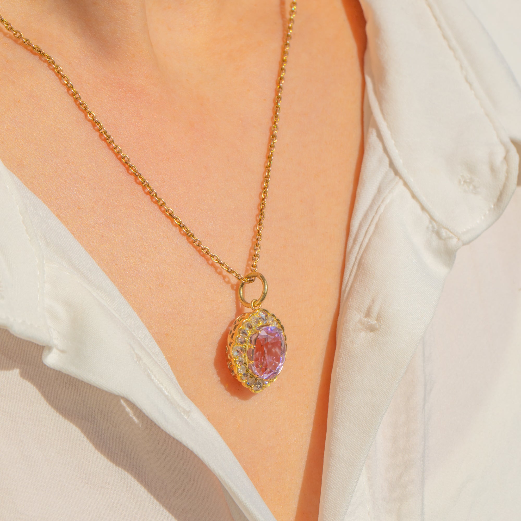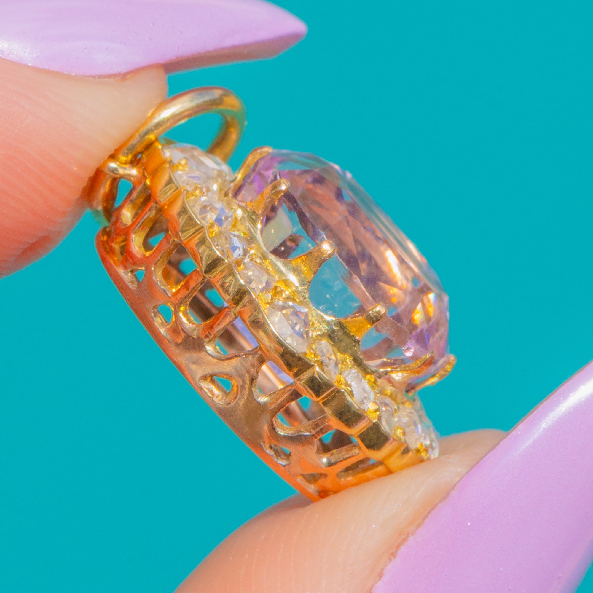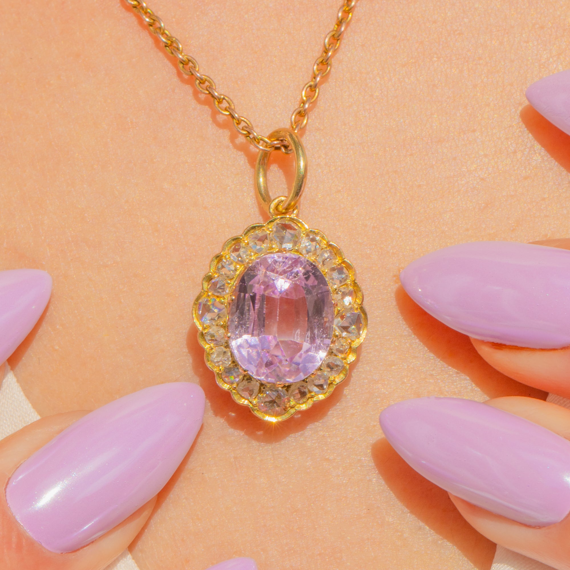 A luminous 3.80ct Natural Kunzite in romantic pink-lilac takes centre stage, framed by a 0.40ct halo of twinkling rose-cut Diamonds in warm 15ct Gold. The scalloped cluster silhouette and delicate openwork feel speak to the refined elegance of the Late Victorian to Edwardian era, while the pastel glow of Kunzite brings a soft, ethereal allure. As with all Rose cuts, their irregular facet patterns make precise carat estimates challenging; the Diamond weight given is our best assessment while the stones remain mounted.