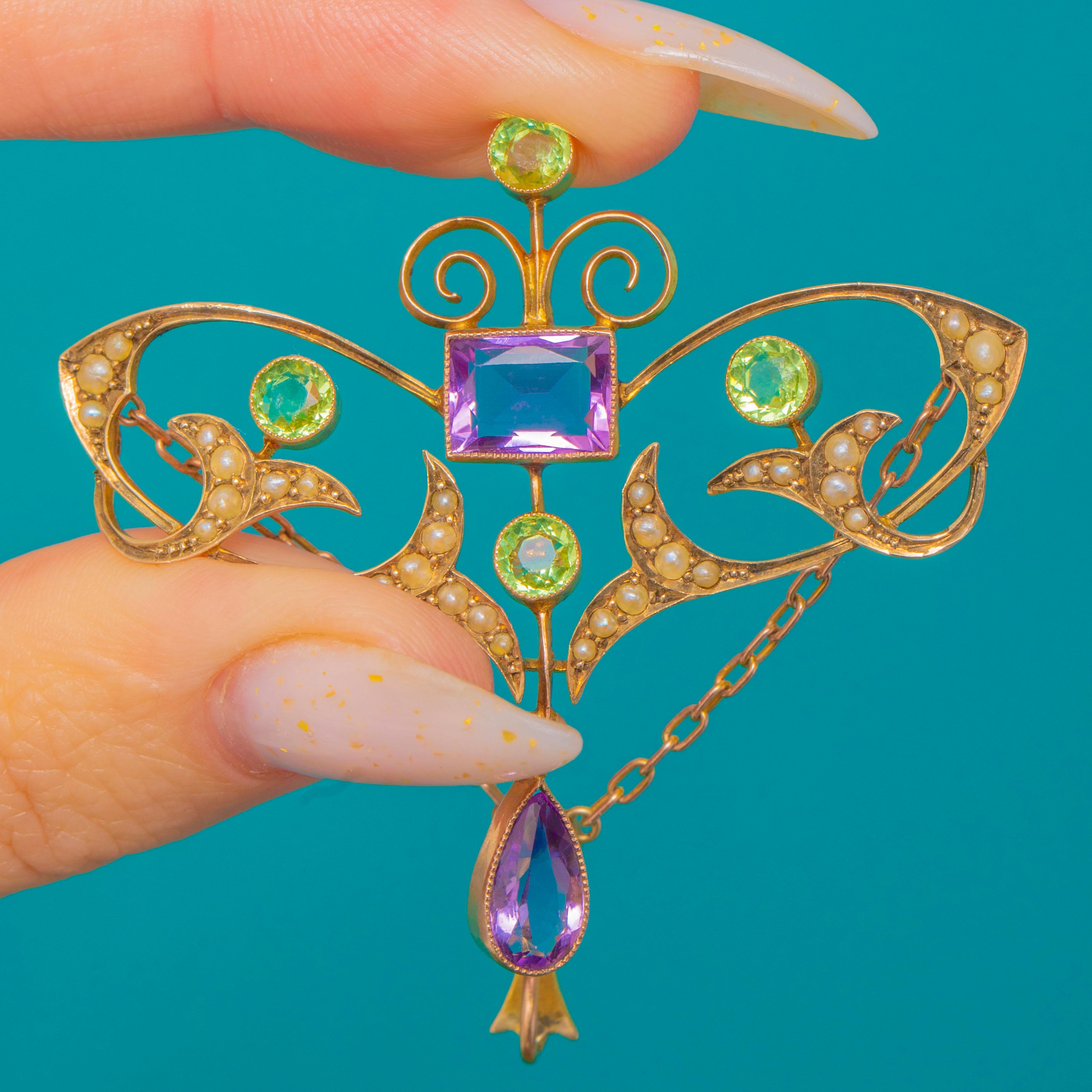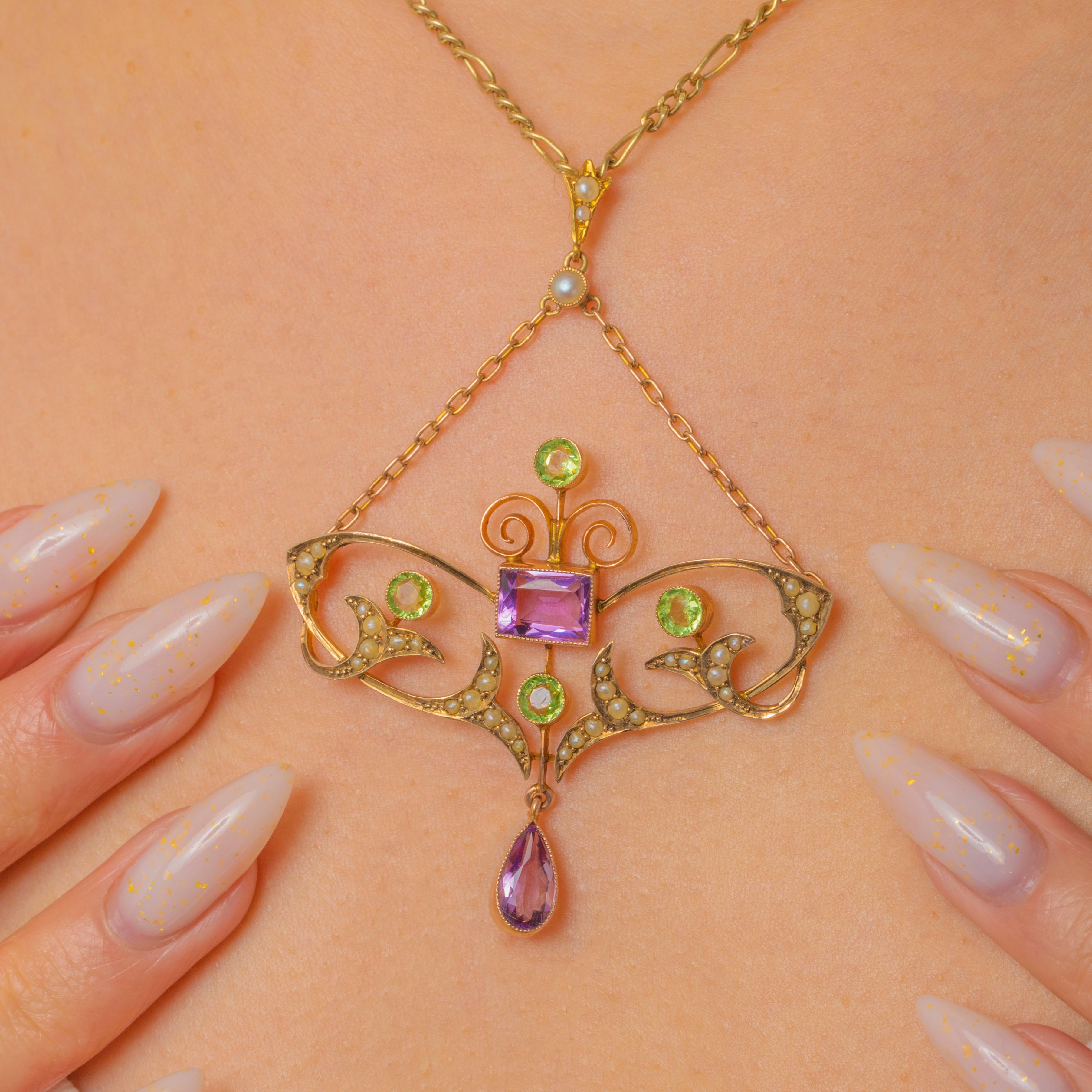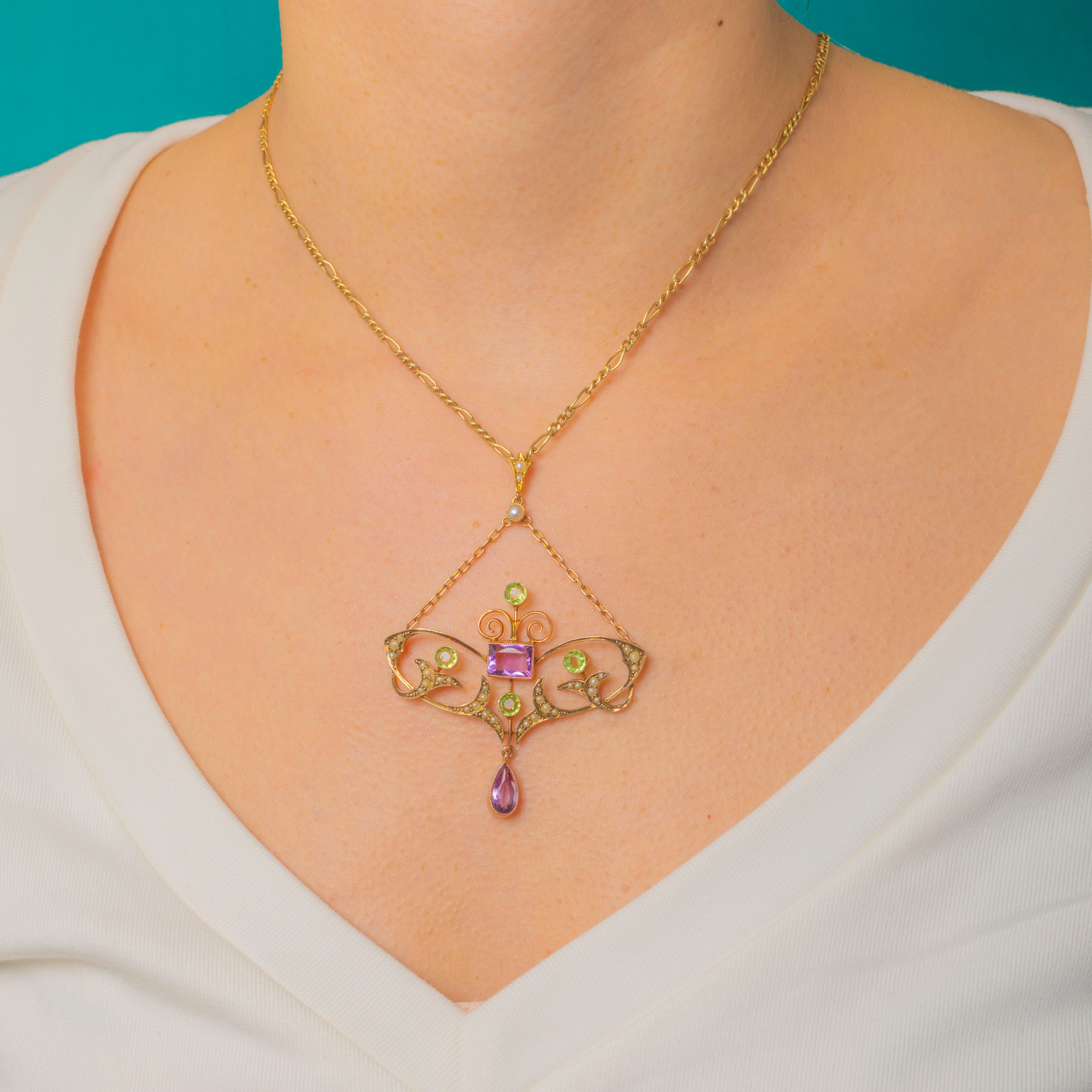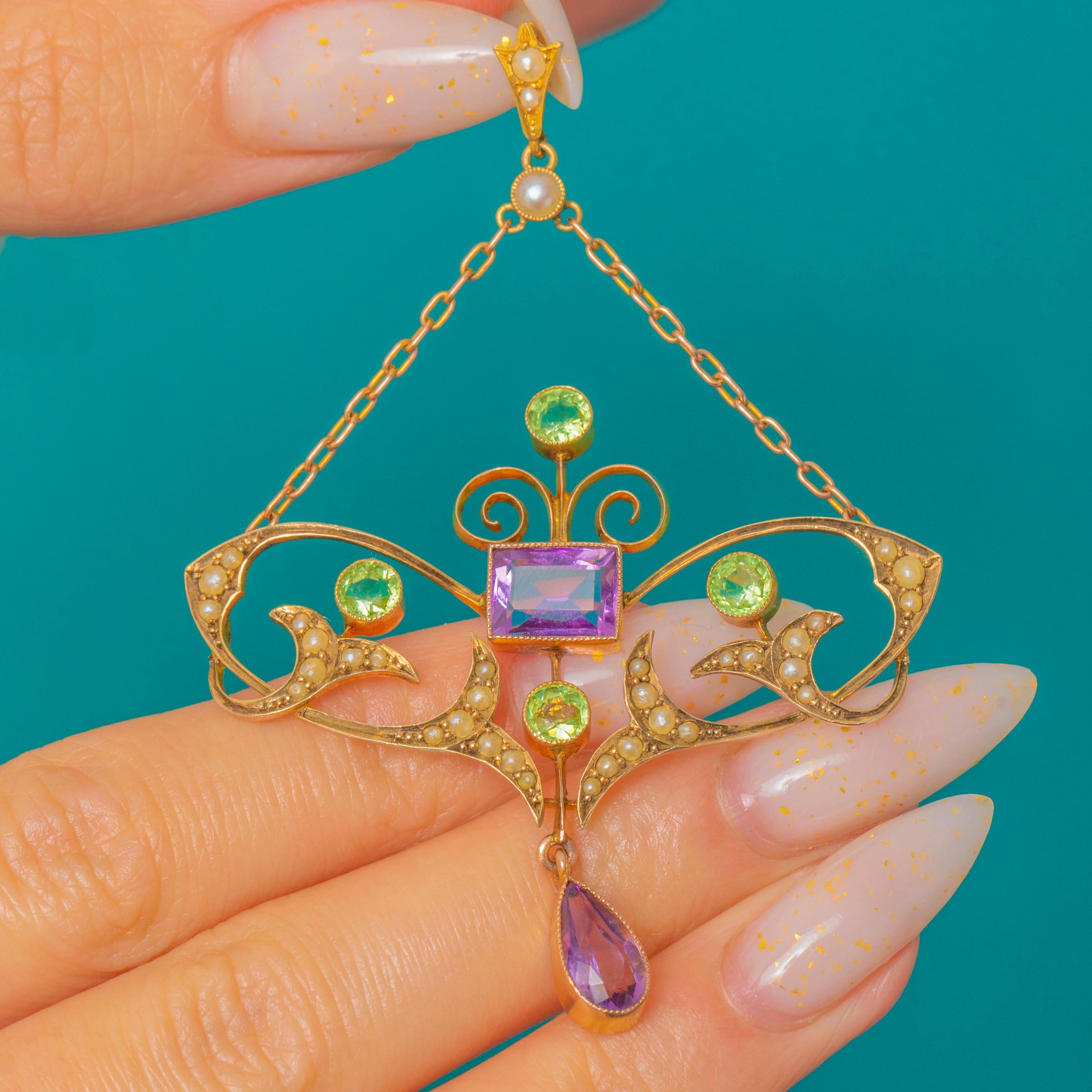 A rare Suffragette drop pendant alive with the iconic palette of purple, green and white. A rich rectangular Amethyst anchors the design, framed by scrolling openwork and crescents of creamy Seed Pearls, with bright, lively Peridots adding fresh green sparkle. A pear-shaped Amethyst is articulated below for graceful movement, with fine milgrain-style beading and hand-finished wirework creating an airy, romantic silhouette.