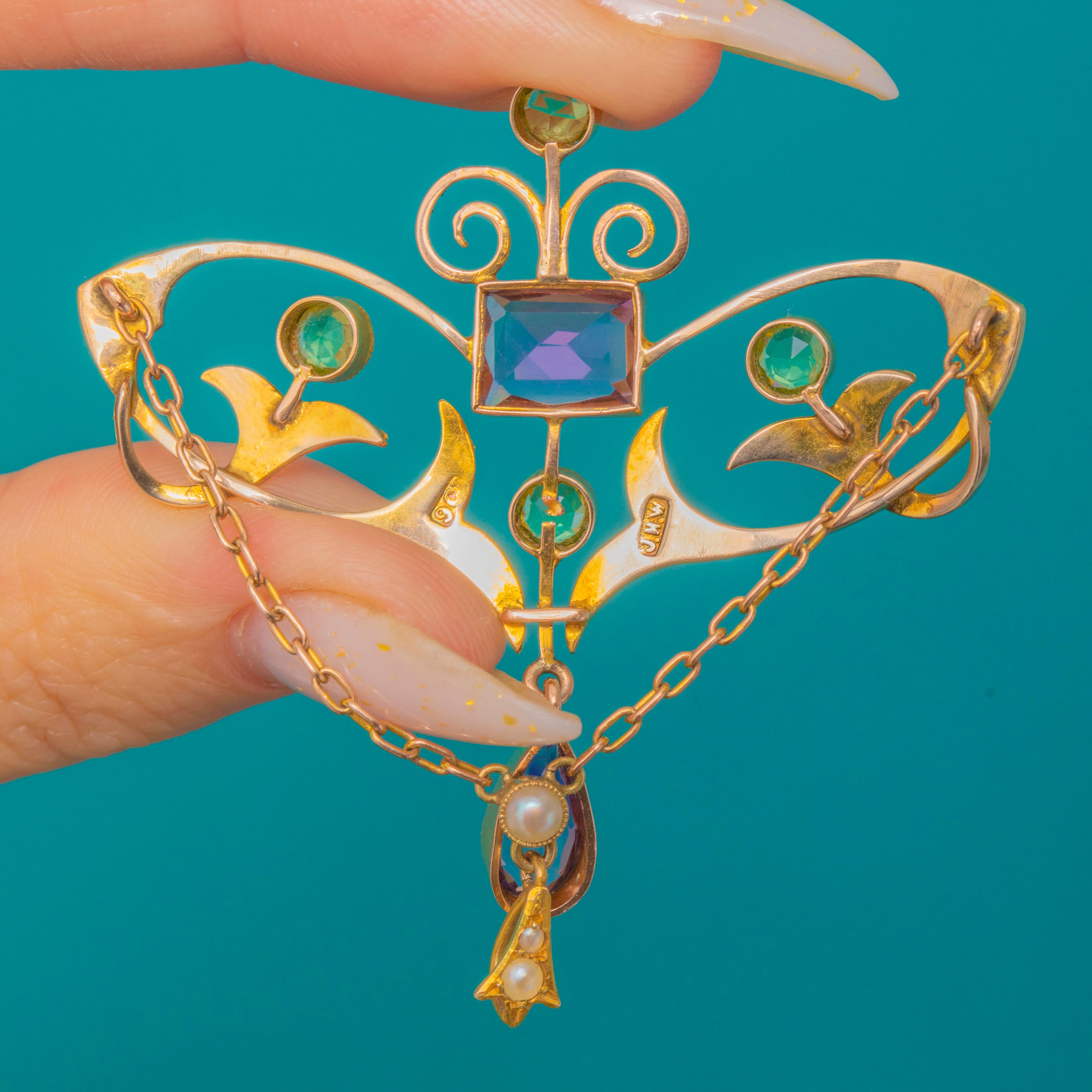 RARE 9ct Gold Suffragette Amethyst Peridot Pearl Drop Pendant c.1900-1915