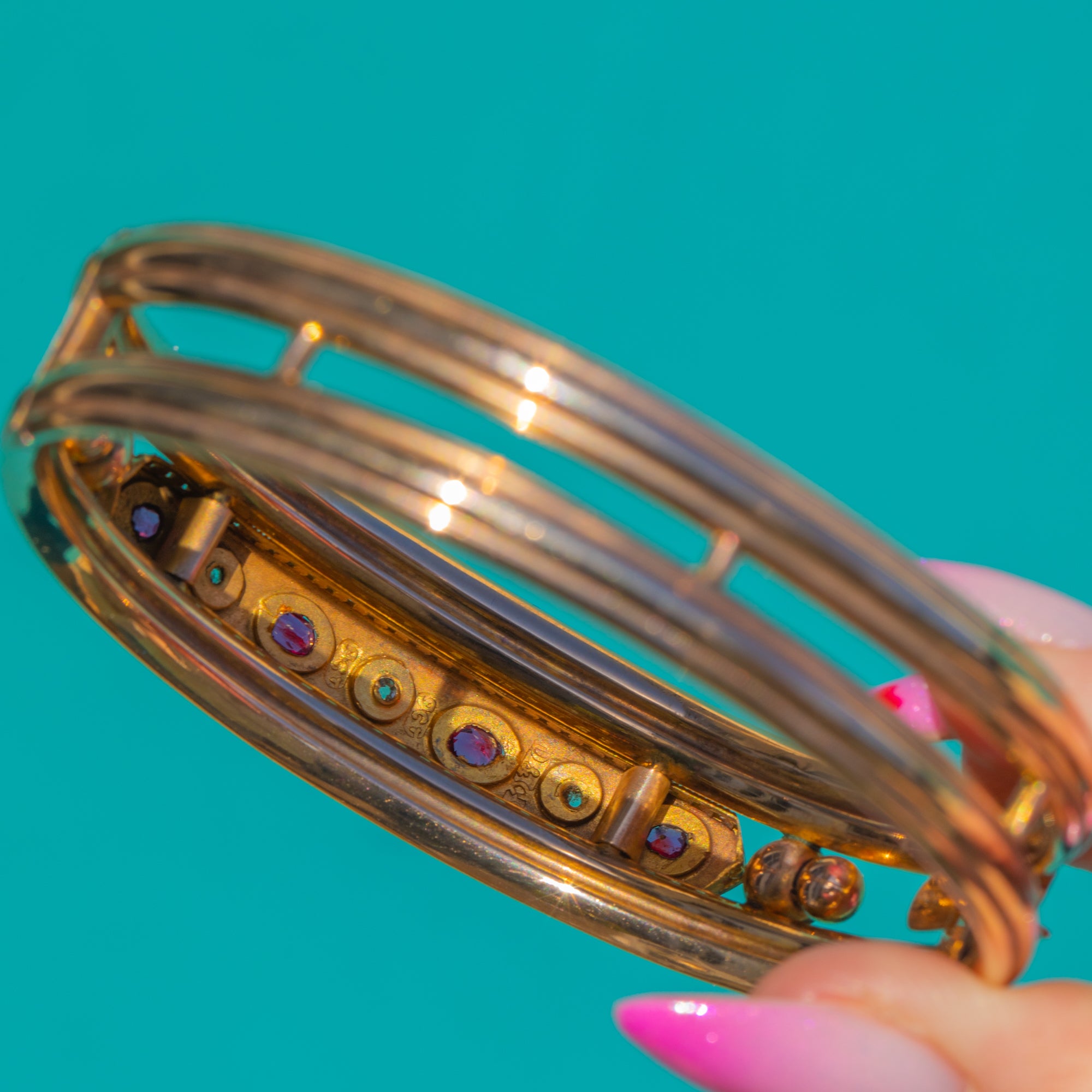 A refined Victorian 9ct Gold hinged bangle, star-set with a rhythmic line of Rubies and twinkling Diamonds. The raised central panel presents a subtle two‑tone look against the warmer Gold rails, each gemstone framed by crisp, engraved eight‑point stars for that quintessential late‑19th century sparkle.