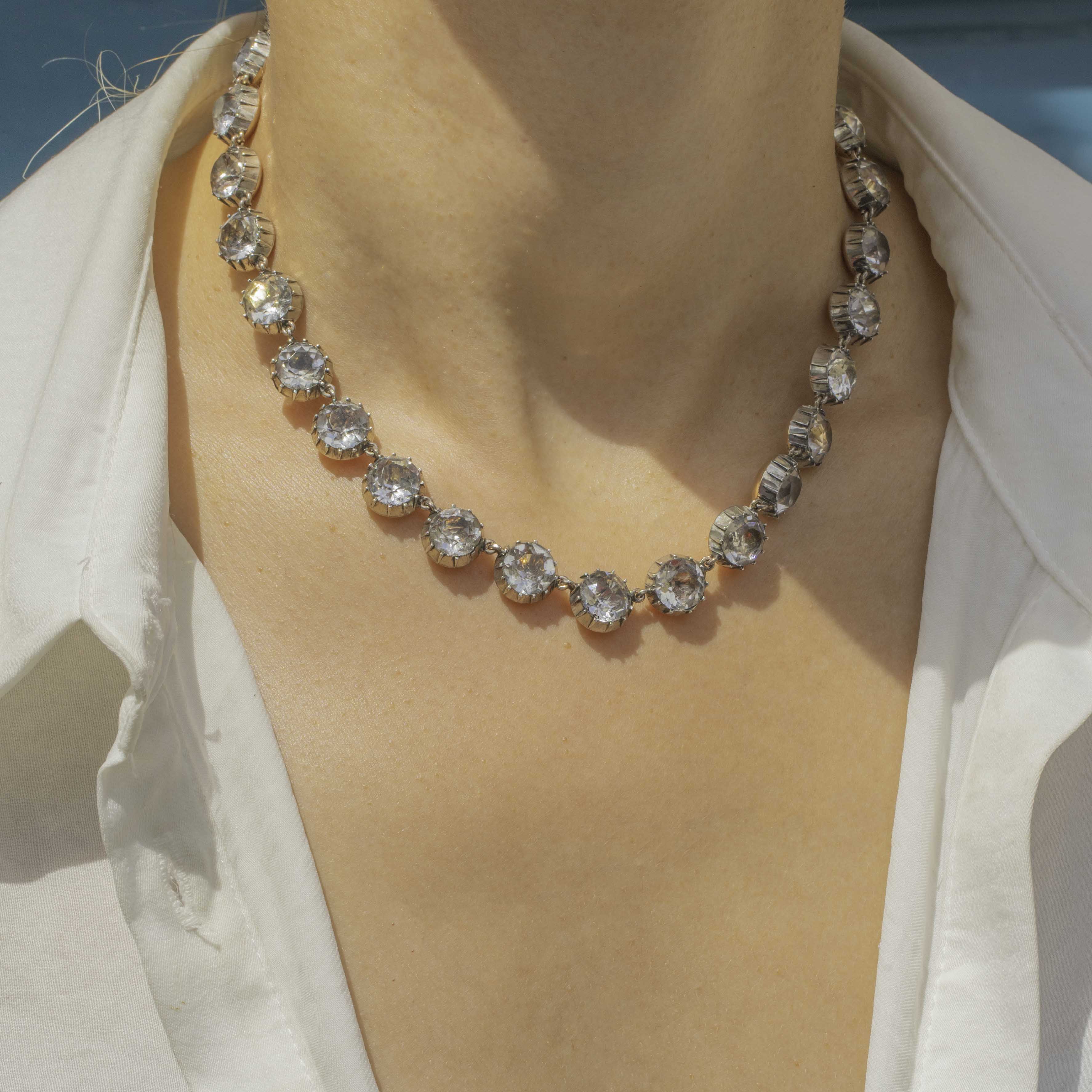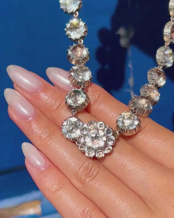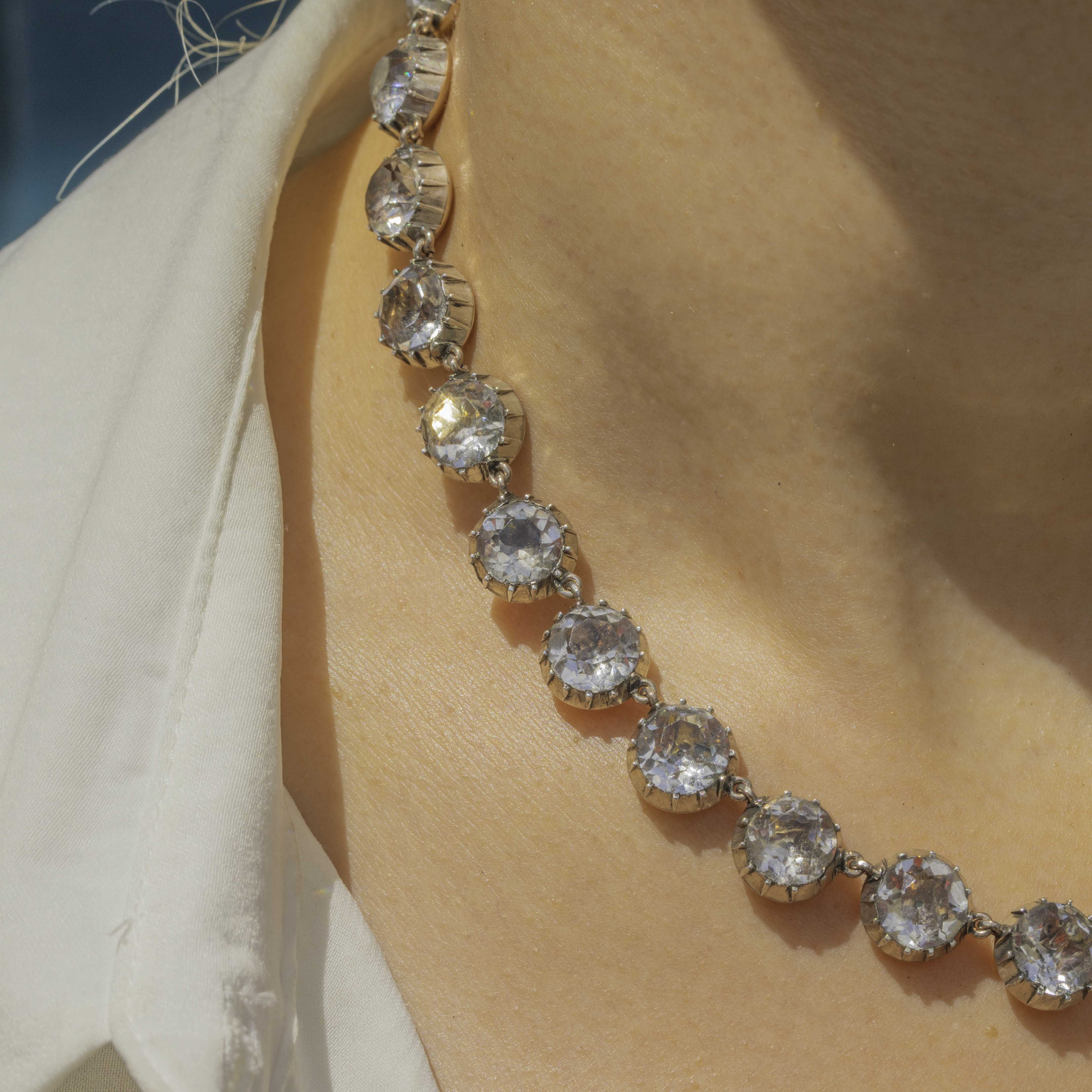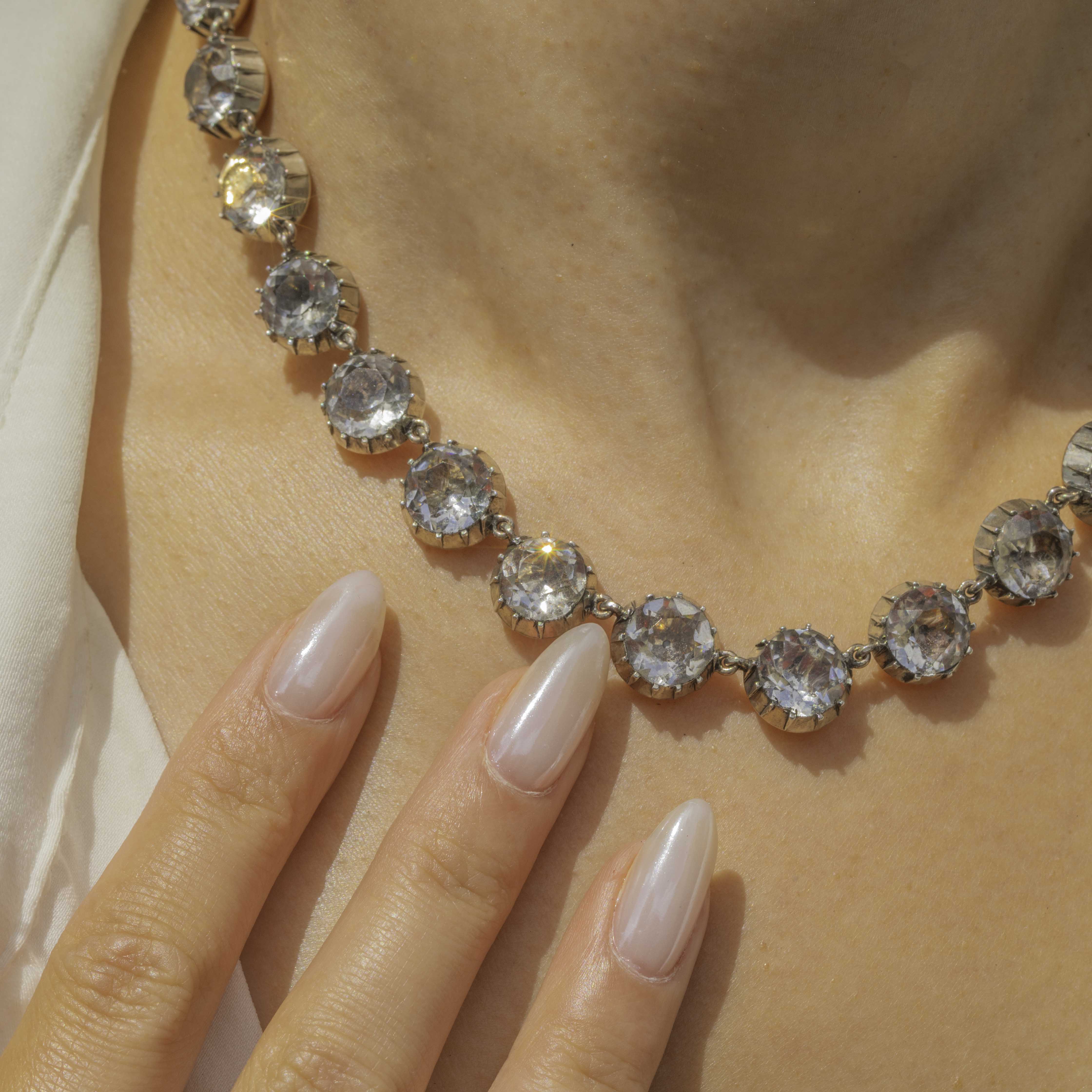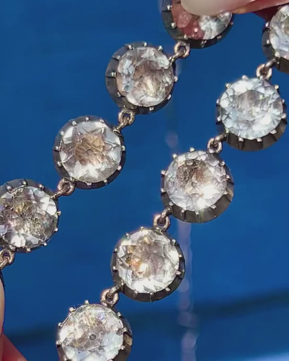 VERY GOOD-EXCELLENT. Each of the Paste gemstones is secure in its traditional piecrust setting, complete with 9ct Gold domed backs for comfortable wear. There is some slight variation in colour to the foils behind a few of the Paste gemstones and a few surface marks on some of the facets, but this is only noticeable under close inspection. The Silver has a lovely lustre, and her piecrust settings have accrued an admirable patina for a dramatic finish, enhancing the sparkle of the gemstones! The tongue clasp is in perfect working order, allowing you to wear her confidently, whatever the occasion. Over 200 years old, we can't quite believe the incredible condition this Georgian necklace is in, a rare find for sure!