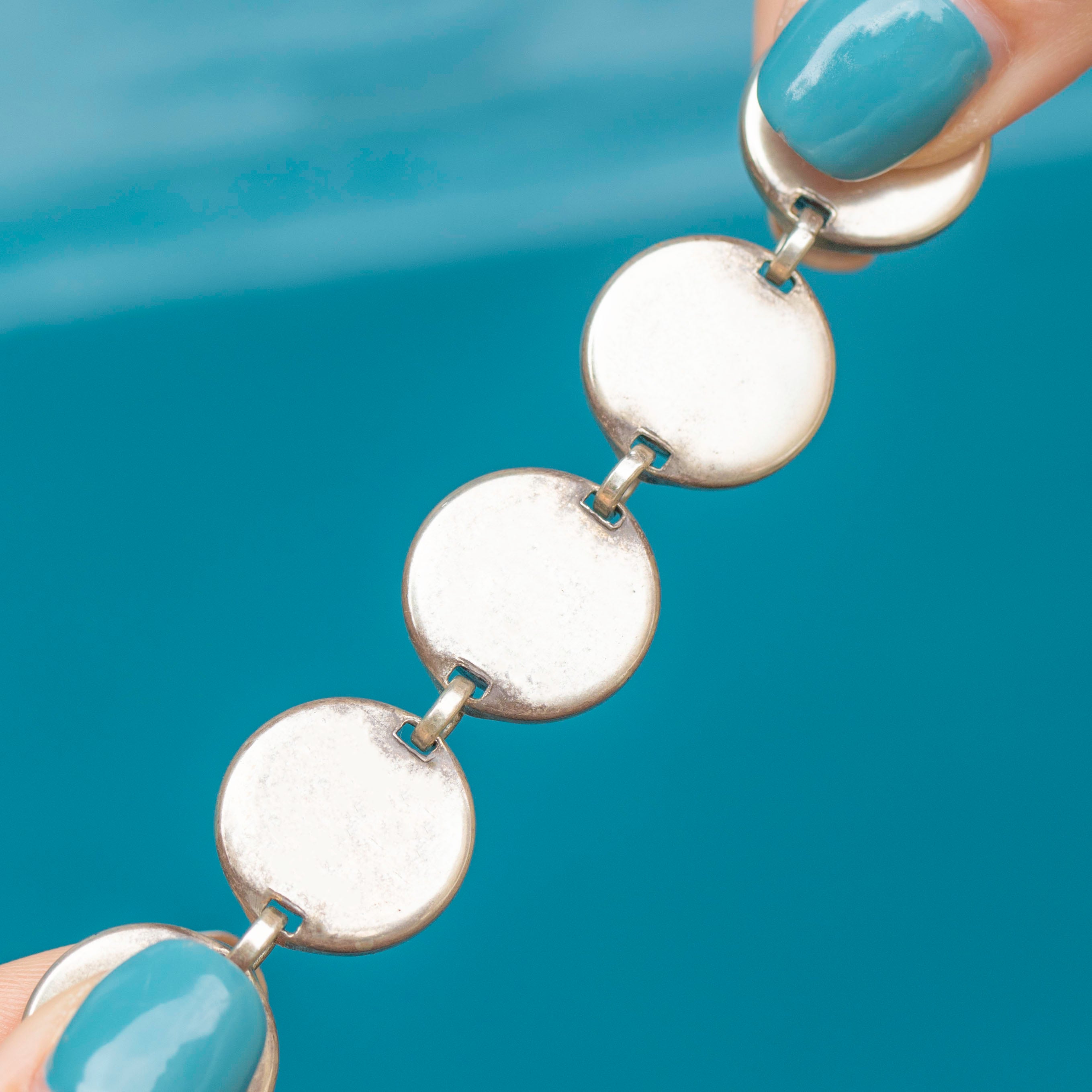EXCELLENT. This Art Deco Silver Rose Quartz cabochon bracelet is absolutely divine. Each Rose Quartz stone is securely set and smoothly domed, with no scuffs or chips to note. Each silver link is firmly affixed and has accrued an admirable patina creating a dramatic finish. With a fully functioning tongue clasp, you can wear this stand-out Art Deco bracelet with absolute confidence!