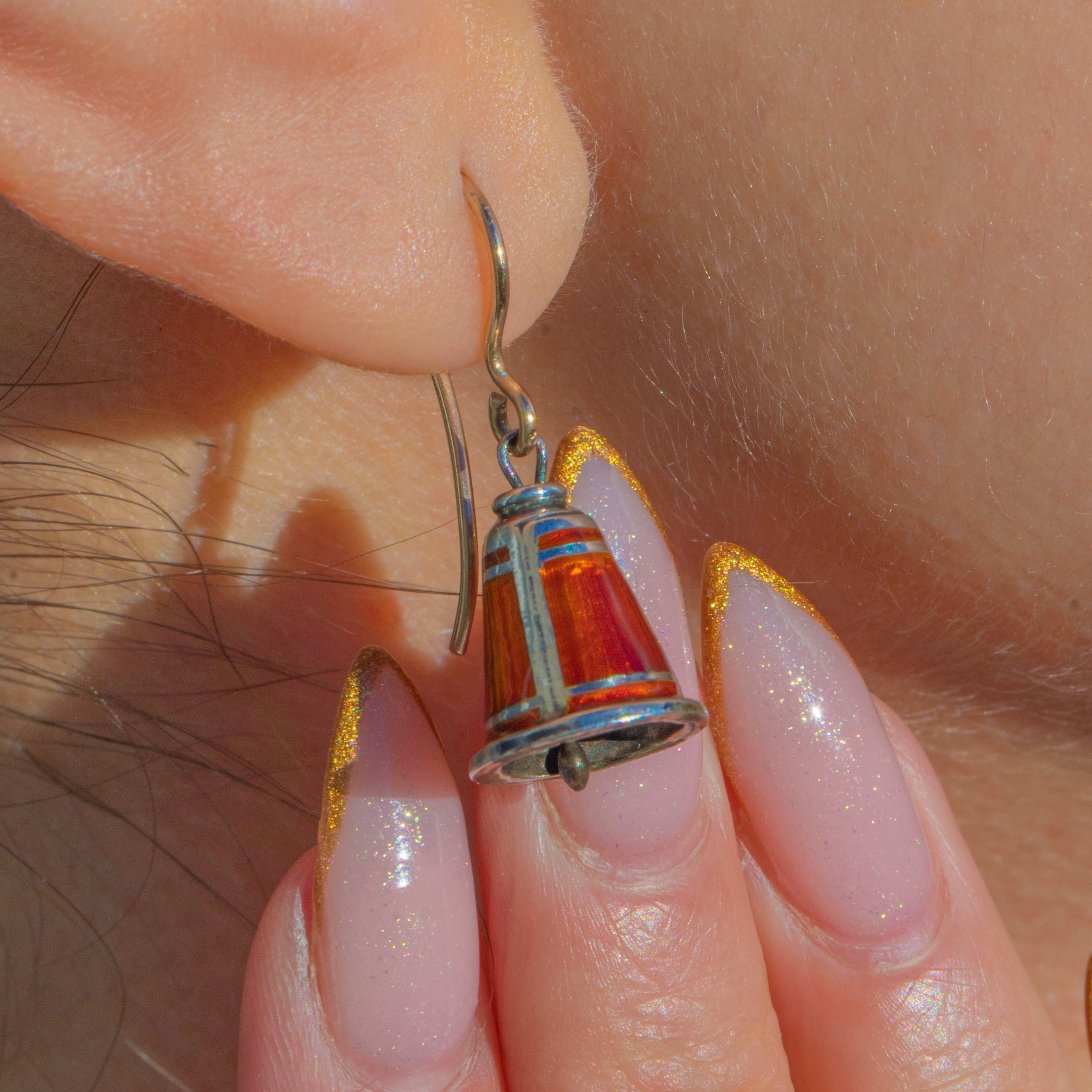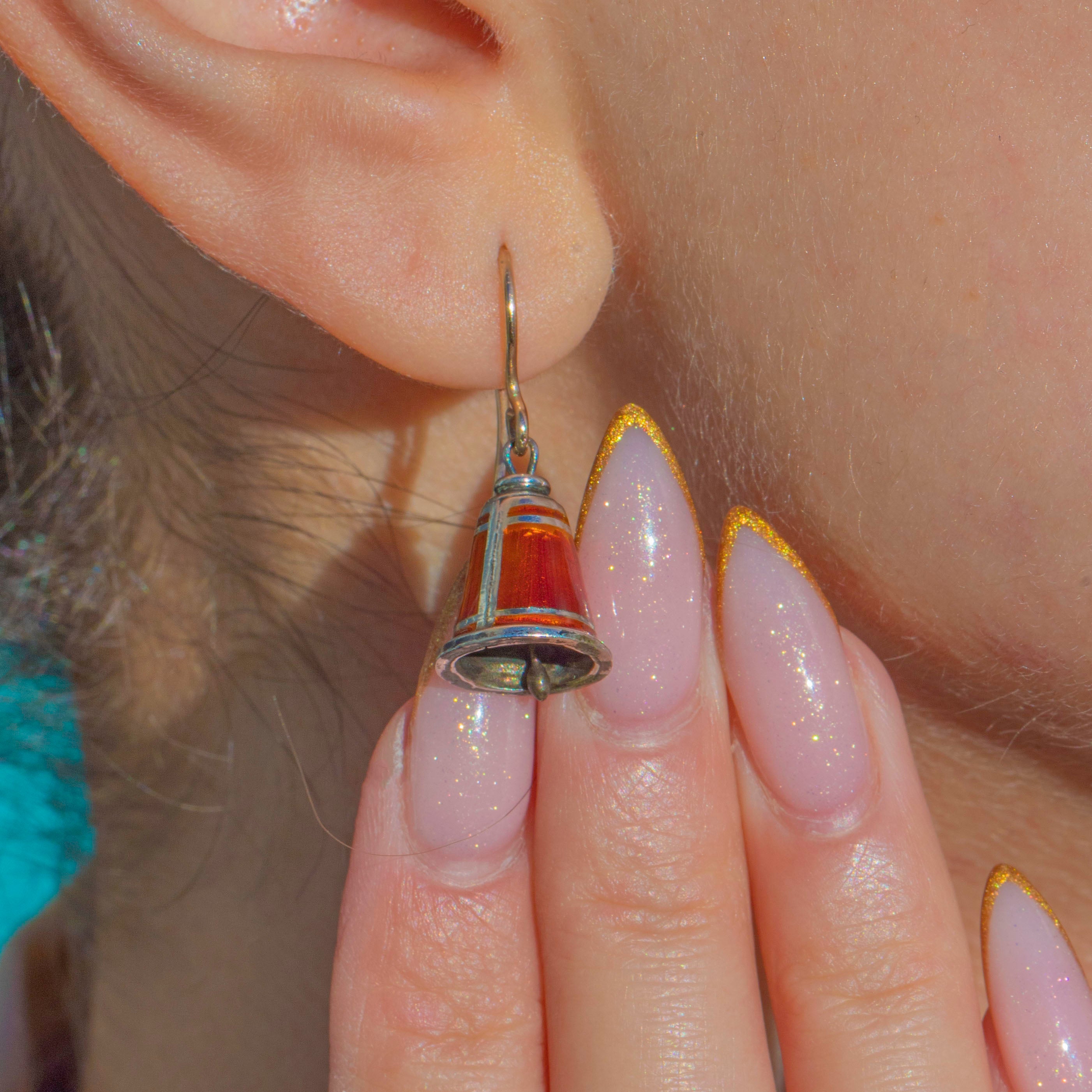Silver Red Enamel Bell Earrings, 9ct Gold Hooks