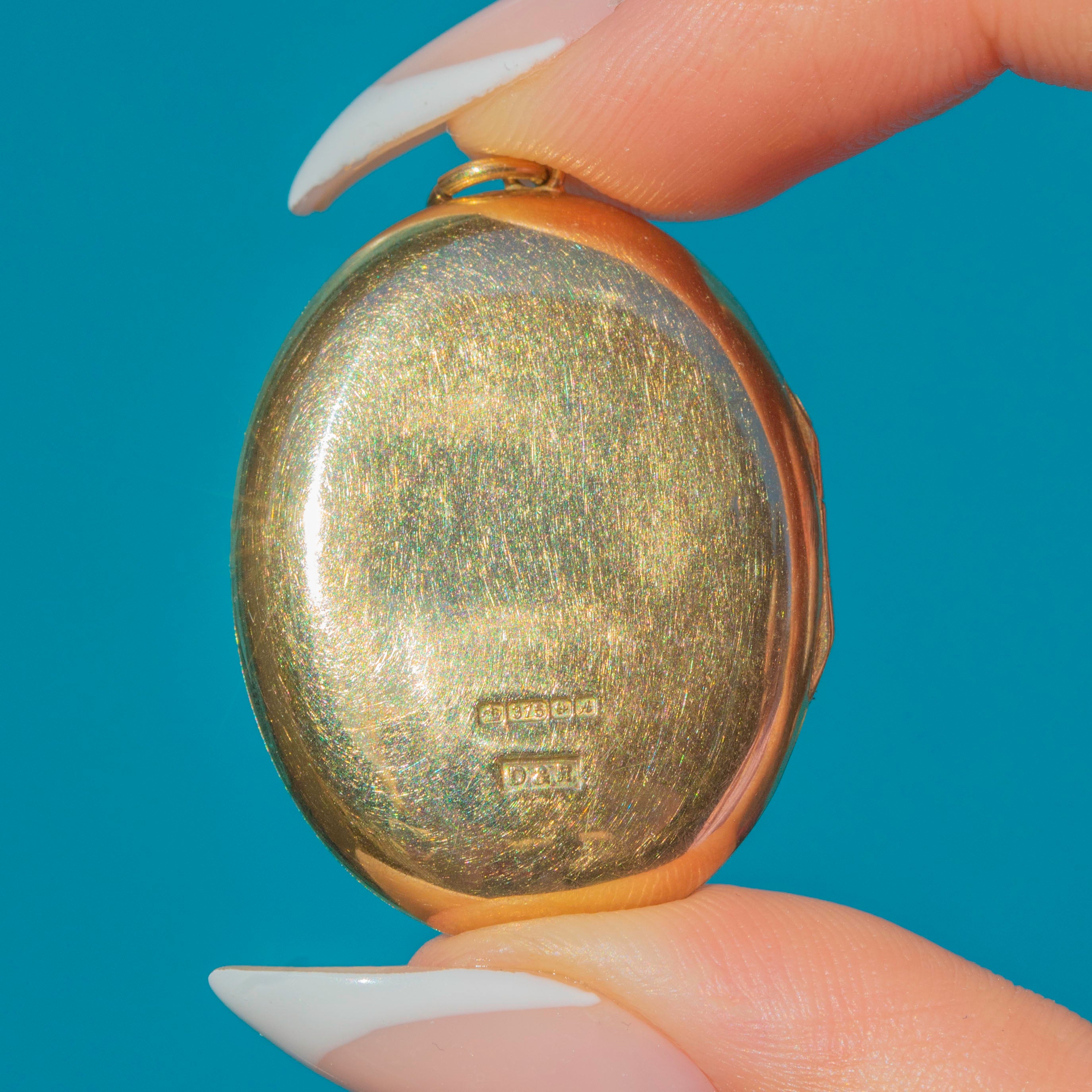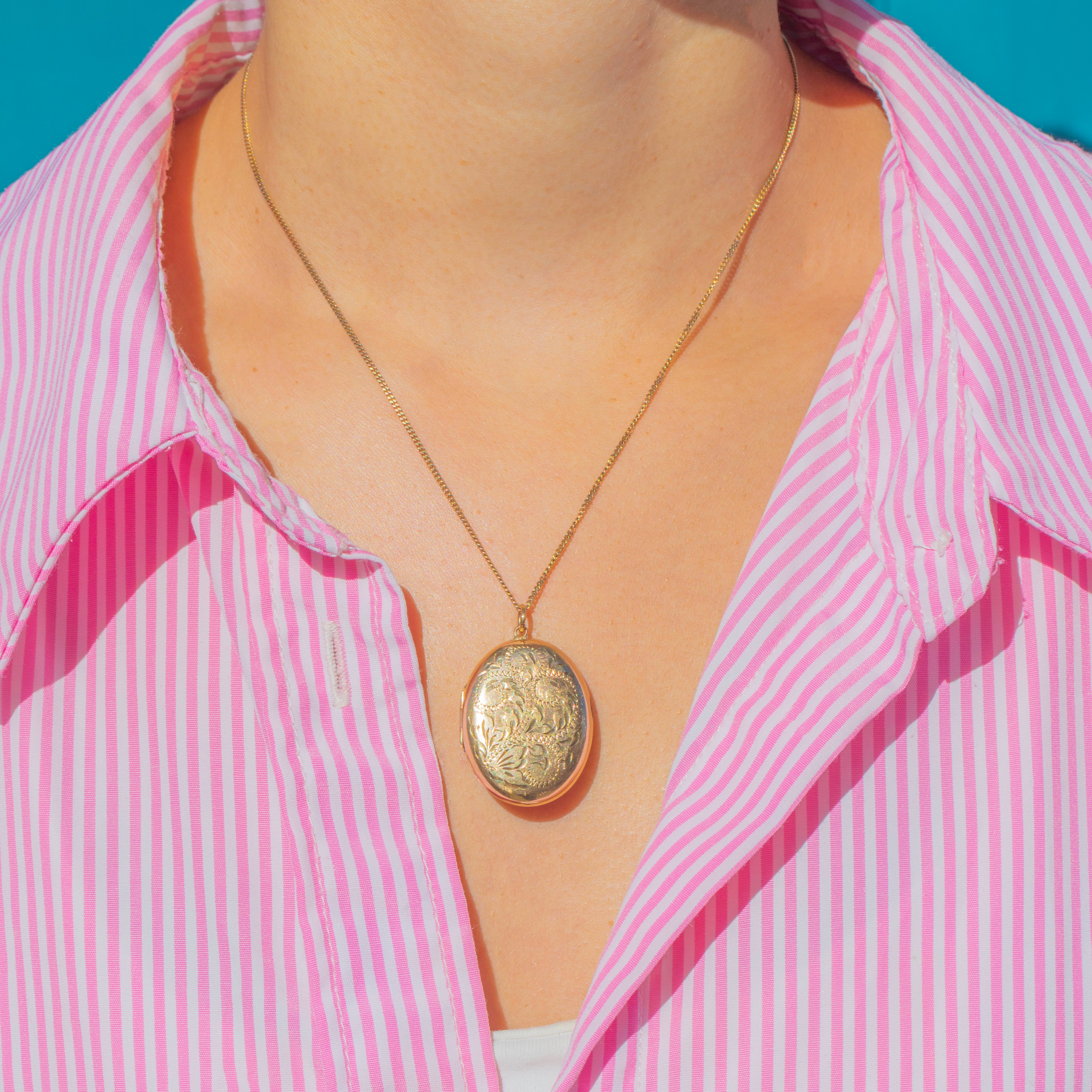 This Solid 9ct Gold oval locket is a beautifully crafted piece of Vintage jewellery, hallmarked for Birmingham 1975. Both sides are adorned with immaculate hand-engraved detail, showcasing delicate patterns that shimmer as they catch the light. The engravings are crisp and intricate, adding depth and texture to the warm glow of the Gold.