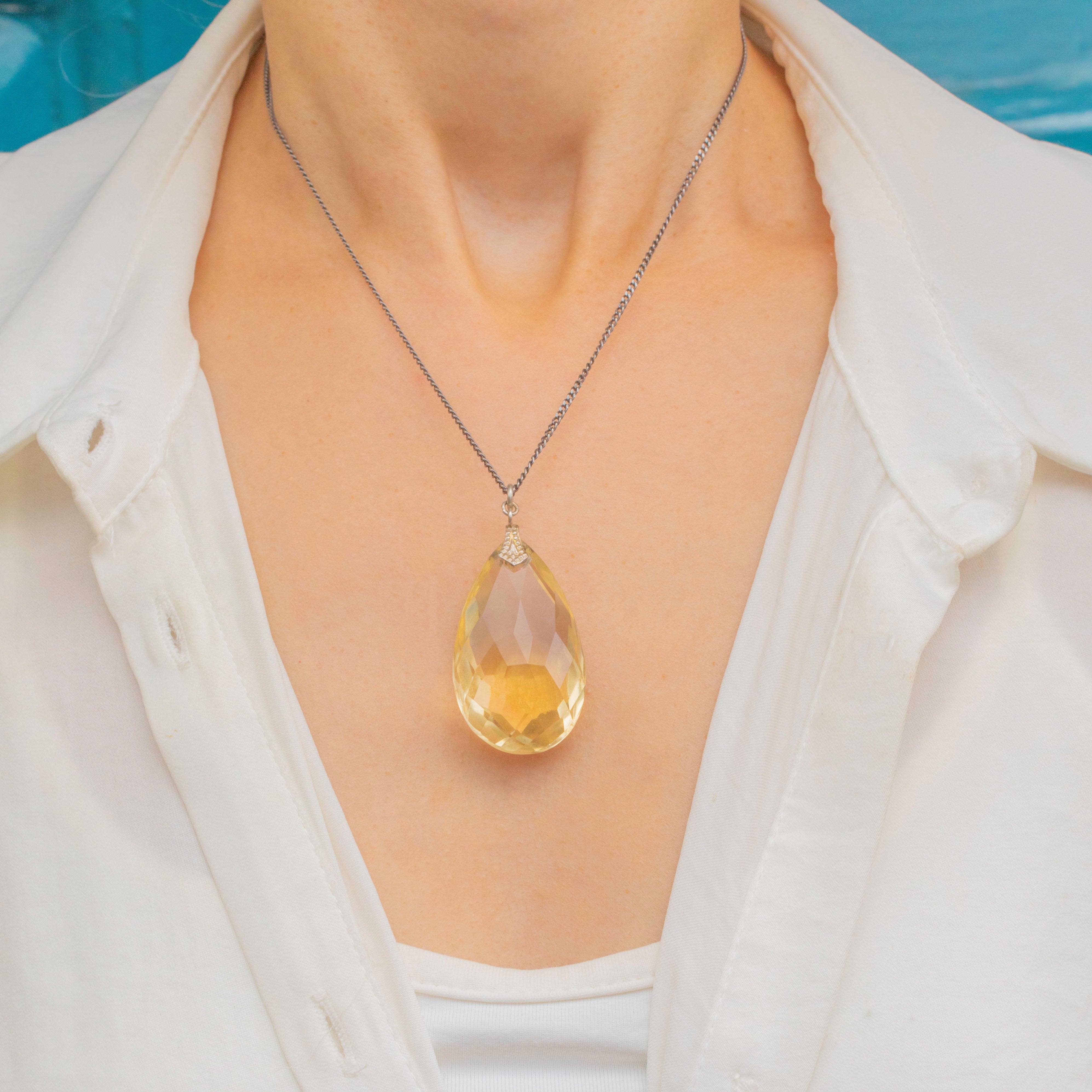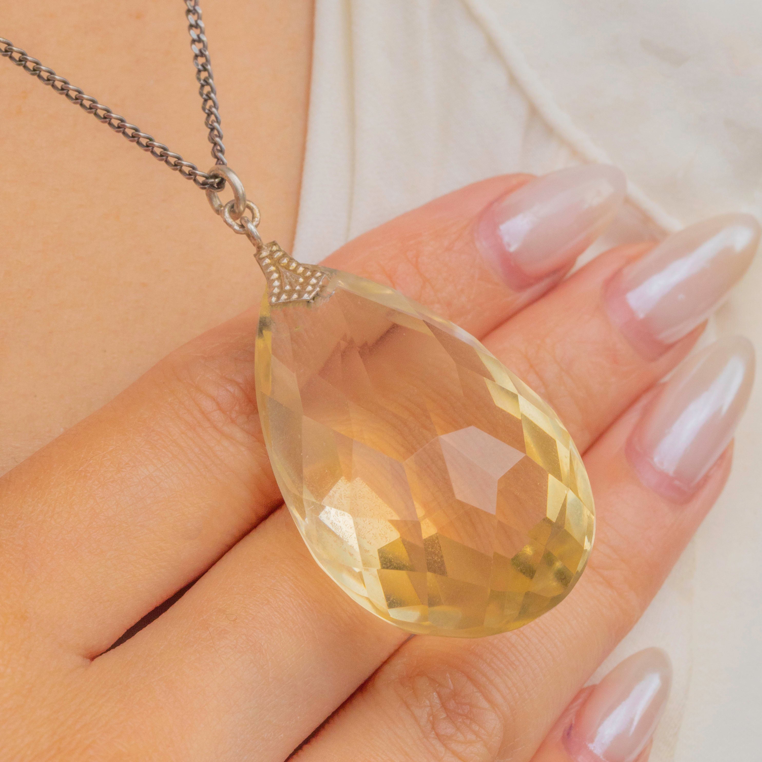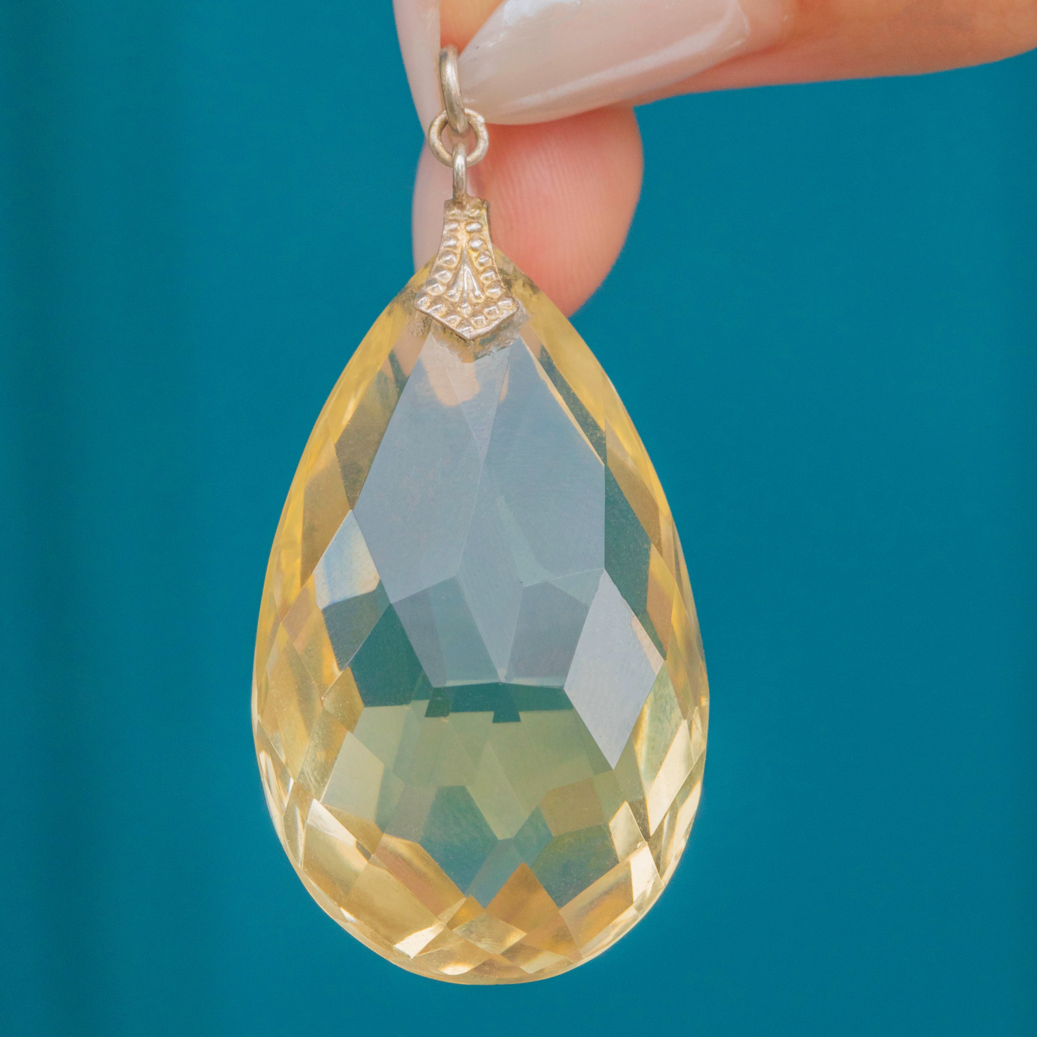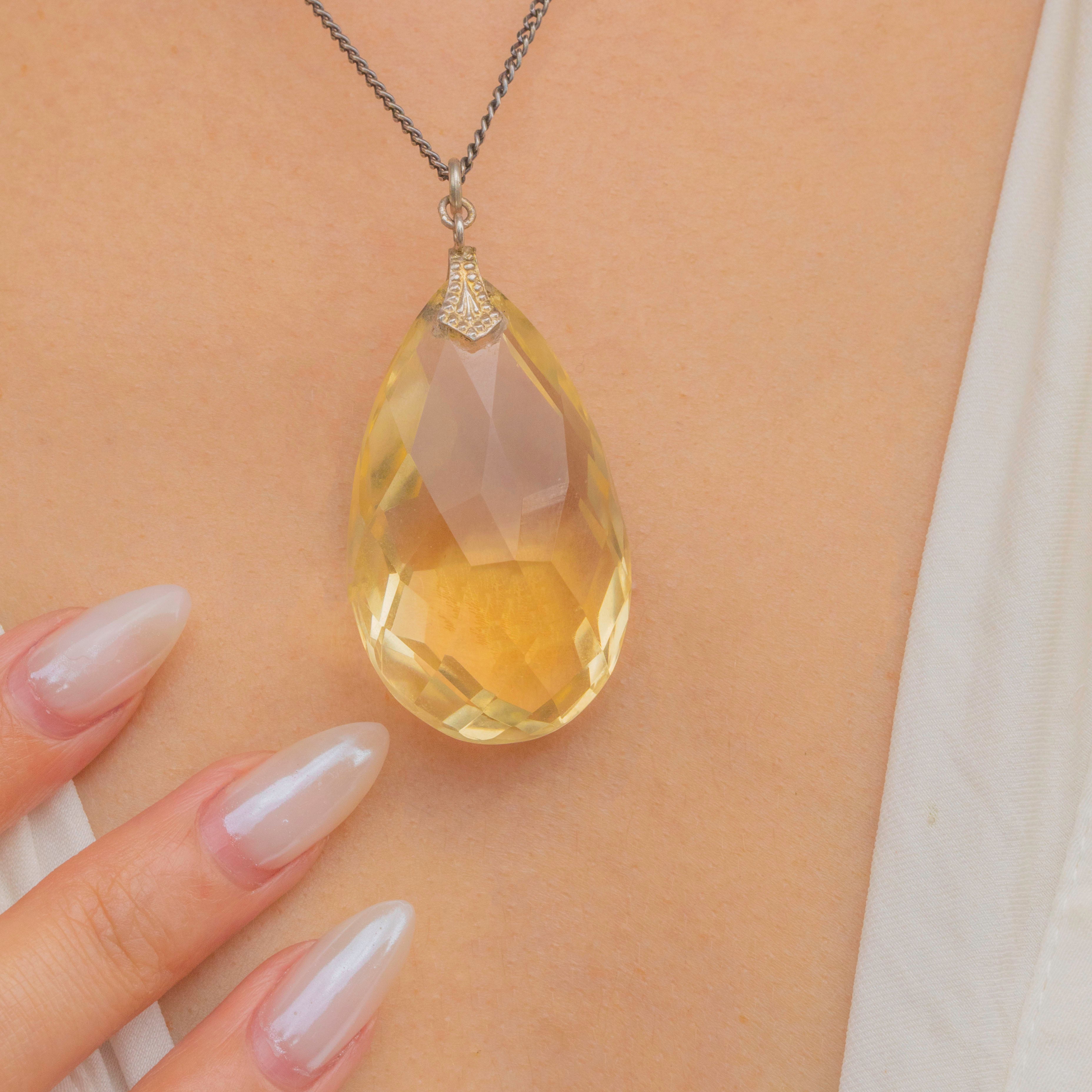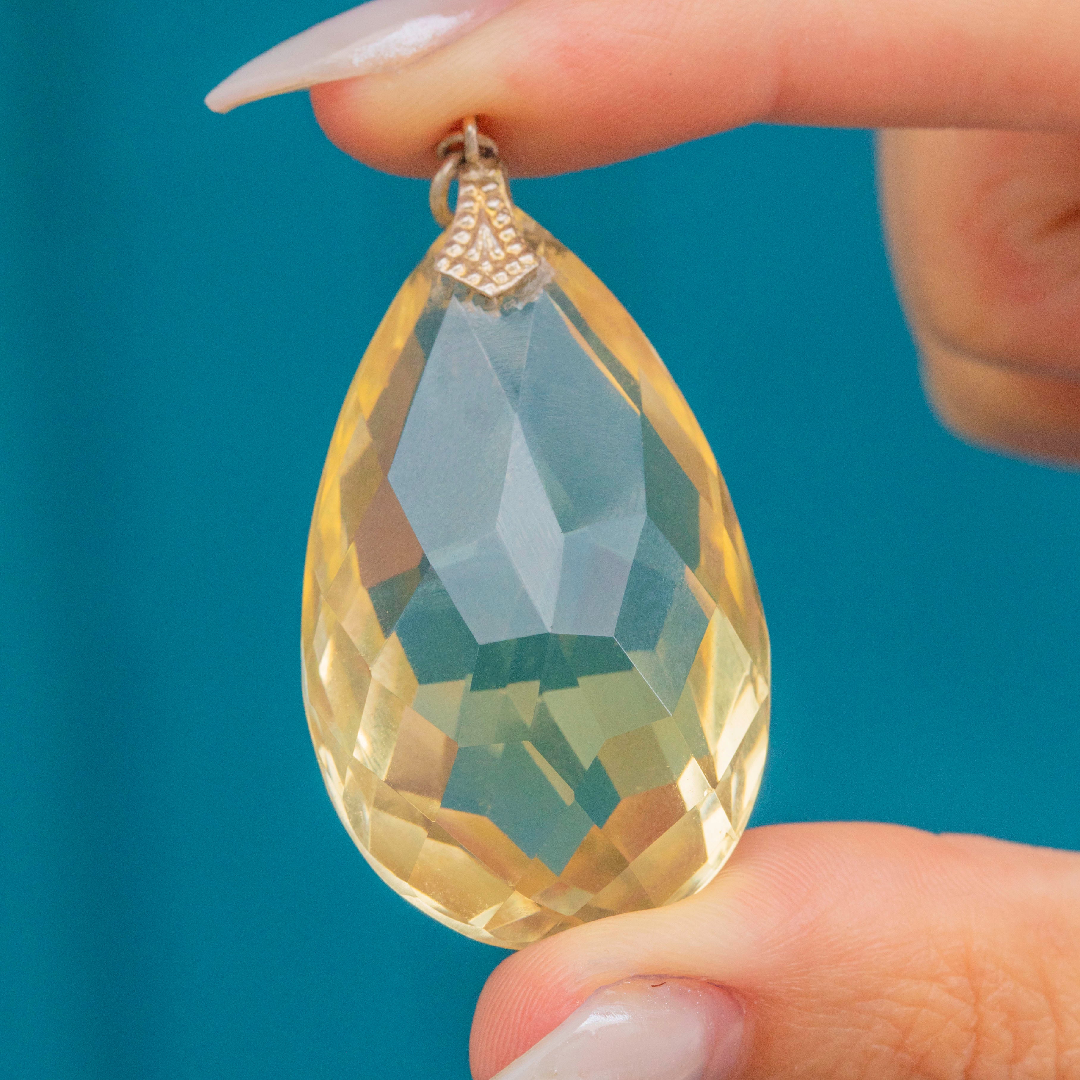 This vintage Citrine pendant boasts 63.17ct and will add a bright, glimmering accent to your décolletage! The pear-cut Citrine has been exquisitely faceted, radiating lemony hues as it moves in the light, suspended from an intricately formed bale, adding a decorative finish.